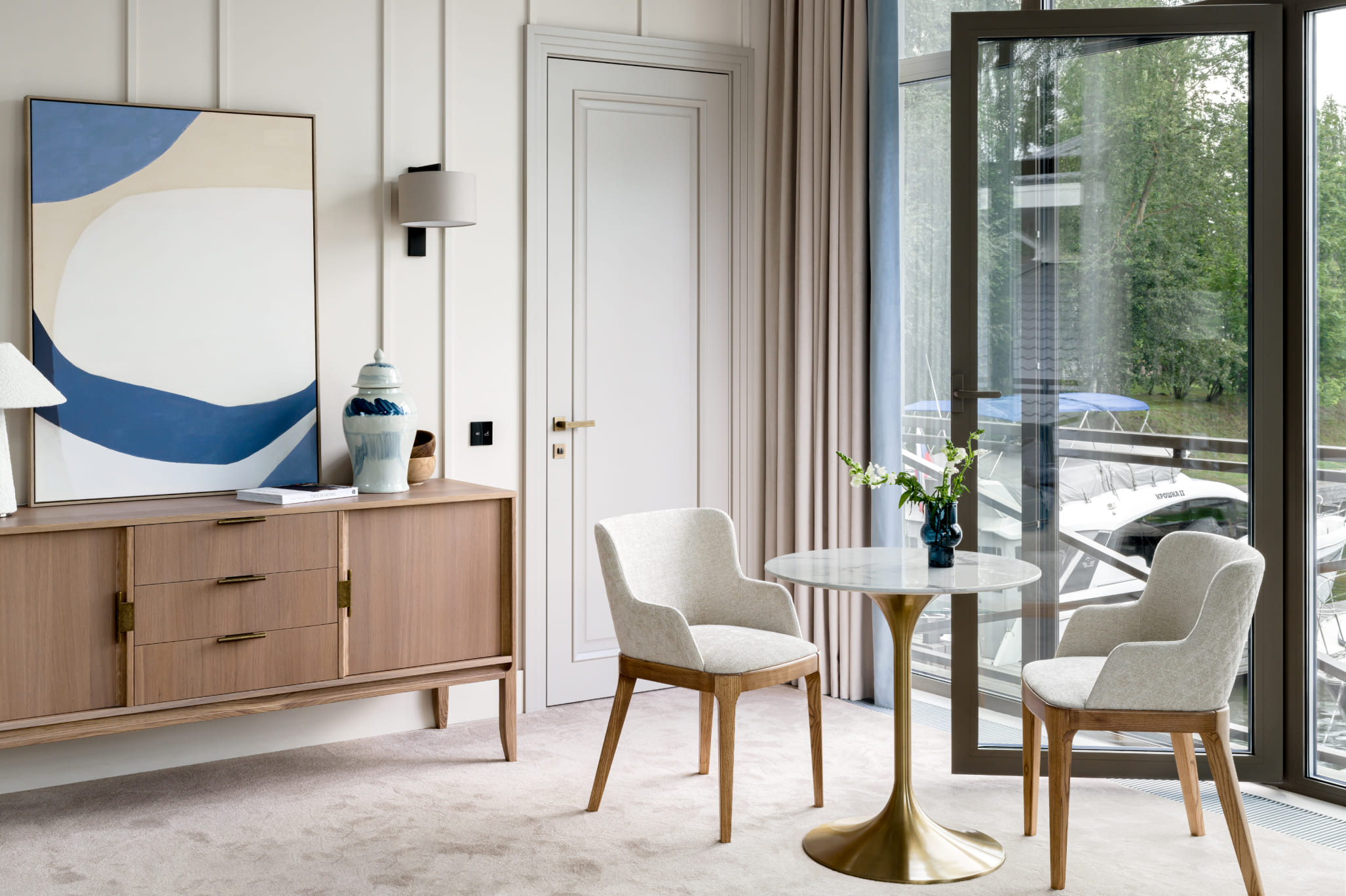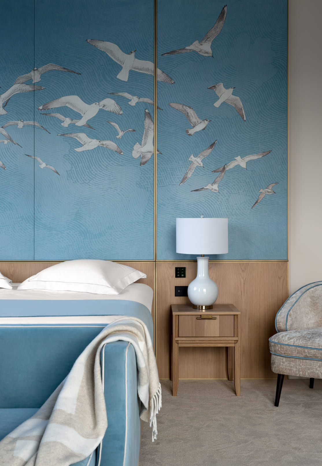 В одной из спален с видом на воду палитра строится на сочетании нейтральных светлых тонов, тёплой древесной отделки и небесно-голубого цвета: именно в нём выполнена стена с изображением чаек за изголовьем кровати. В визуальный диалог с ней вступает банкетка в бархатистой обивке похожего оттенка, а также постер с абстракцией и ваза в китайском стиле.