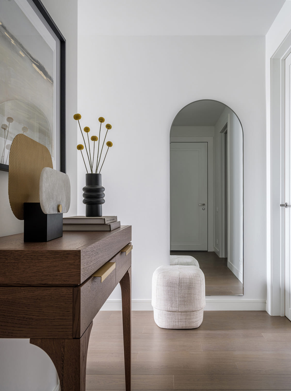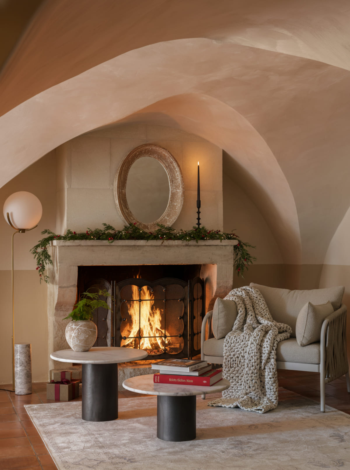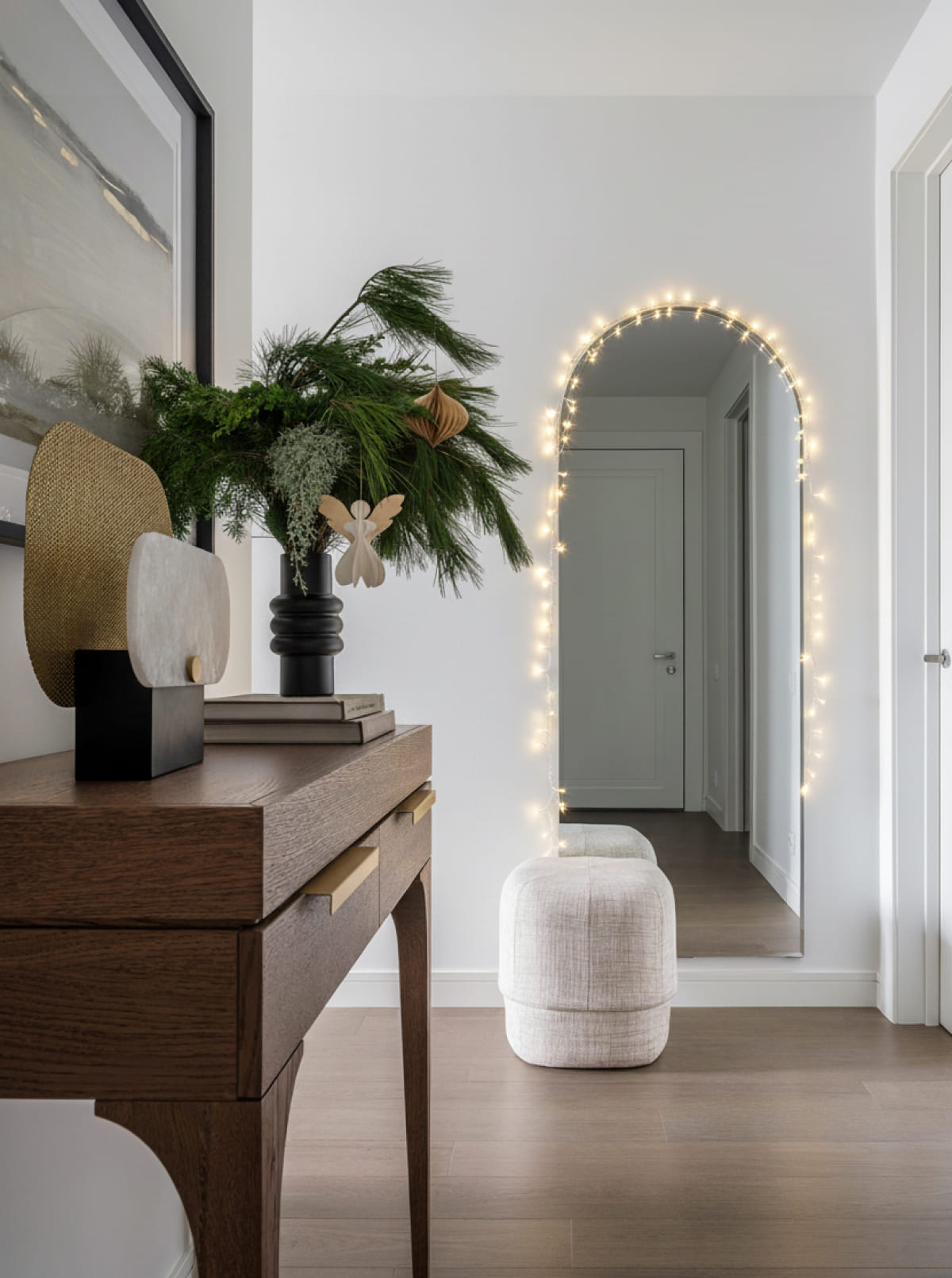 Первое впечатление задаёт тон всему вечеру. Превратите холл в волшебный портал. Поставьте аромадиффузоры или свечи с нотами хвои, гвоздики, корицы и мандарина, чтобы в воздухе витал аромат праздника. На консольный столик или комод поставьте композицию из еловых веток, палочек корицы и сушёных цитрусов.