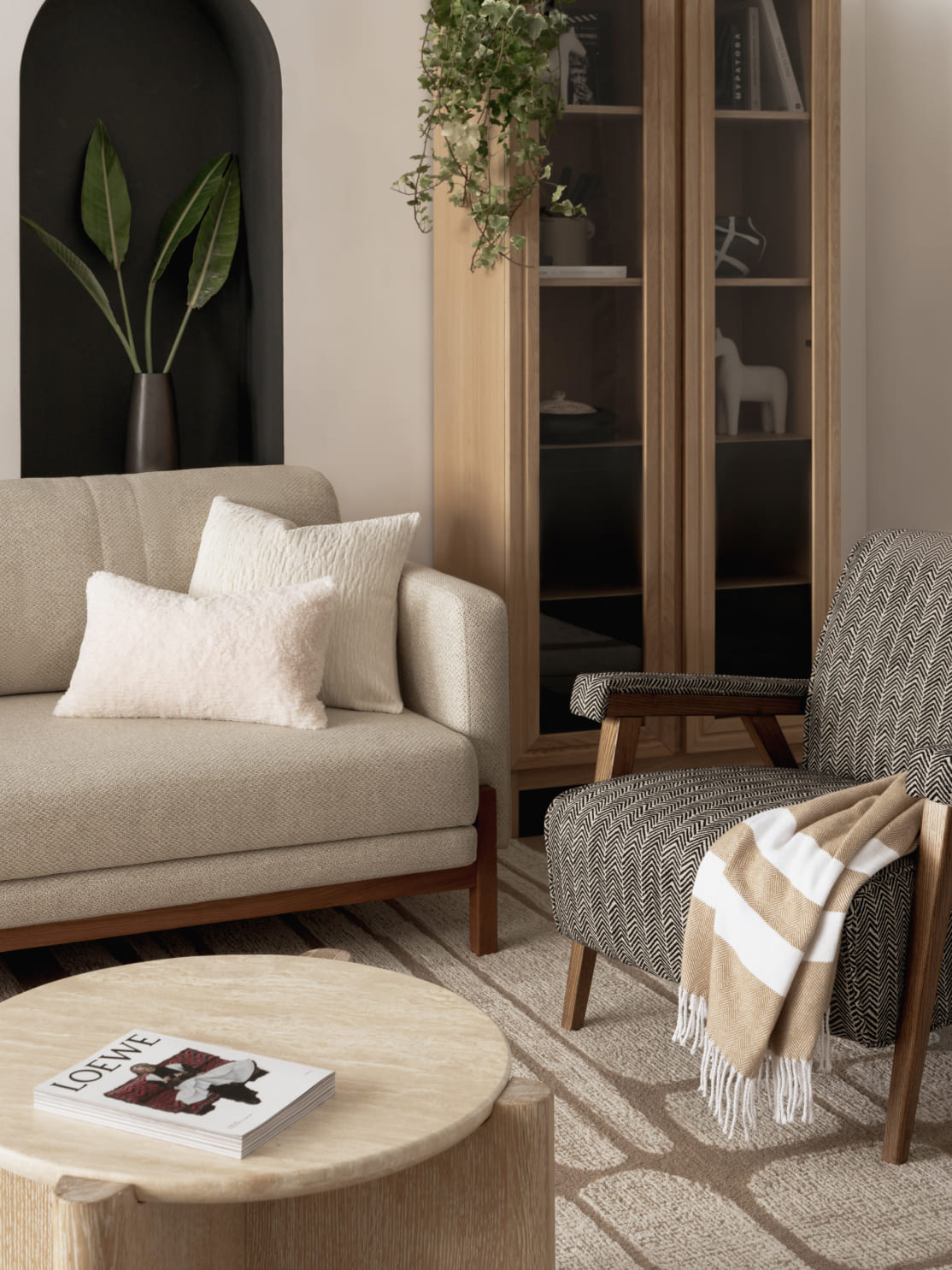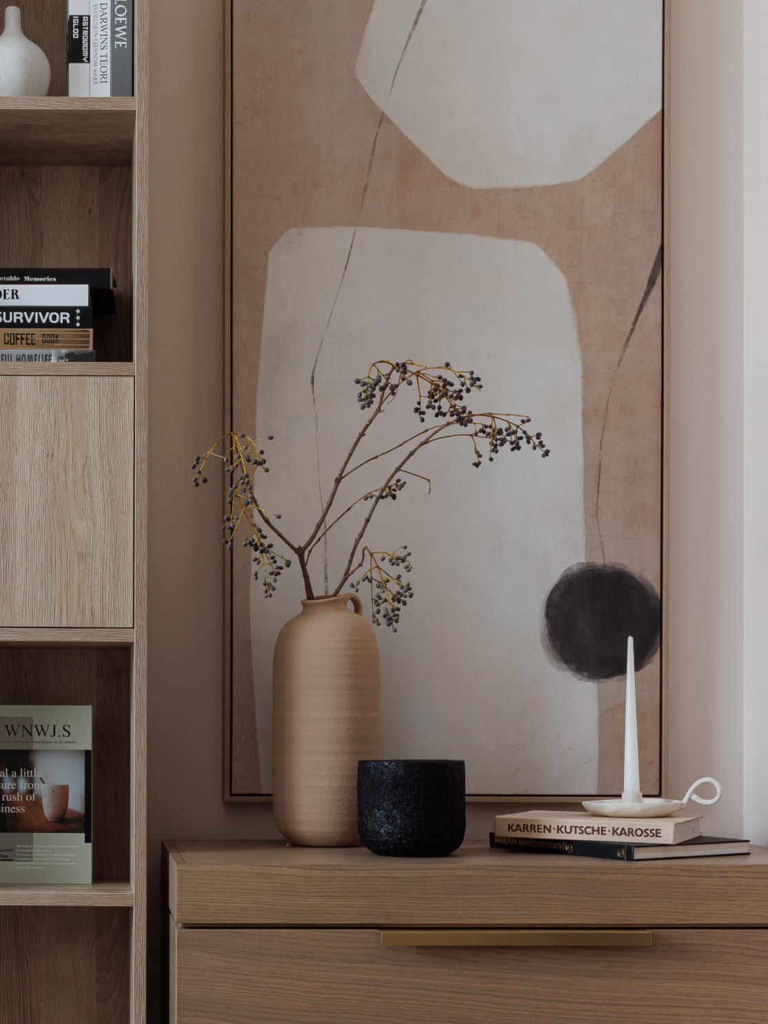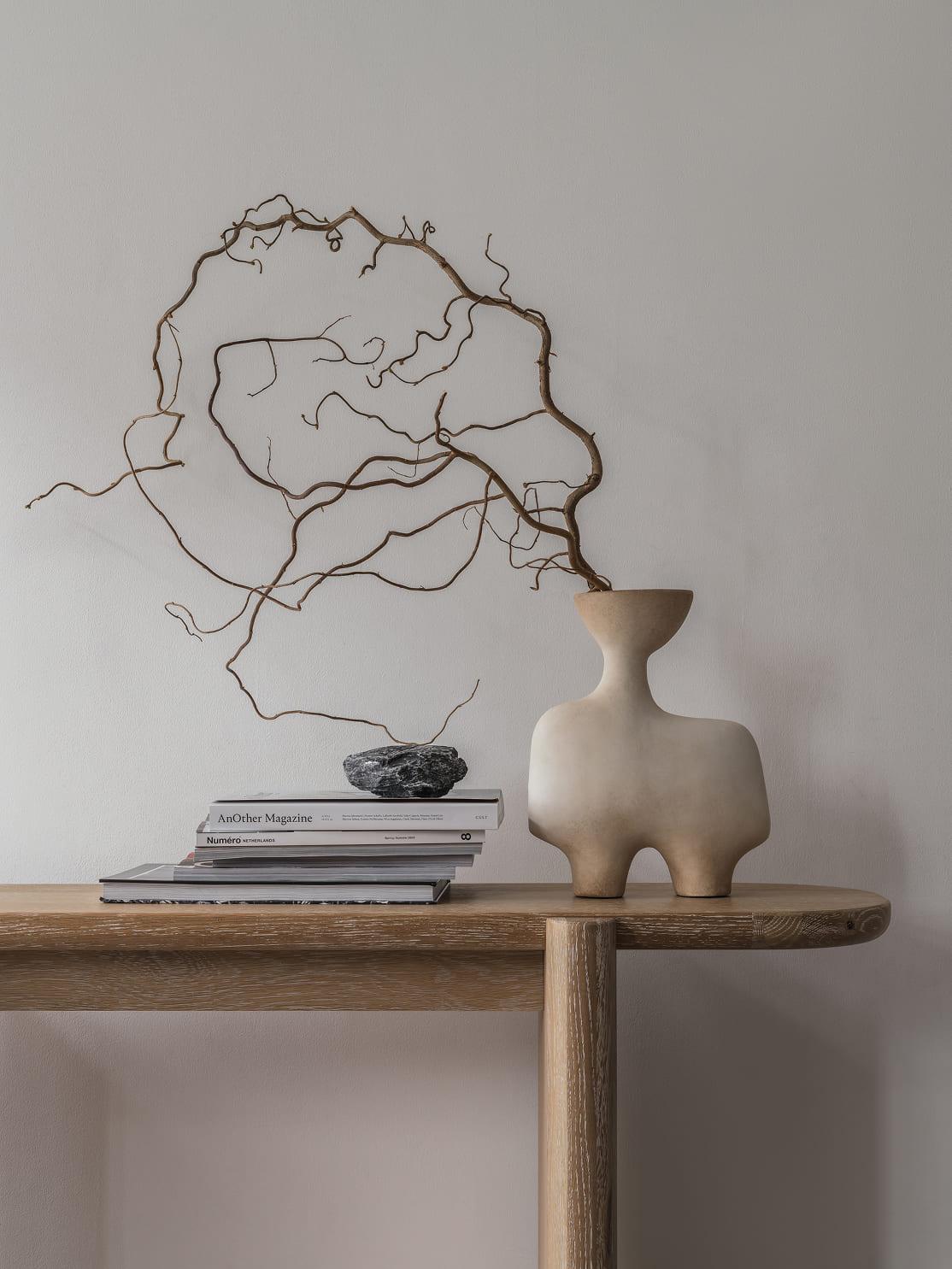 Ваза скульптурной формы и из тактильного материала, например, керамики — самодостаточный арт-объект. Поставьте в неё один стебель или сухоцвет — и получится изящная минималистичная композиция. А с сезонными композициями — от хвойных веток до осенних ягод — она станет инструментом для творчества и смены настроения в доме.
