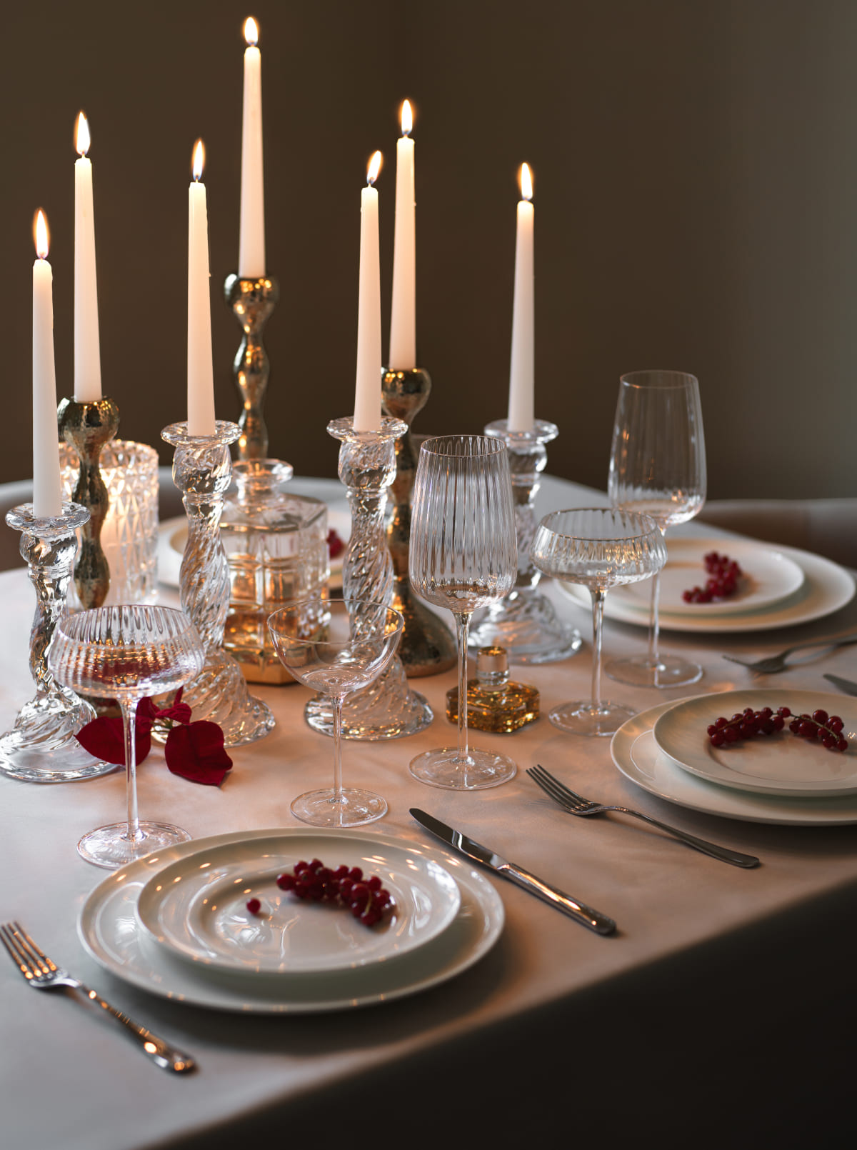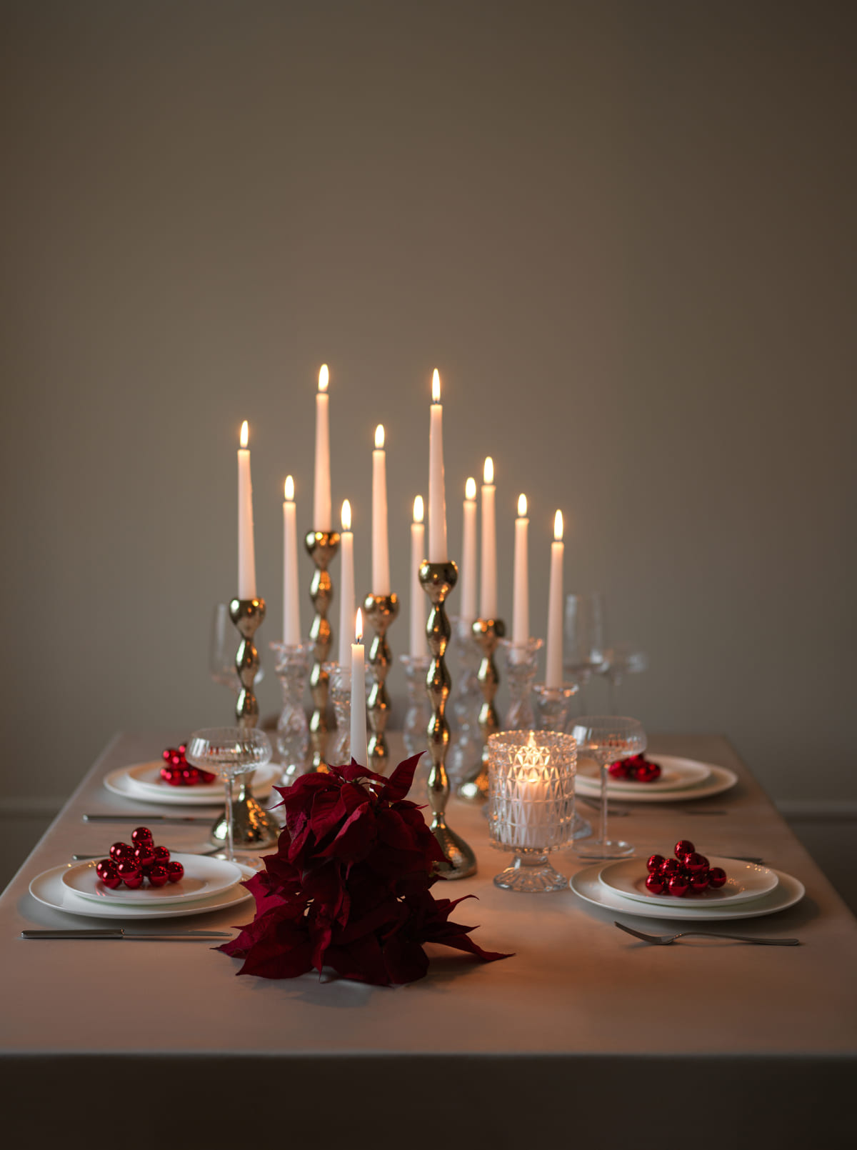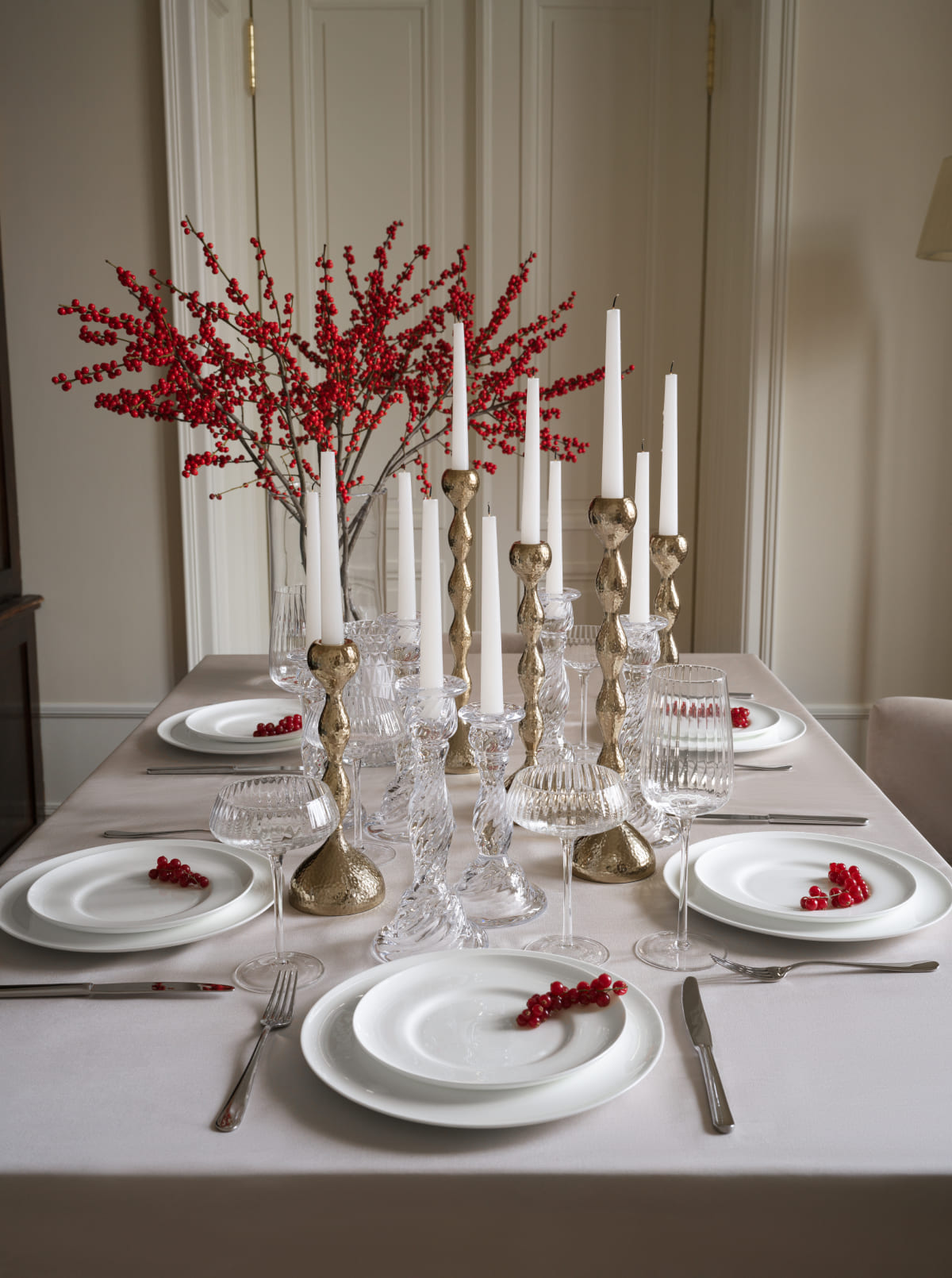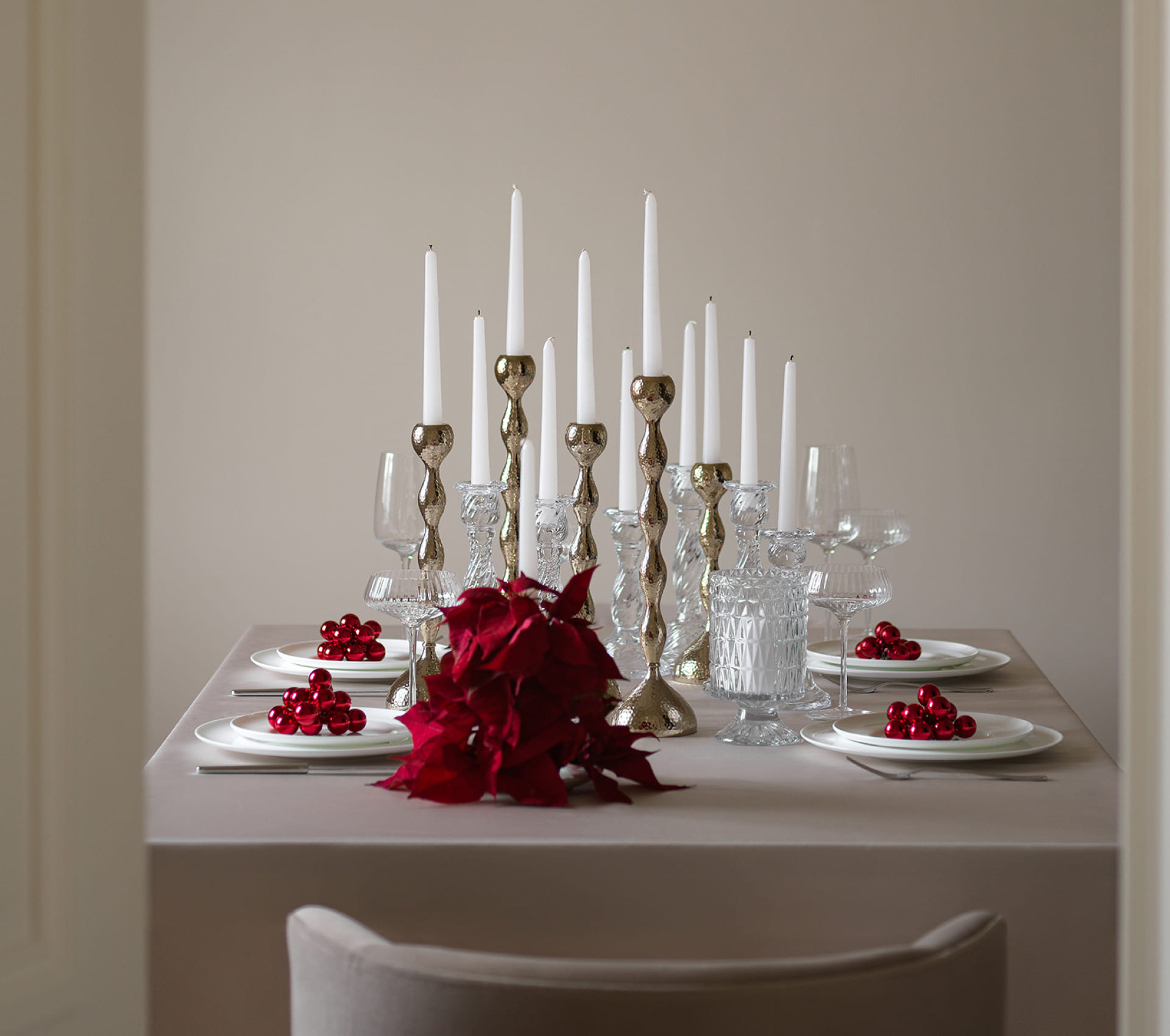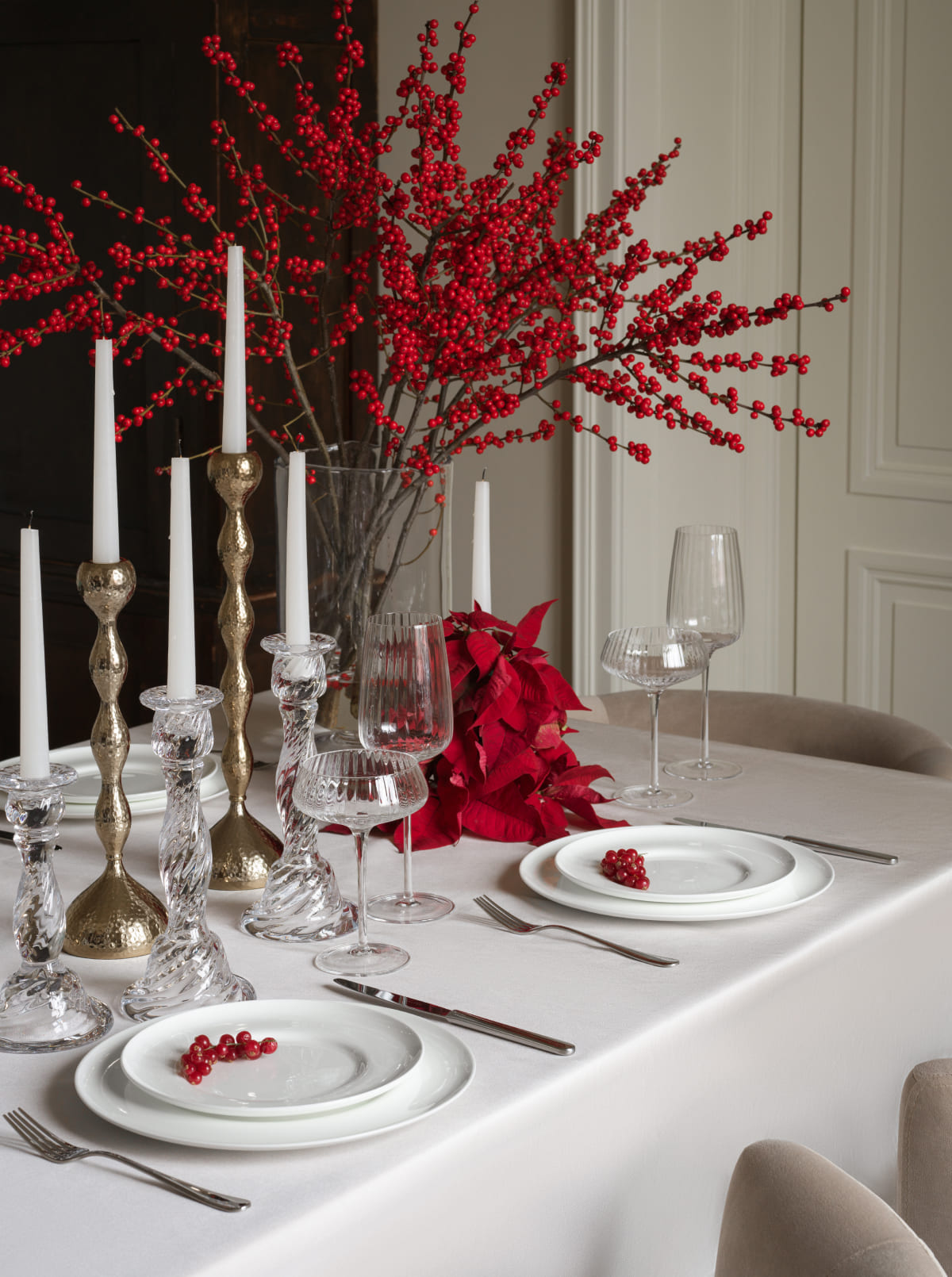 Когда хочется устроить пышный праздник, помогают вещи, которым мы доверяем годами: белая скатерть, тонкий фарфор, искрящийся хрусталь и тёплый свет свечей. Золотые акценты добавляют нарядности, а оживить классическую палитру помогает красный — например, в виде пуансеттии, которая снова возвращается в новогодние тренды.
