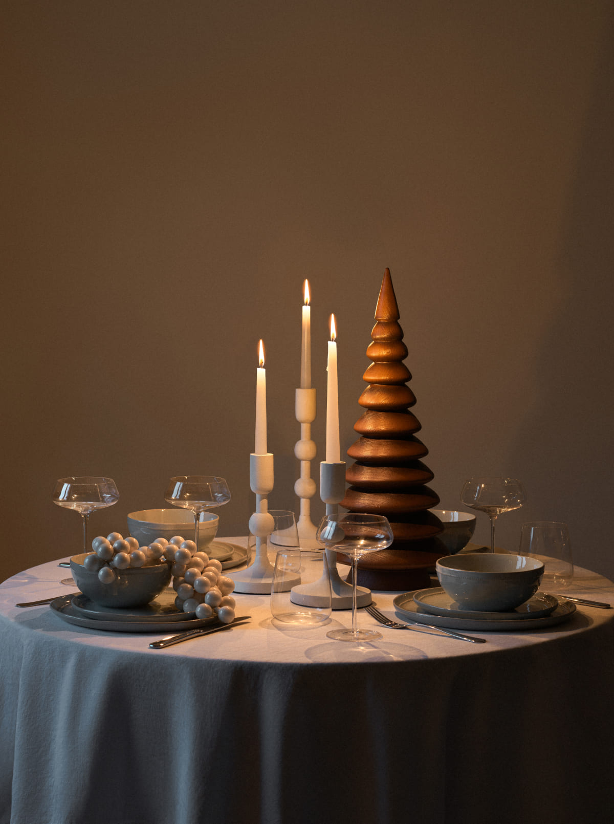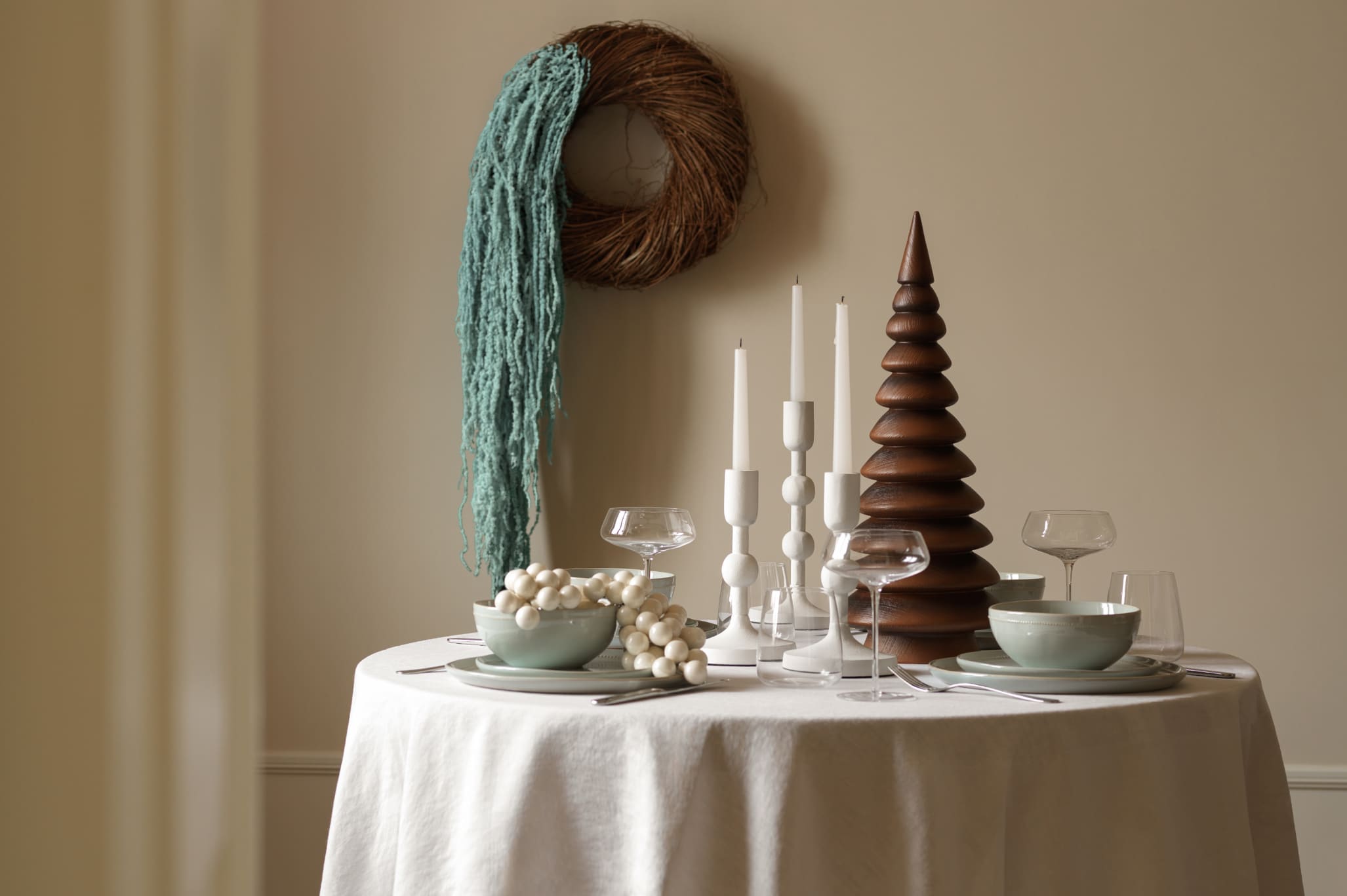 Если вам ближе спокойствие, натуральность и лёгкость, стоит обратиться к скандинавской эстетике. Дерево, венок, нежный оттенок амаранта и изумрудная посуда создают ощущение зимней сказки. Поиграйте с формами: поставьте бокалы-креманки и декоративные мини-шарики, заполняющие одну из пиал. Из них можно создавать любые фигурки для украшения стола и блюд. Визуально они перекликаются с элементами в основании подсвечников.