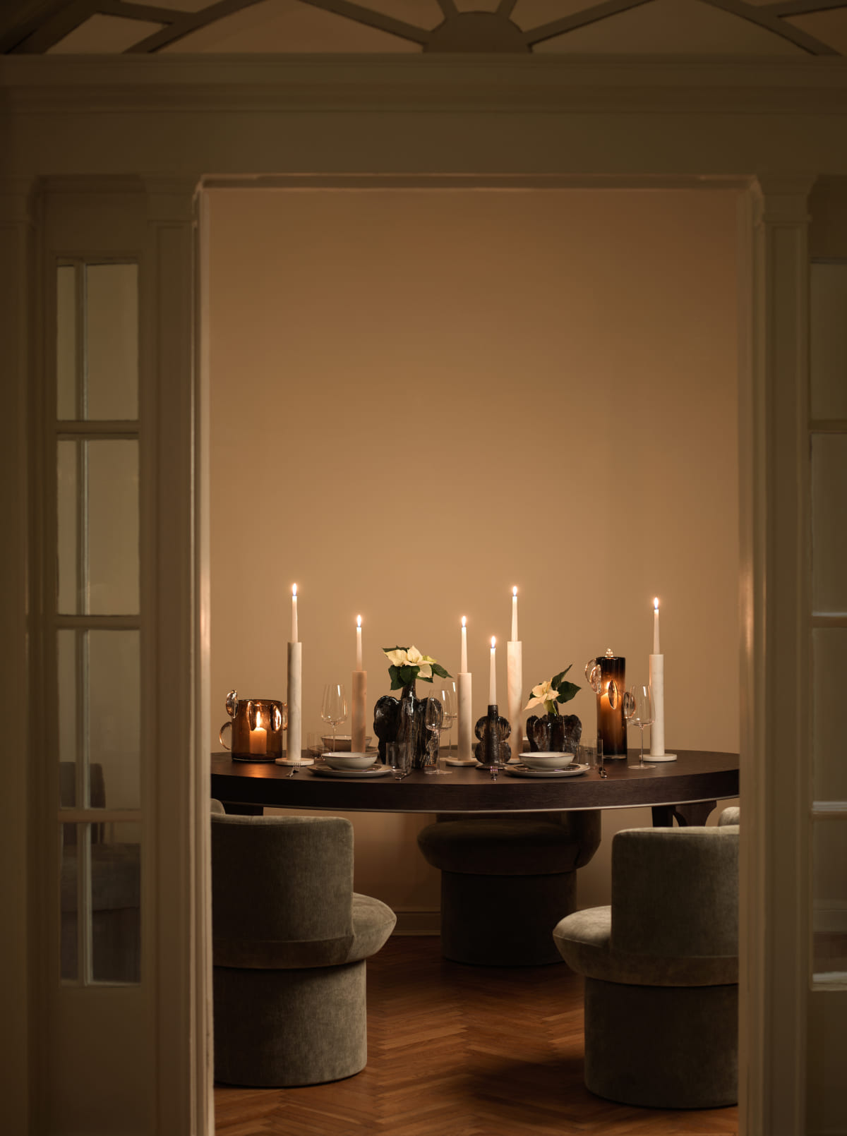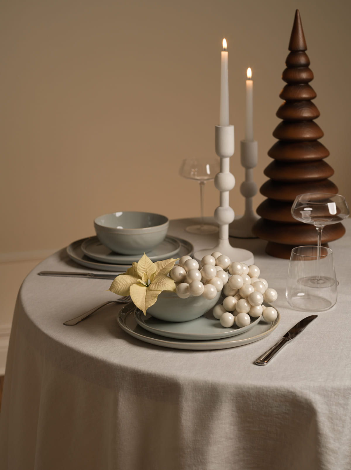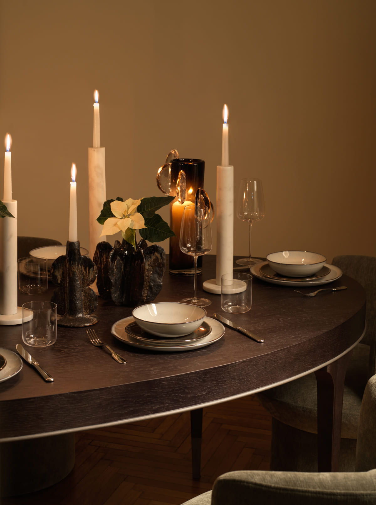Когда праздник — это тёплый вечер с родными или близкими друзьями, с которыми так много общих воспоминаний, комфорт и чувство единения особенно важны. Овальный стол, удобные стулья, обитые тканью в оттенке шалфея, обыгрывают идею равноправия и создают непринуждённую обстановку, располагающую к приятным моментам. Мраморные подсвечники, вазы из цветного стекла, керамическая посуда и пуансеттия молочного оттенка добавляют нежности.