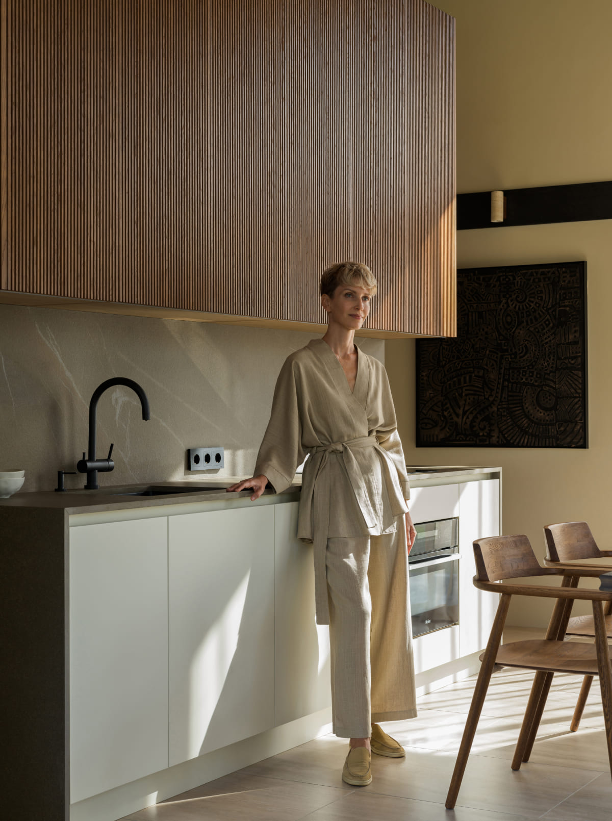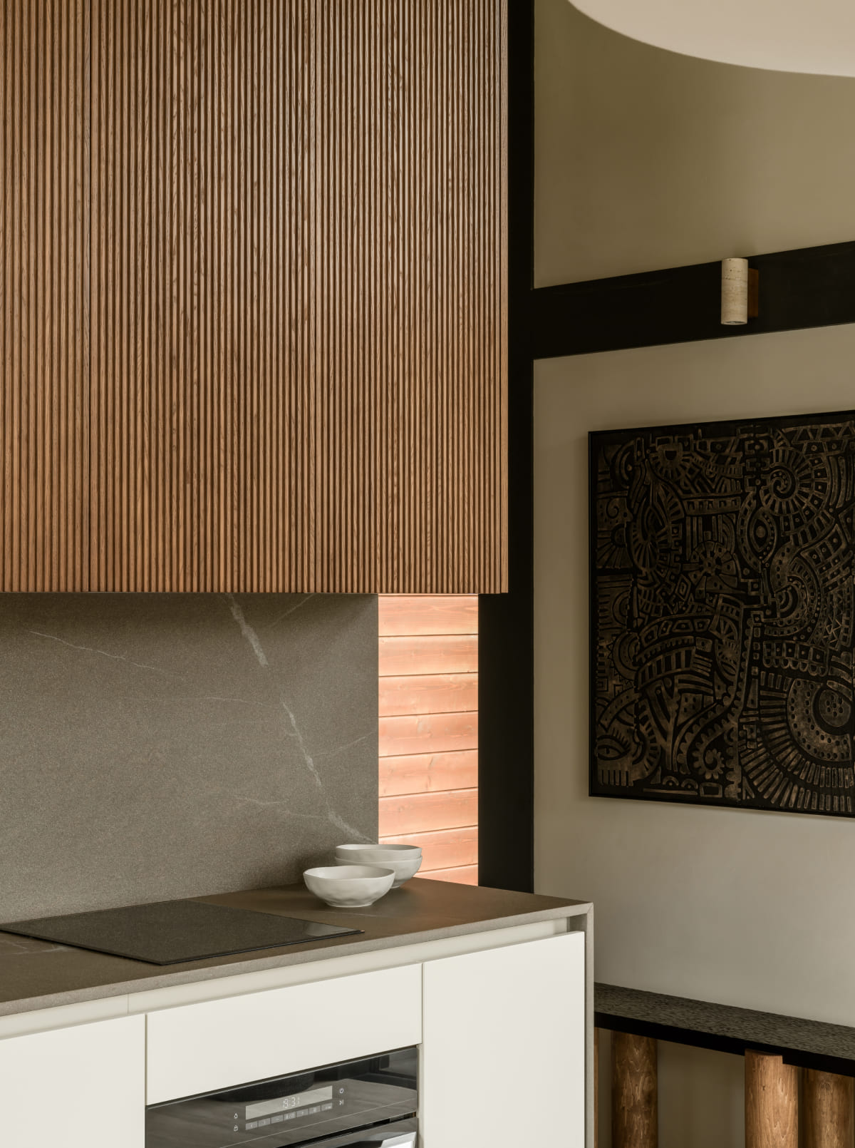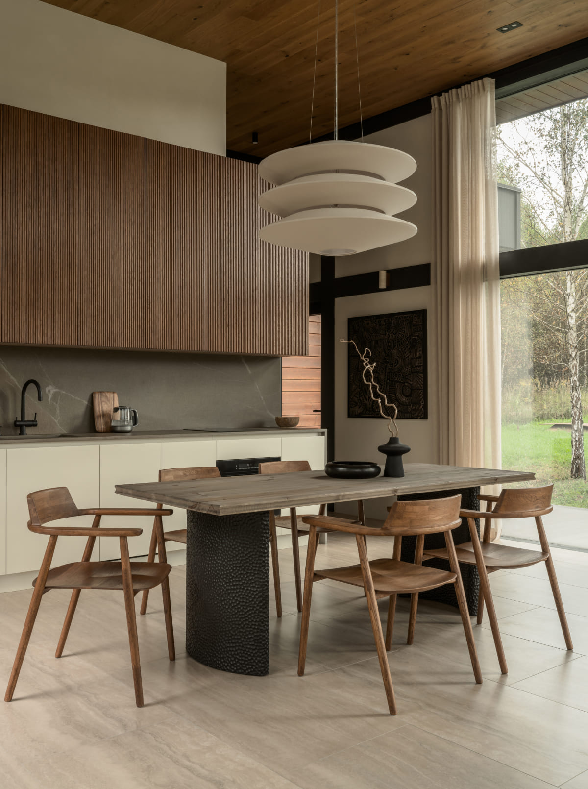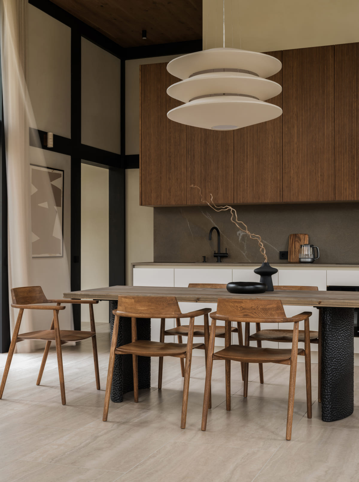 Это локация, где по-настоящему чувствуется контраст материалов: тёплый рифлёный шпон на фасадах, прохладная керамика столешницы, изящные стулья и массивный обеденный стол Volcano с ножками, фактурой напоминающими вулканический камень. Воздушности добавляют подвесной светильник, похожий на японский фонарик, и солнечные лучи, оставляющие на поверхностях причудливые узоры.