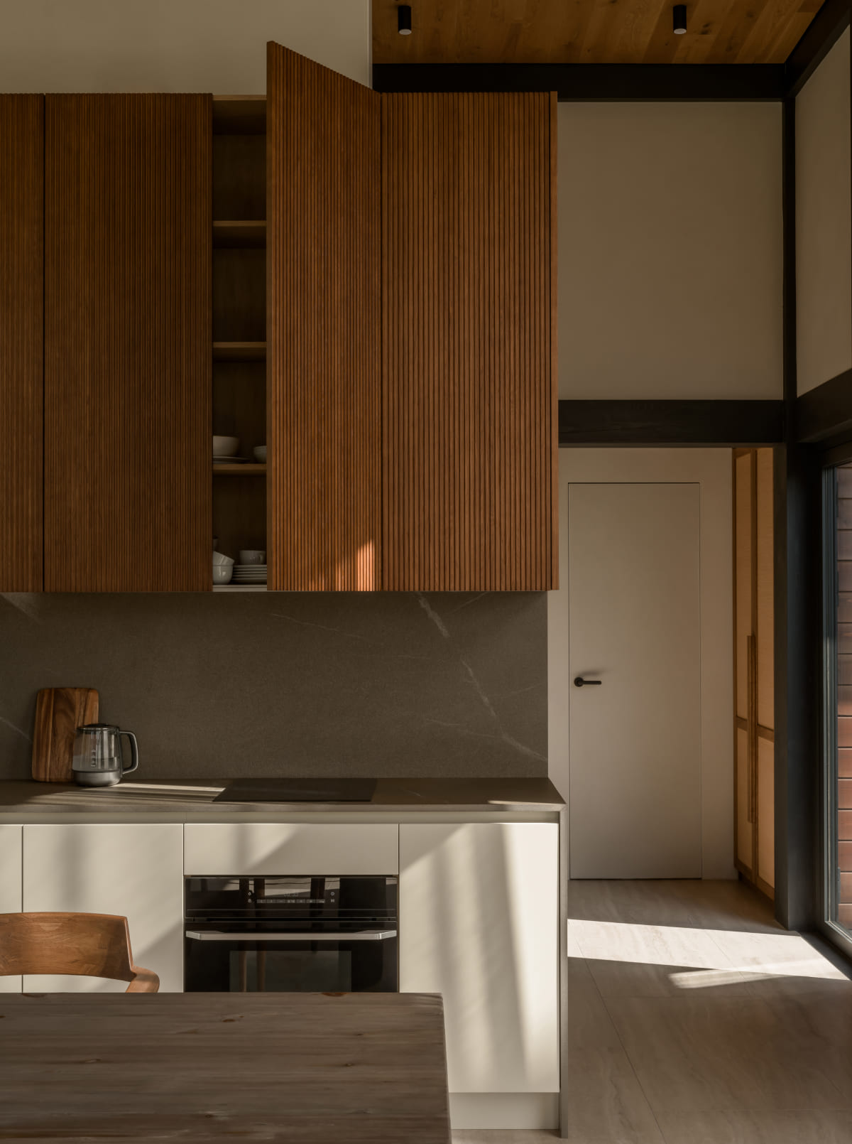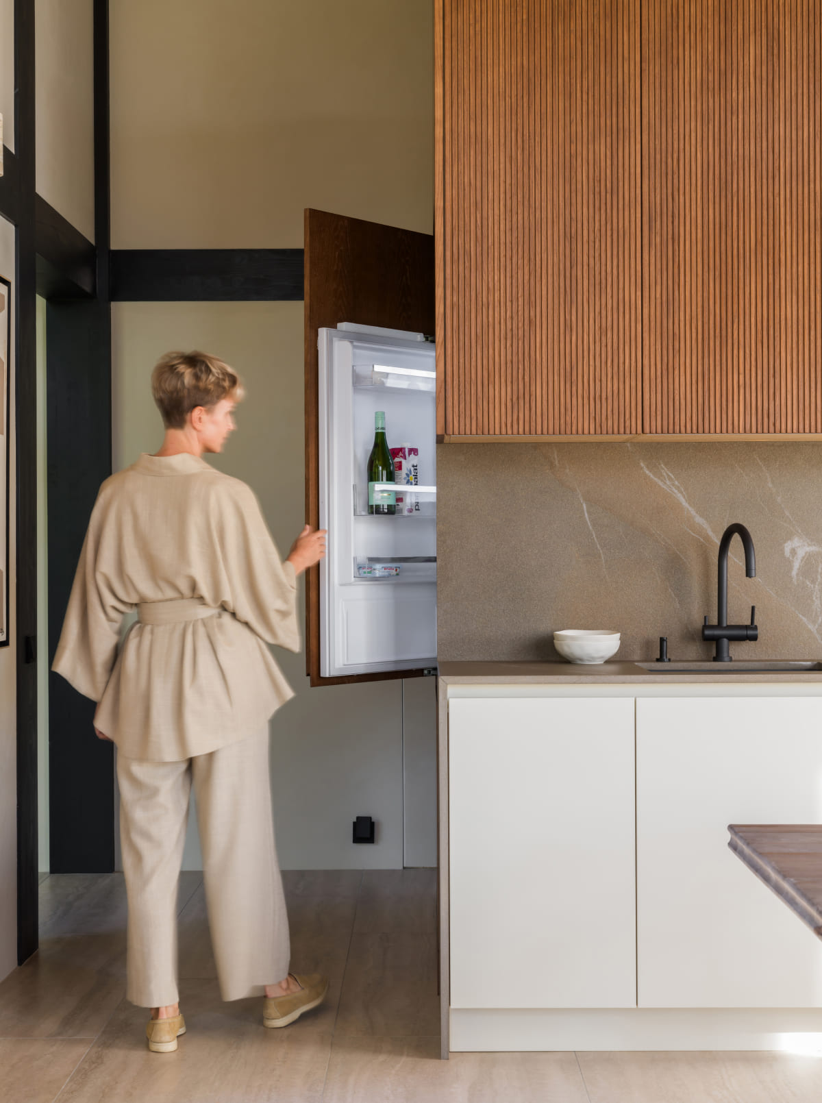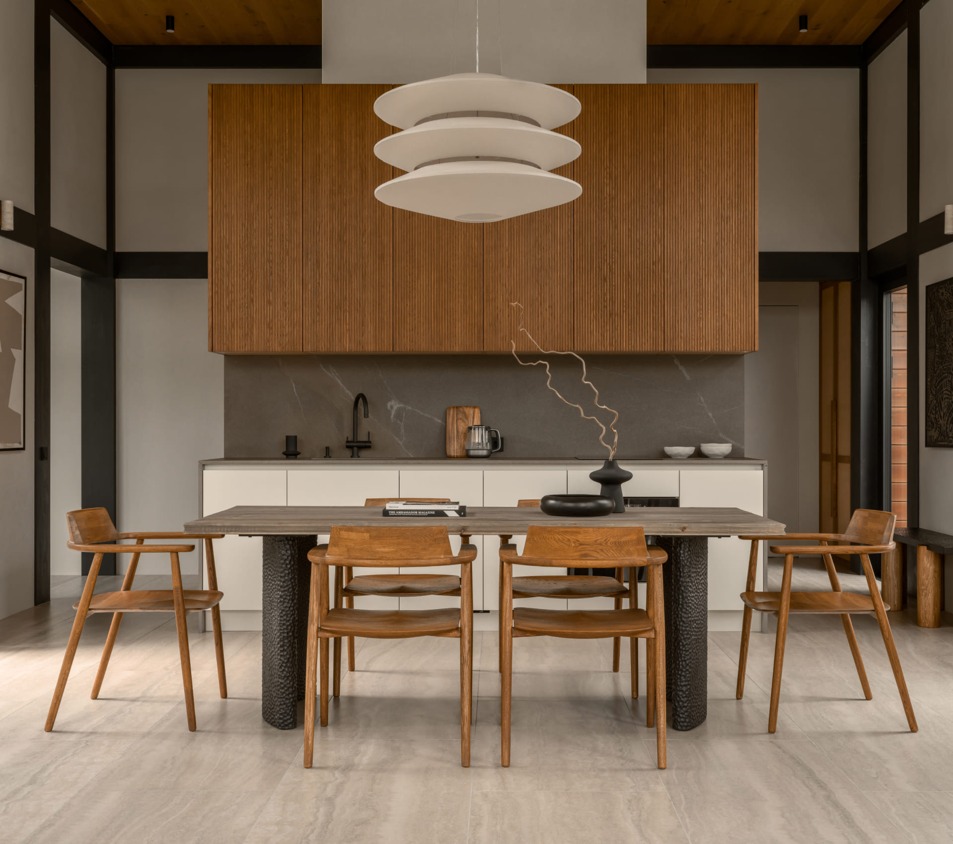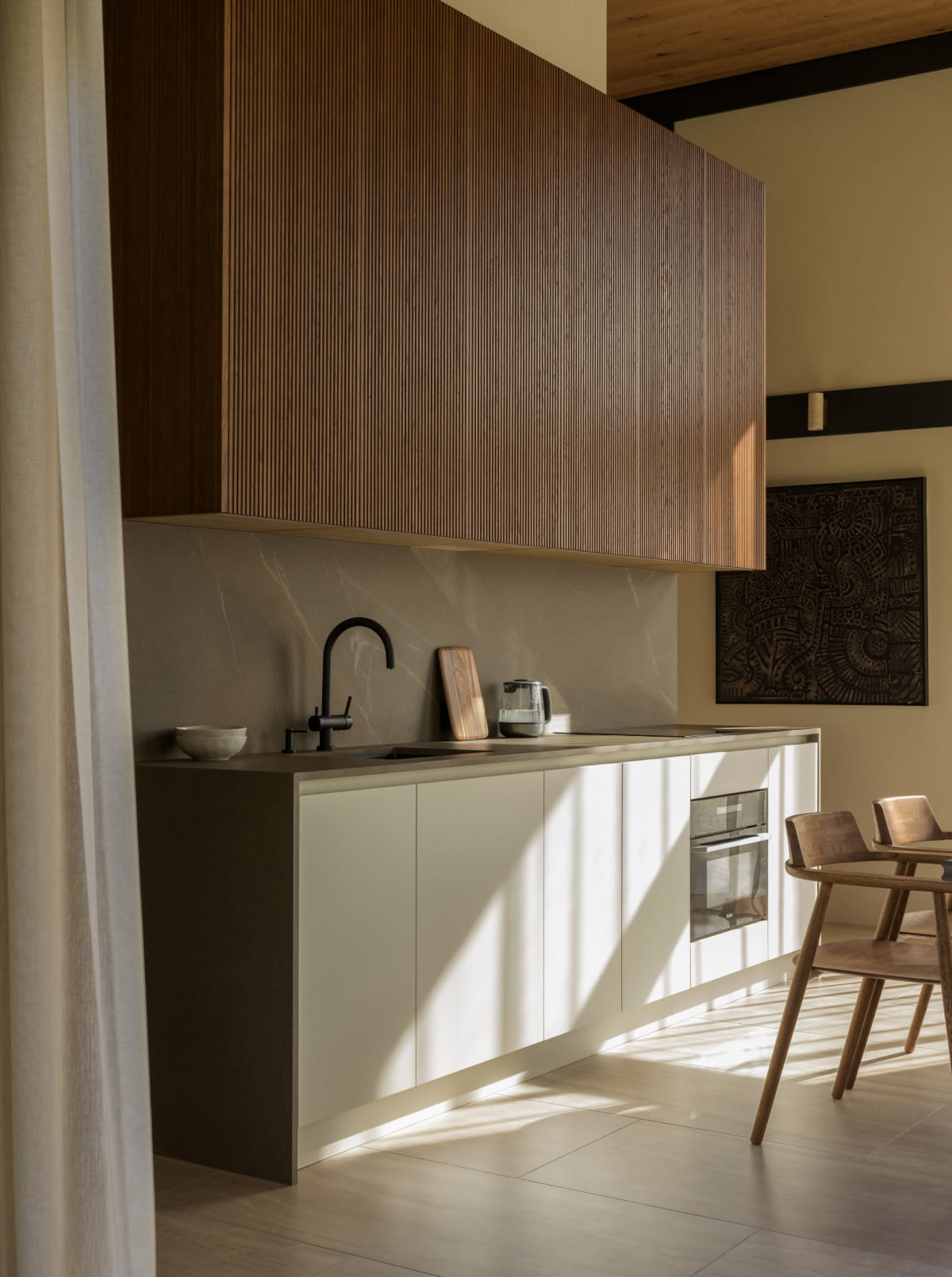 Это локация, где по-настоящему чувствуется контраст материалов: тёплый рифлёный шпон на фасадах, прохладная керамика столешницы, изящные стулья и массивный обеденный стол Volcano с ножками, фактурой напоминающими вулканический камень. Воздушности добавляют подвесной светильник, похожий на японский фонарик, и солнечные лучи, оставляющие на поверхностях причудливые узоры.