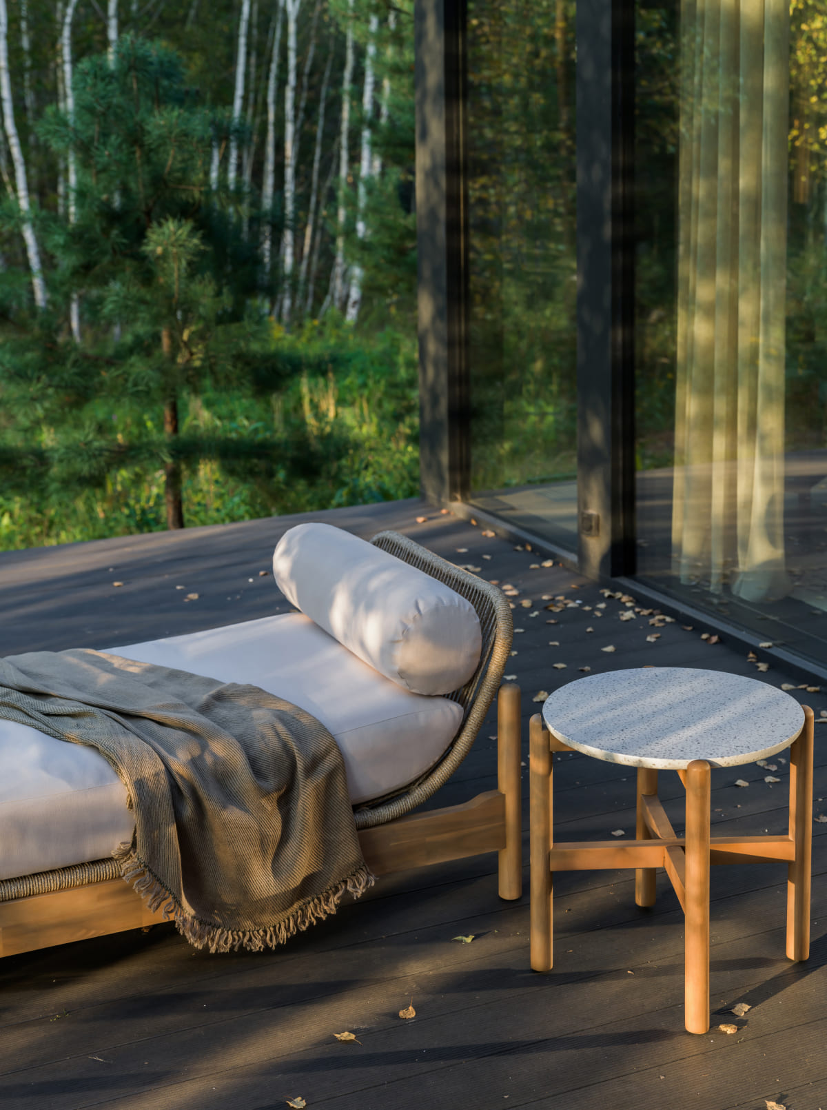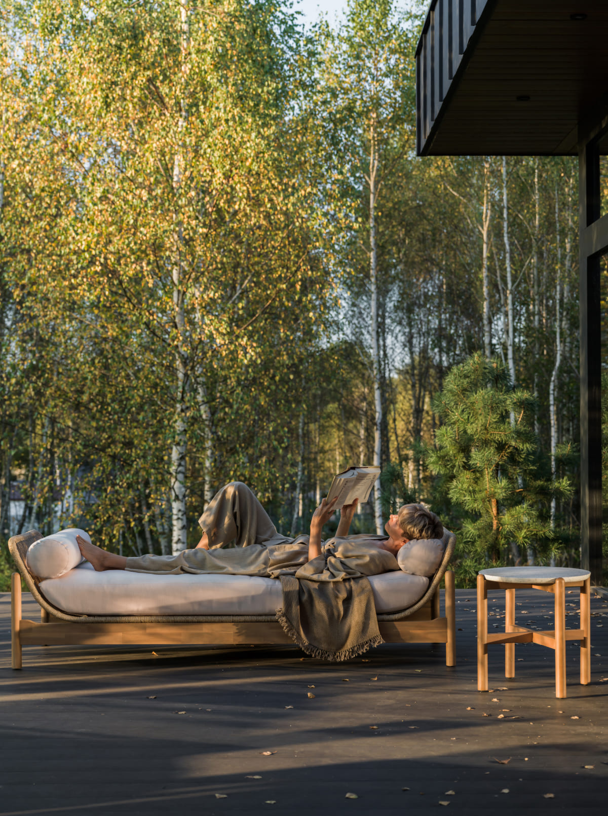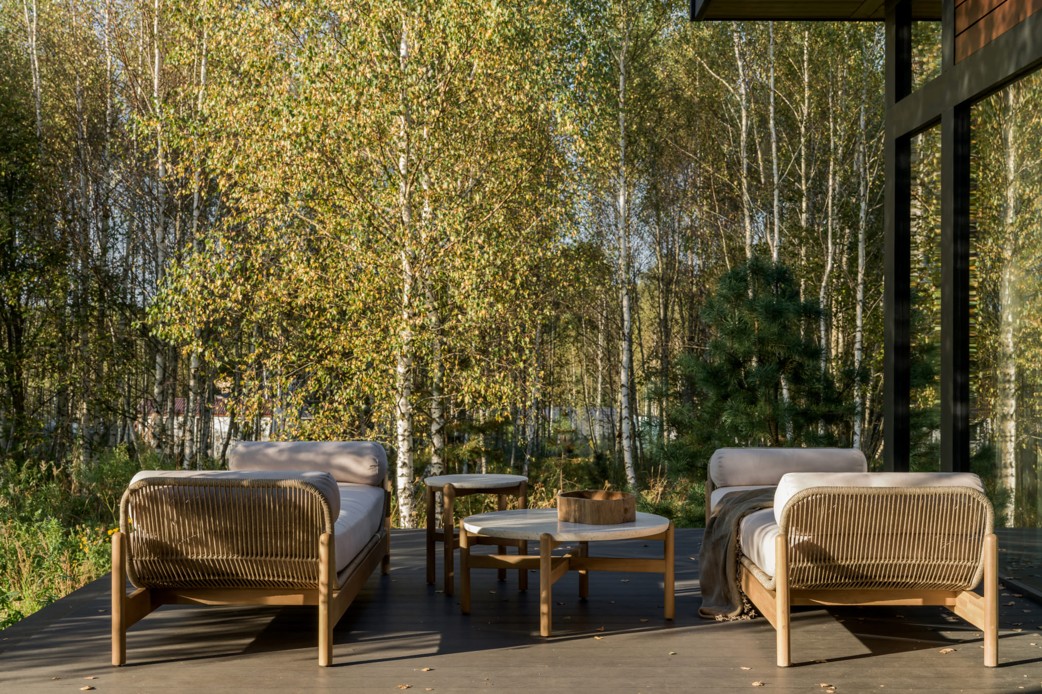 Вторая терраса предназначена для расслабленного отдыха в окружении берёз. Особенно удобной её делают два шезлонга Tulum: своей симметрией и плавными очертаниями они напоминают качели, но вместо мерного покачивания дарят состояние глубокого покоя.