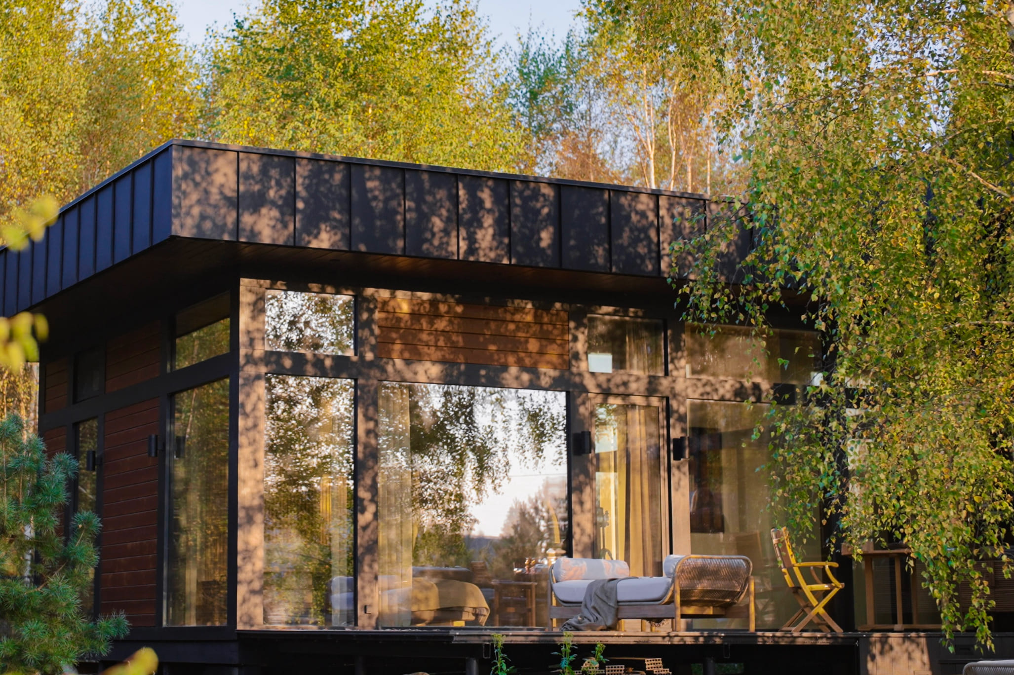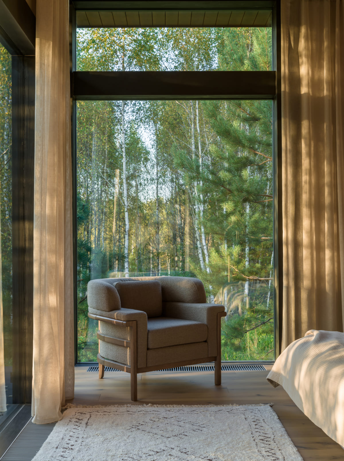 Благодаря панорамному остеклению из каждого уголка дома открываются лесные виды, которые становятся живыми картинами в любое время года.