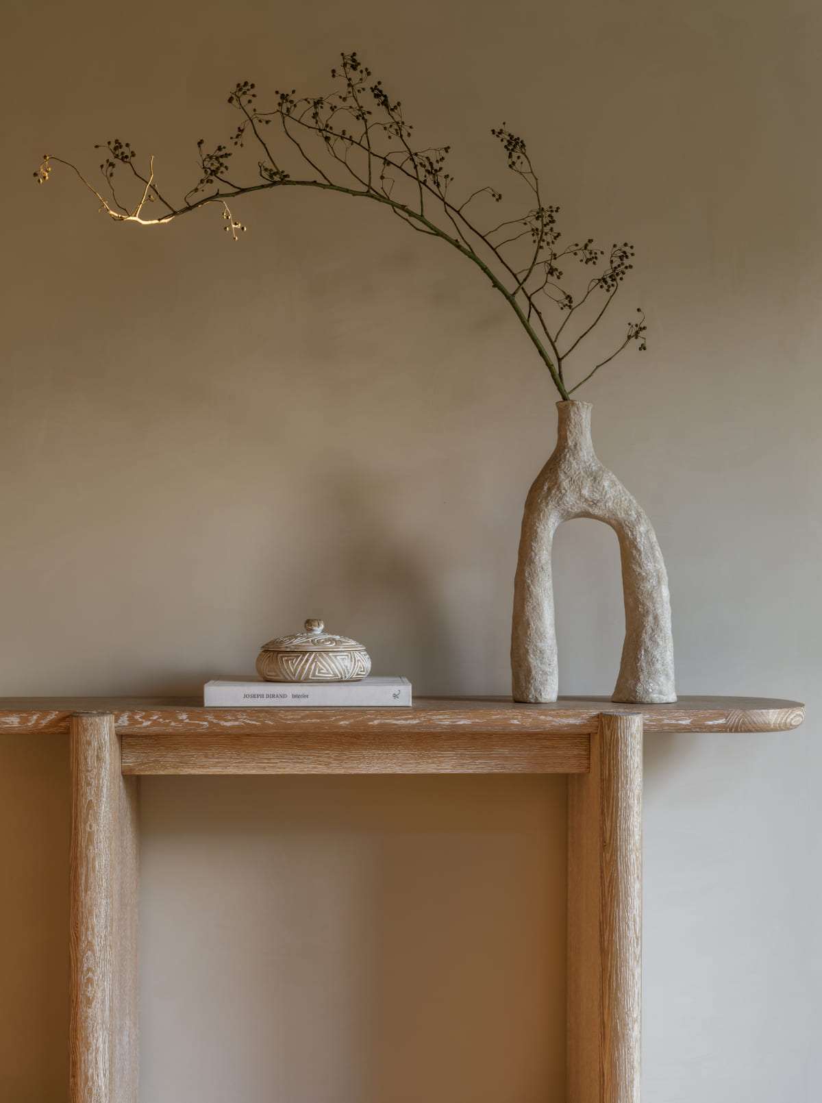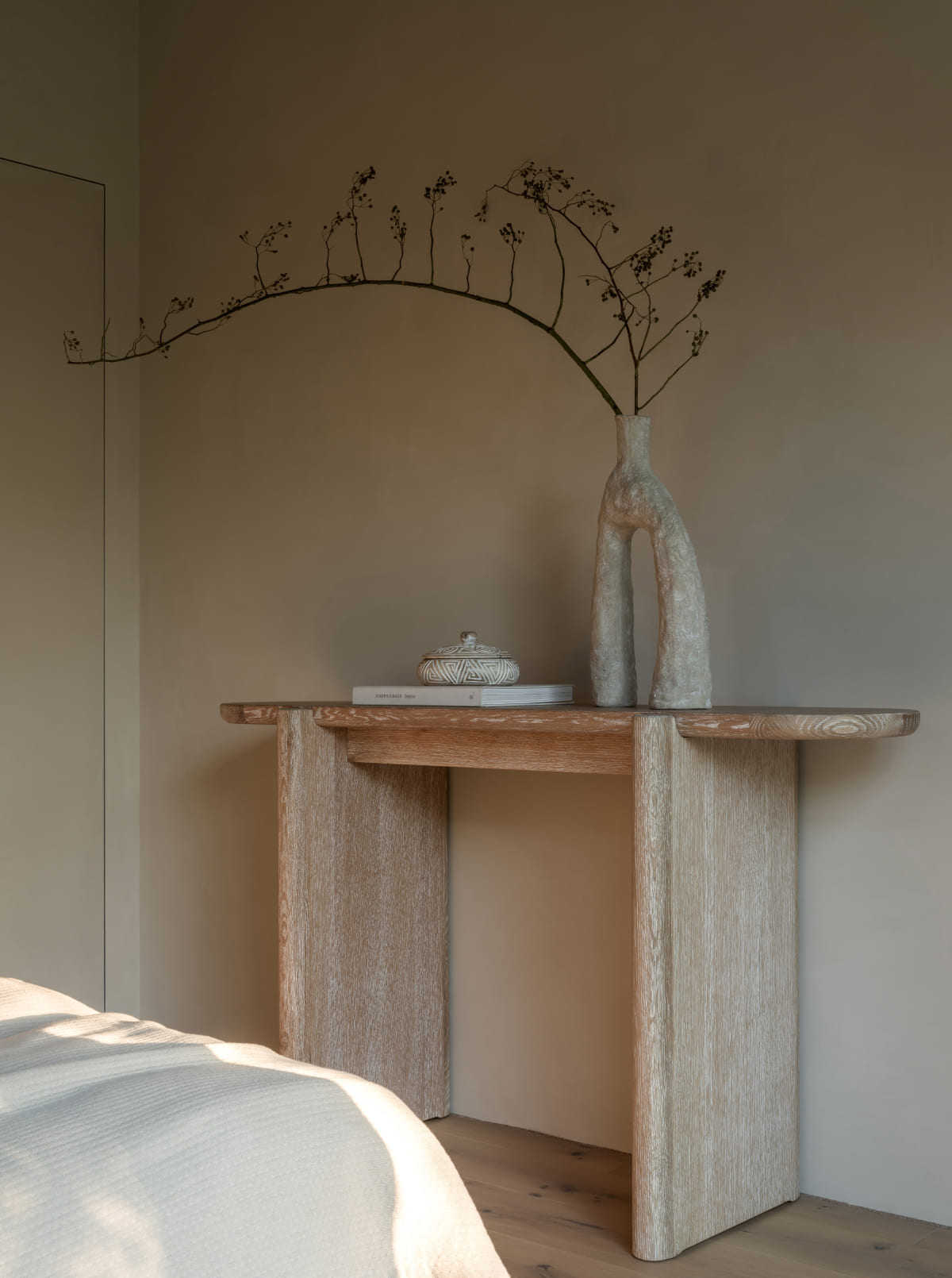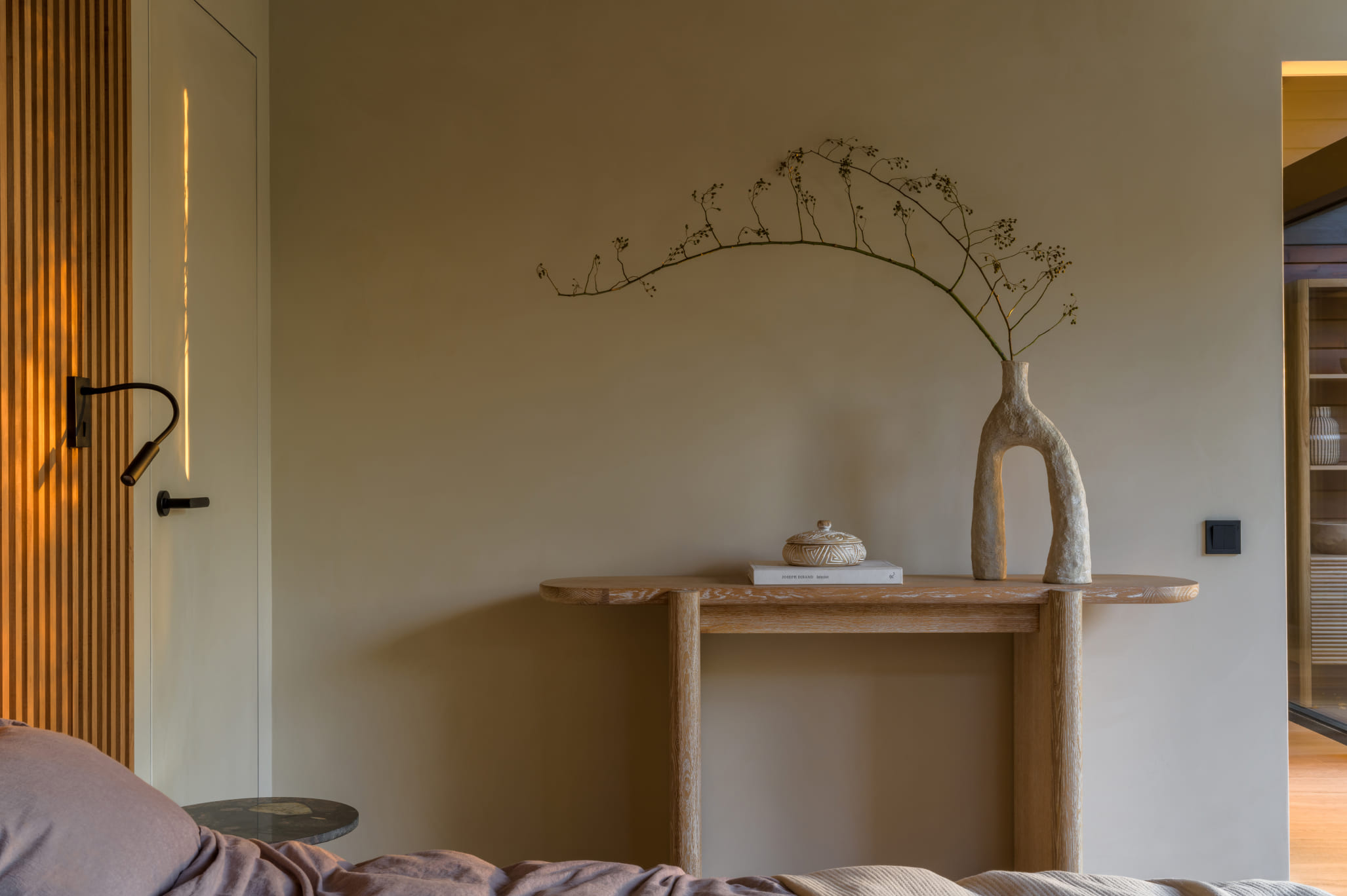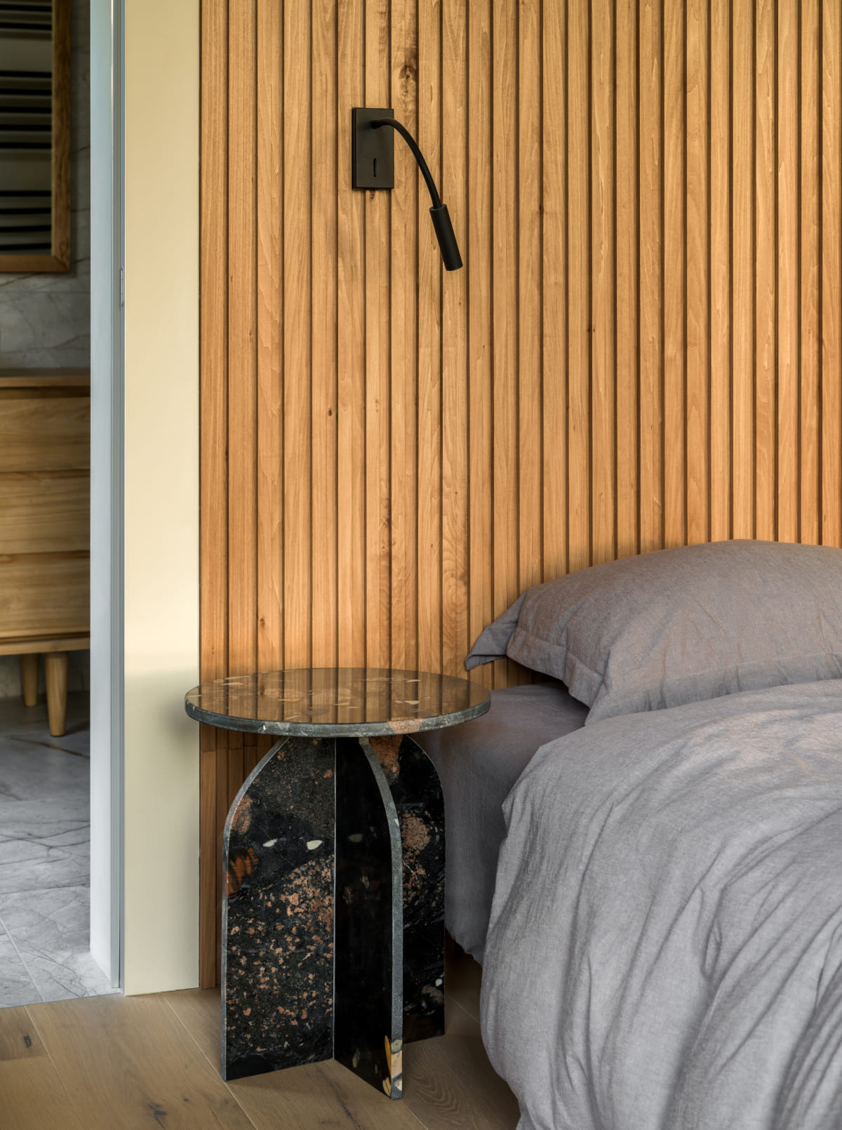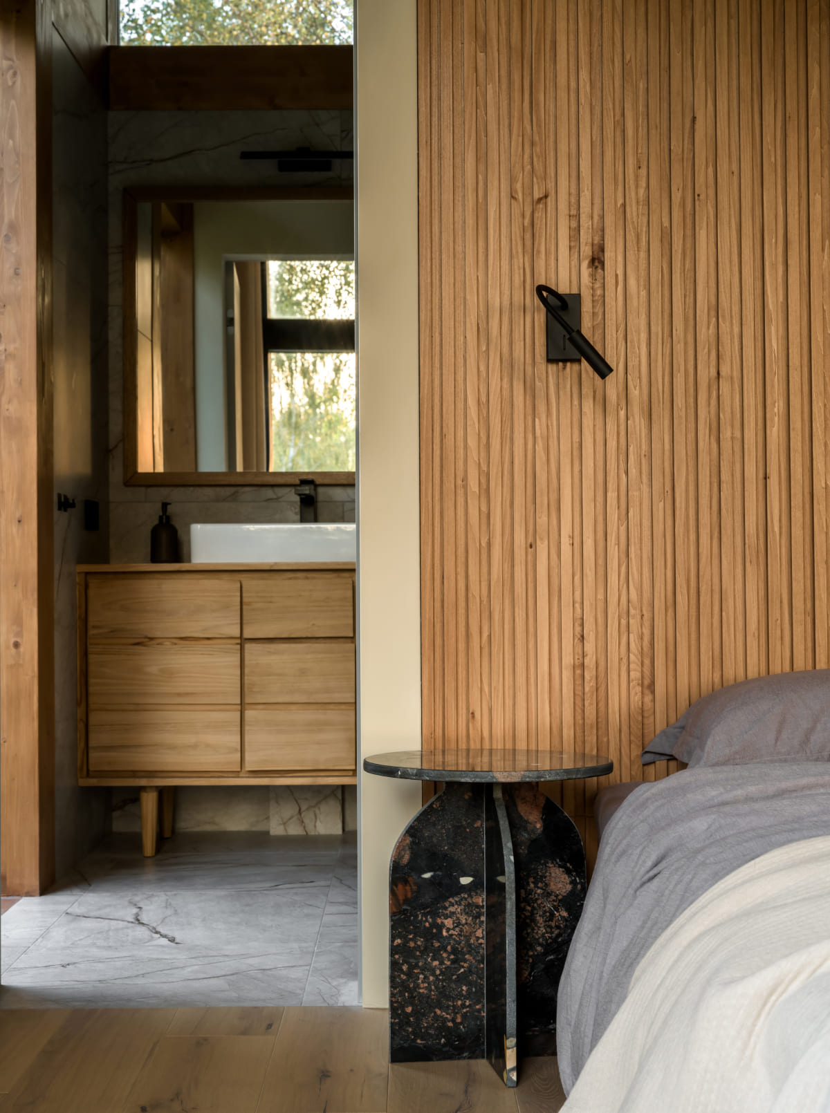 В спальне главный акцент сделан на панорамных окнах. Точкой притяжения стала рифлёная стеновая панель из дерева янтарного оттенка, на которой красиво играет солнечный свет. Контрапунктом — прикроватный столик из фактурного камня. Консоль Pebble, своей формой напоминающая морскую гальку, добавляет мягкости и натуральности.
