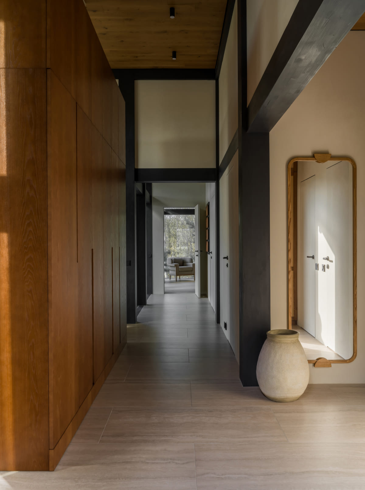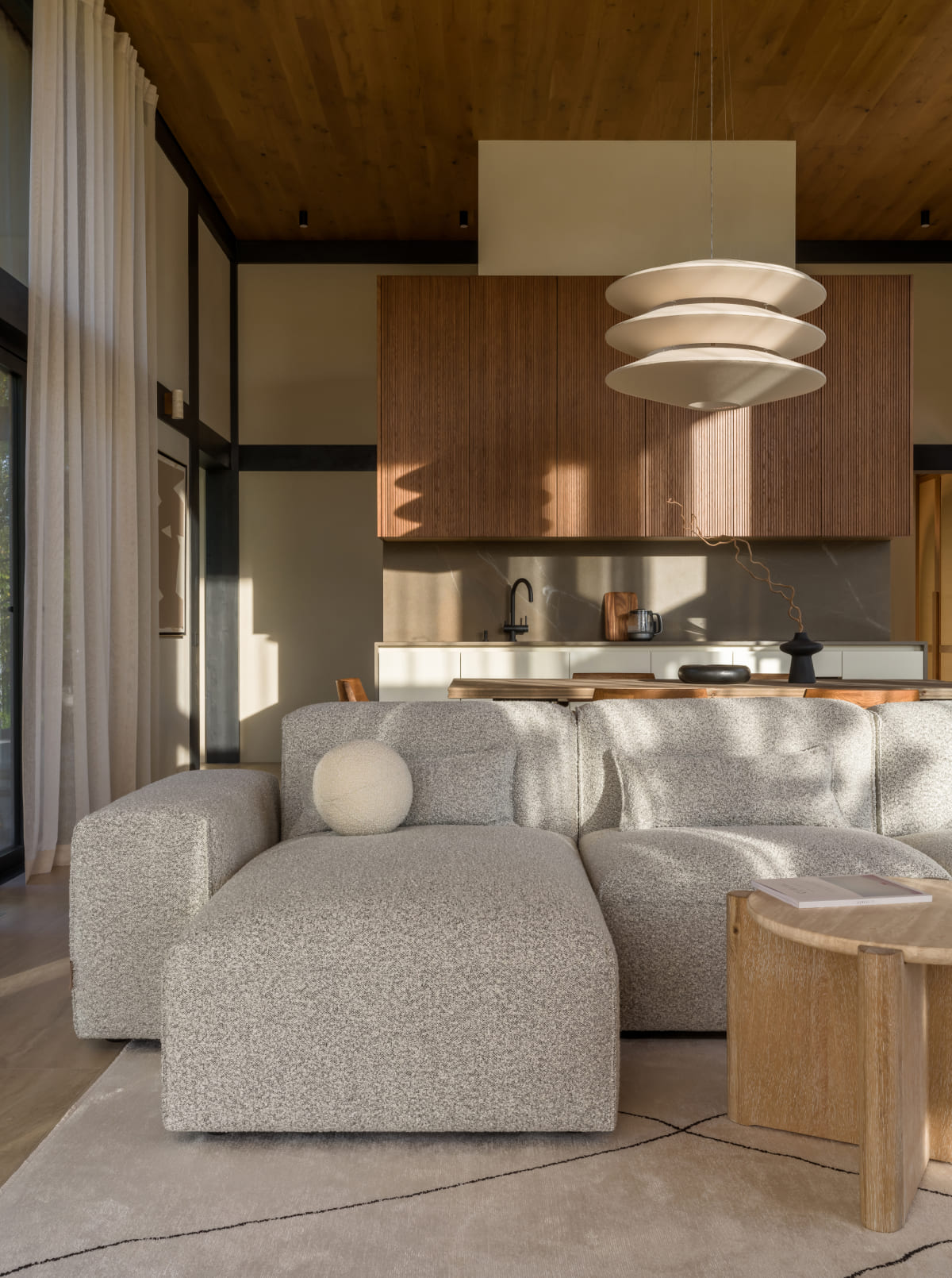 Палитра материалов сдержанна и выверена: дерево, камень, фактурная штукатурка. Их комбинация создаёт невероятный сенсорный опыт, особенно когда солнечный свет, проникая через окна, оживляет текстуры, заставляя ощущать каждое мгновение здесь и сейчас.