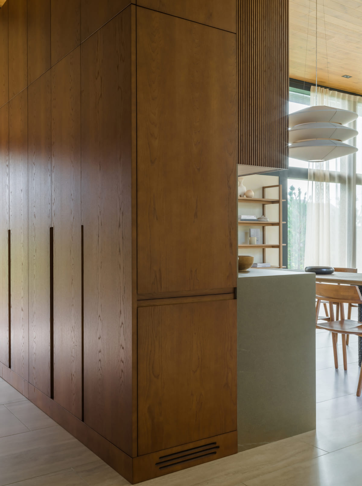 Обратная сторона кухонного блока – это вместительная гардеробная, которая помогает поддерживать идеальный порядок и ощущение простора.