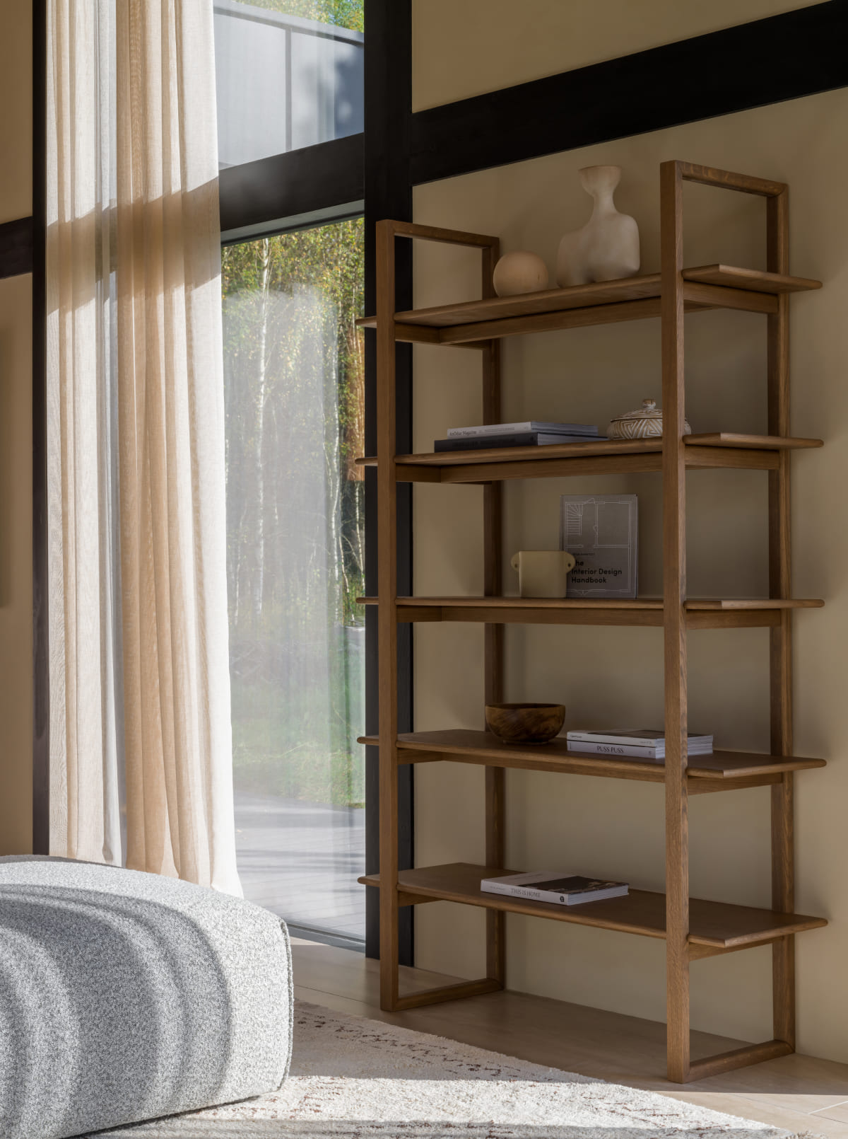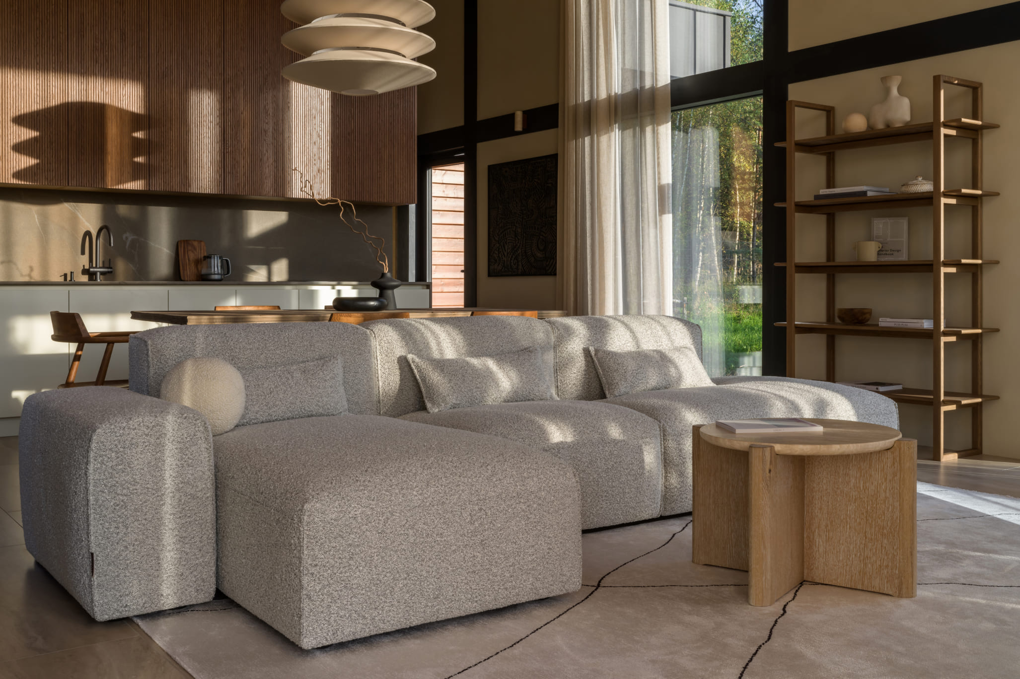 Гостиная создана для отдыха и неспешного любования природой. Мягкие, плавные черты модульного дивана Клайв и журнального столика Pebble, словно высеченного из камня, поддерживают ощущение покоя. Ковёр Berbere своими графичными линиями мягко «связывает» всю композицию, а открытый стеллаж JP Line ненавязчиво структурирует пространство, не утяжеляя его.