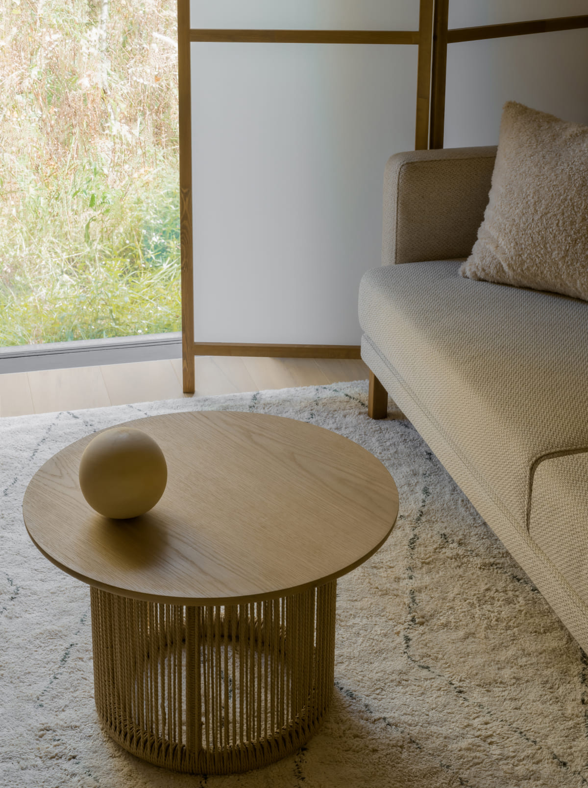 Это особая комната, где можно почитать, послушать музыку или просто помедитировать. Уютный диван Лагом так и манит прилечь, а плетёный столик Naomi и торшер Sonoma привносят аутентичный характер. Невесомая ширма, напоминающая японские сёдзи, завершает образ.