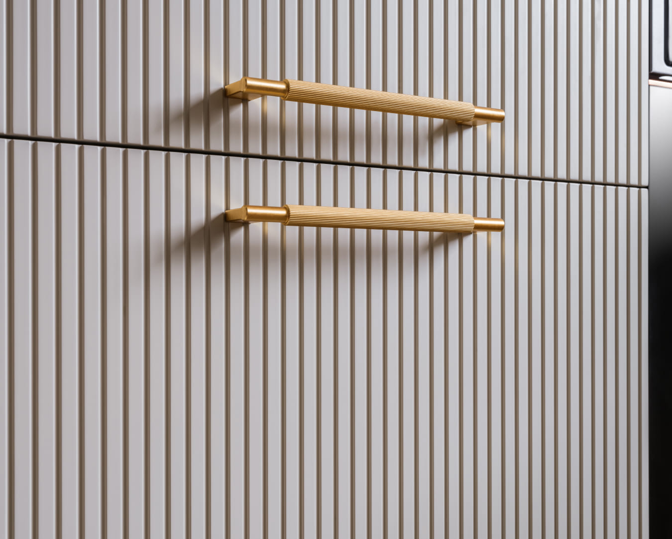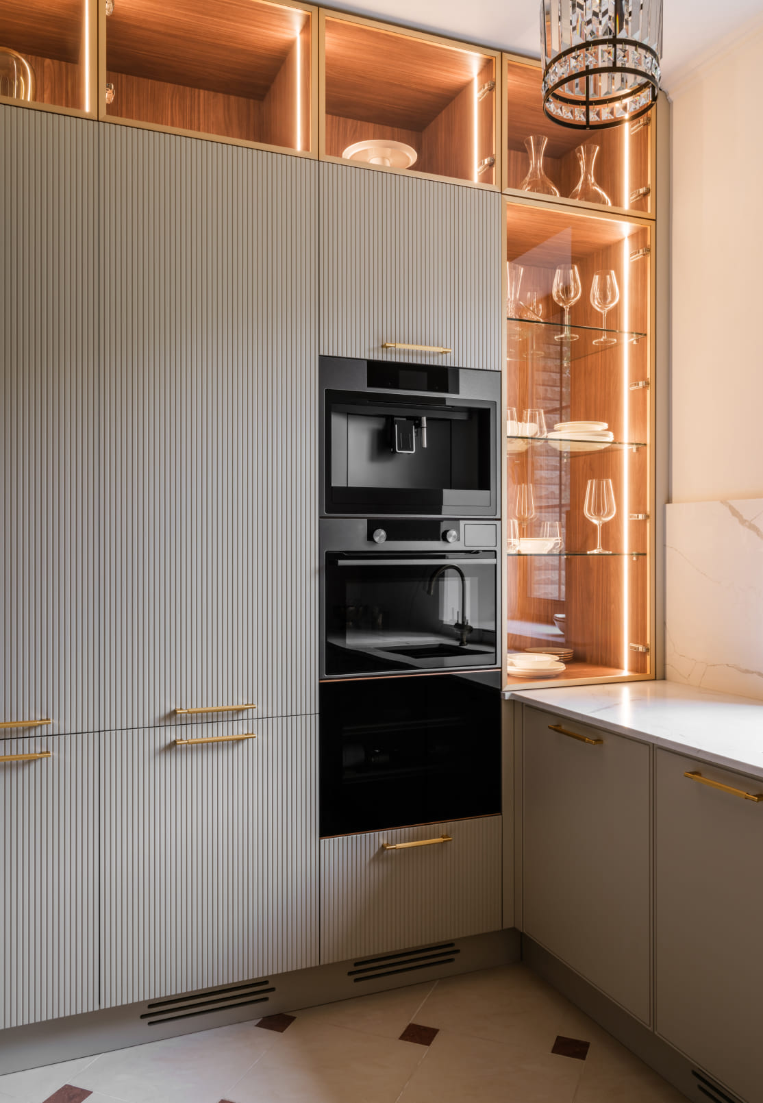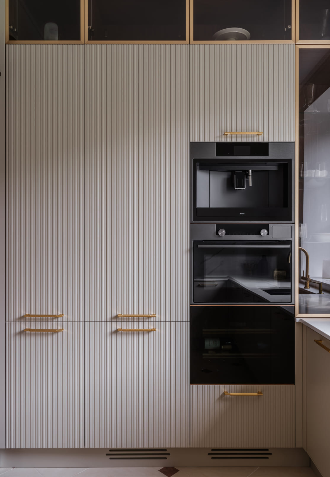 Графичности интерьеру добавляет боковой фасад с вертикальной фрезеровкой, создающей эффект тонких реек