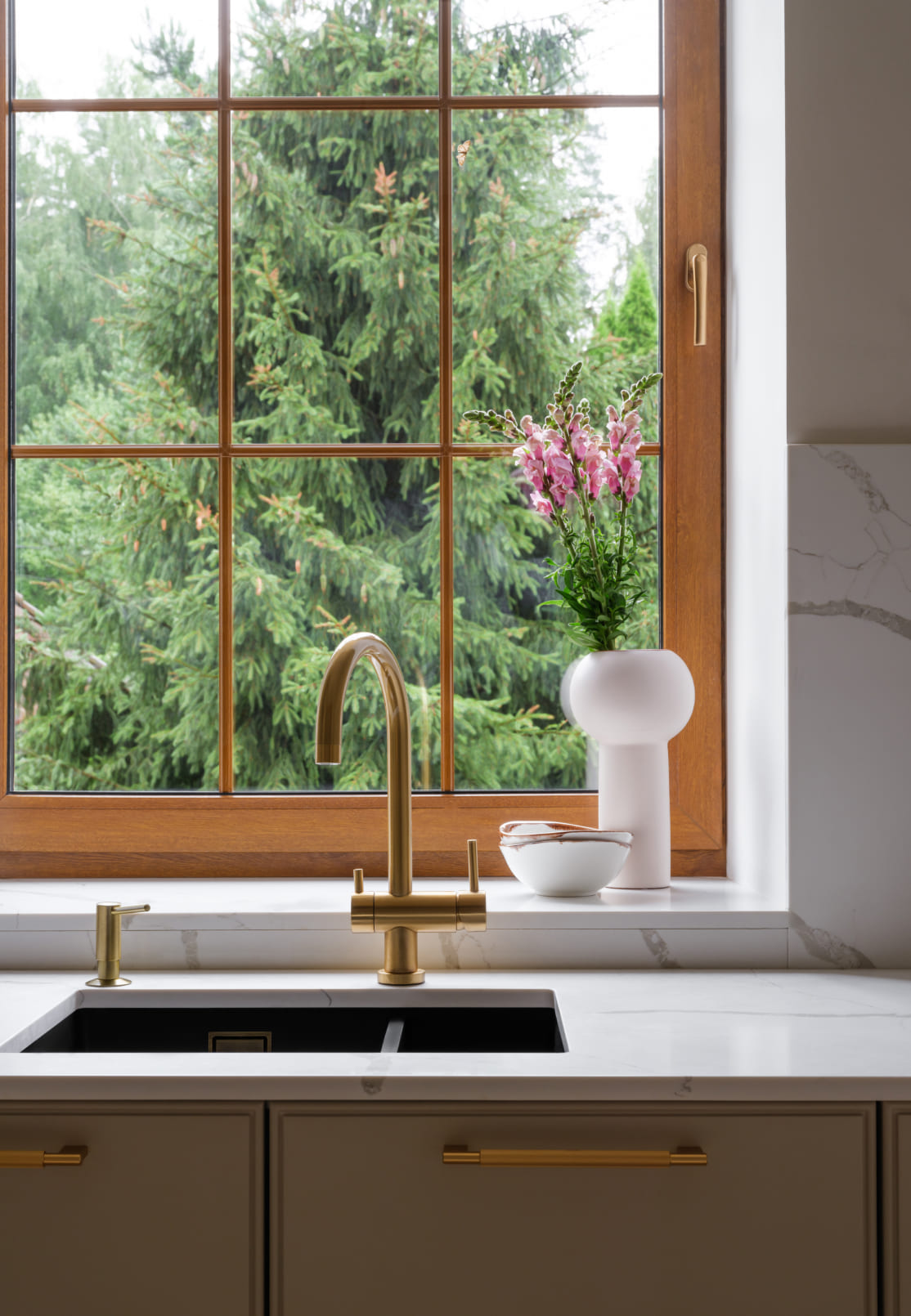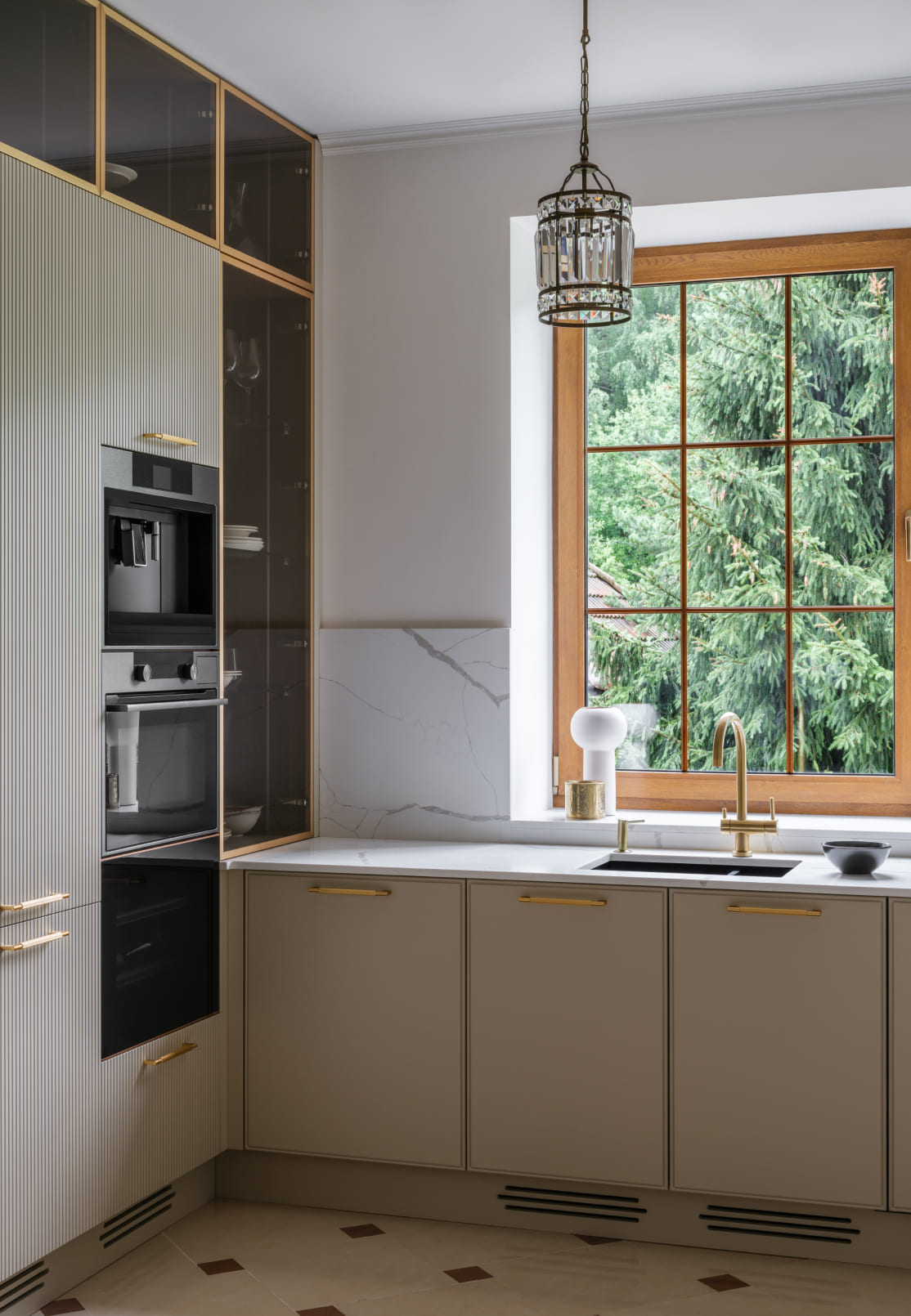 «Дом расположен в очень живописном месте, а на участке растёт много вековых деревьев. Оконный проём решили не закрывать шторами, поскольку из него открывается прекрасный вид на пушистые ели – природа словно становится частью кухни»