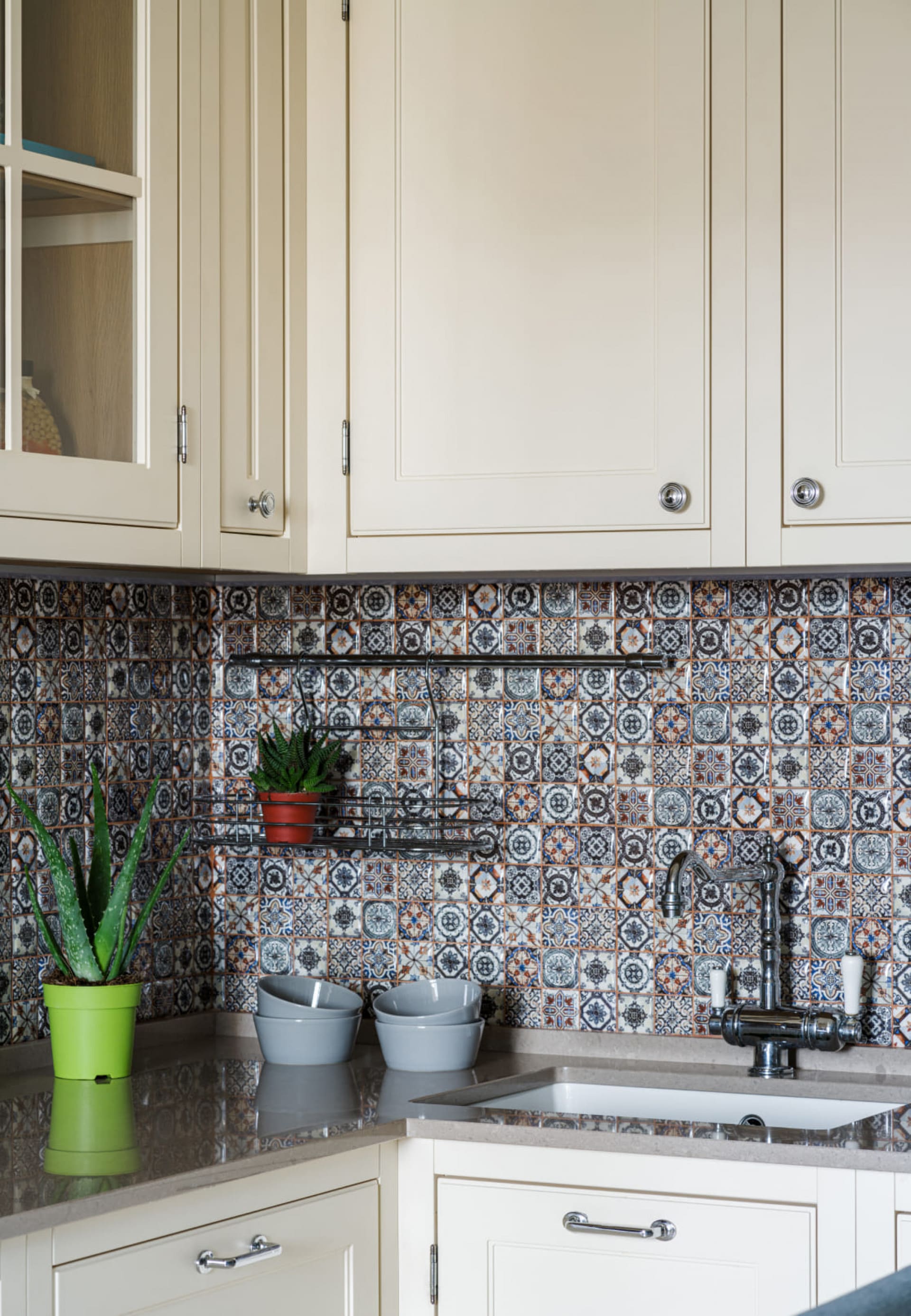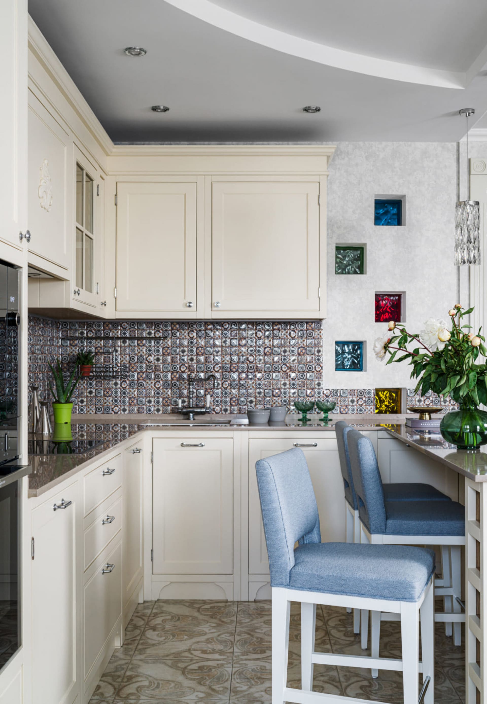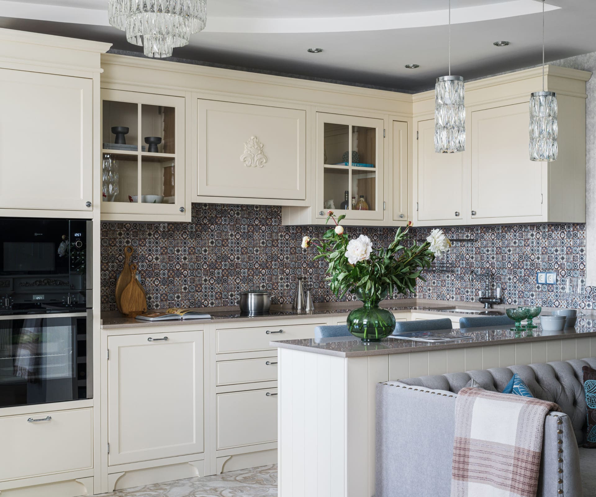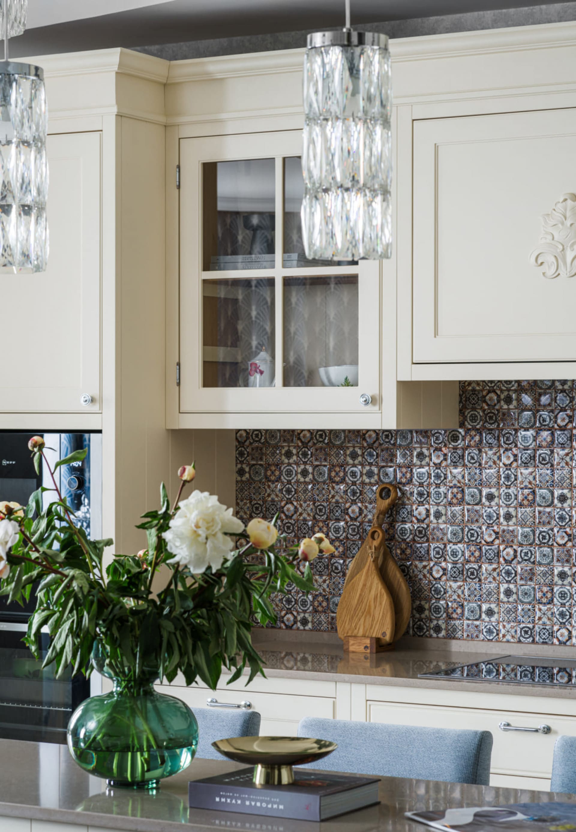 Классическое настроение задаёт кухня First: благородный молочный цвет, вкладные фасады с деликатной филёнкой, добавляющие ощущения воздушности стеклянные дверцы в верхнем ряду, изящная эмблема Dantone Home в виде лилии, многоуровневые карнизы. Если идти по классическому сценарию и далее, то ручкам тоже следует быть «нарядными», но суть американского интерьера – в эклектике, поэтому здесь использована самая простая фурнитура, а подвесные светильники из гранёного стекла, напротив, довольно традиционны.