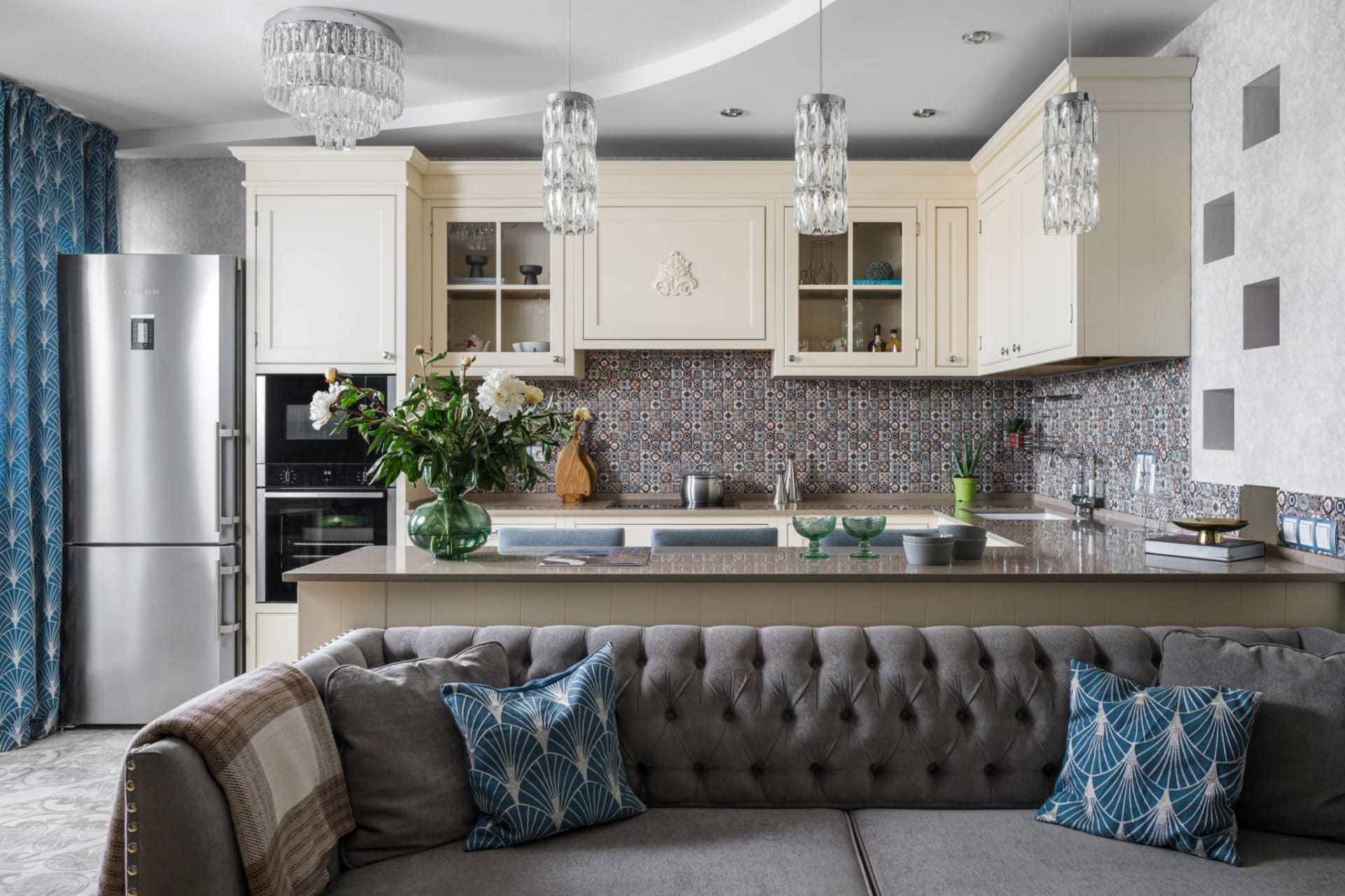 Столешницу продолжает барная стойка, где разместились три полубарных стула Дуглас, формируя уголок для быстрых завтраков и перекусов. Спинкой к ней стоит диван Марсель, визуально разделяющий кухню и гостиную, – это характерный для американского стиля приём зонирования.