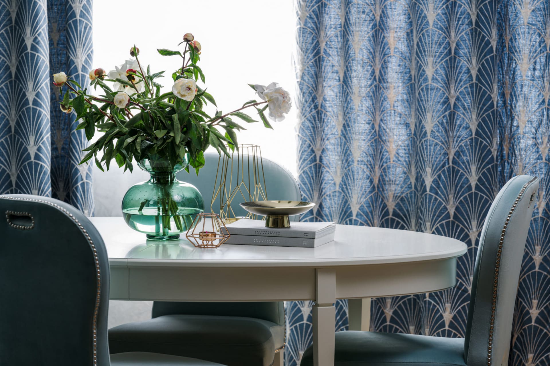 А как же без располагающей к душевным разговорам столовой, где проходит действие половины американских сериалов? С данной ролью отлично справляется белоснежный стол Феникс и декорированные серебристыми гвоздиками стулья Коуз в небесно-голубой обивке.