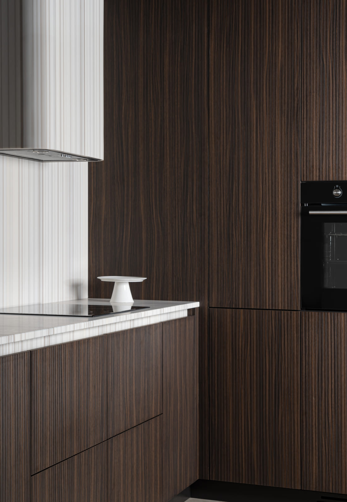 Самый демократичный вариант среди наших кухонь: подходит всем, кто любит готовить, так как современные панели Cleaf (альтернатива модным ребристым фасадам) очень просты в уходе.