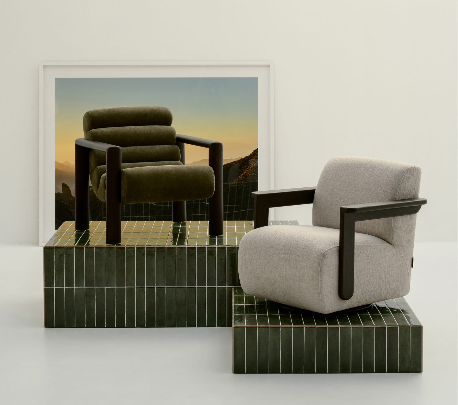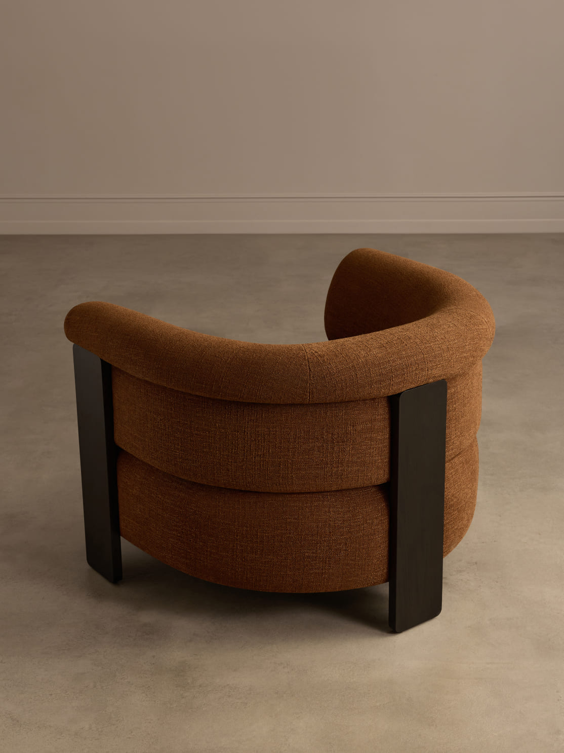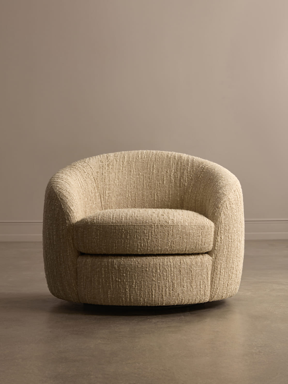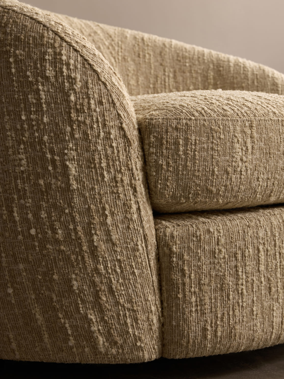 Плавная линия спинки, перетекающая в подлокотники, и поворотное основание придают Шеннон естественную подвижность. Фактурная обивка наполняет образ тактильной глубиной, располагая к неспешному отдыху. Модель сочетает мягкие, обволакивающие формы с мобильностью — для тех, кто ценит баланс между эстетикой и удобством.