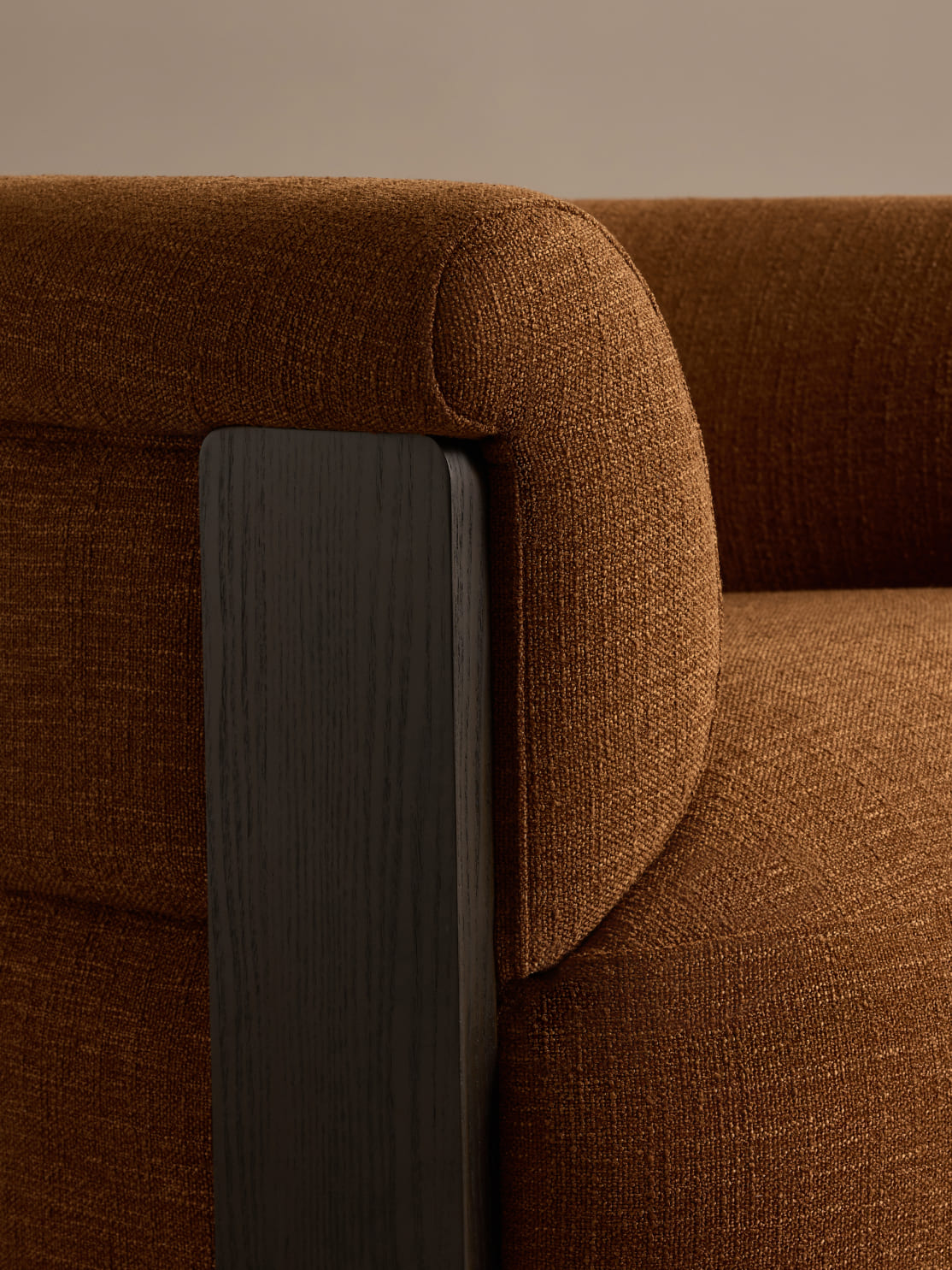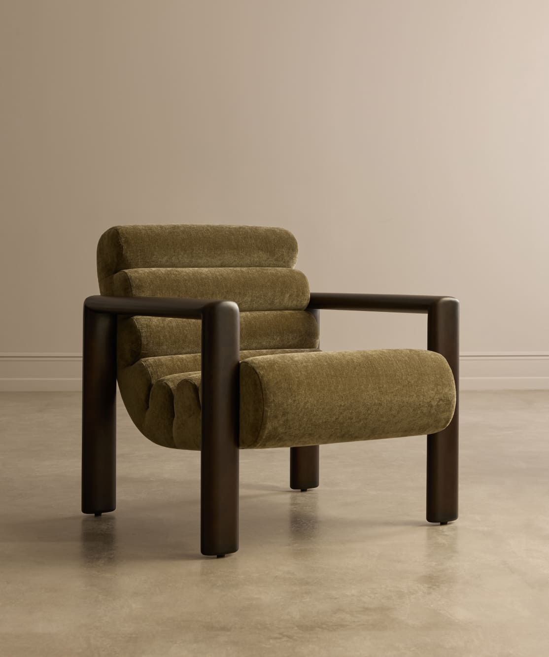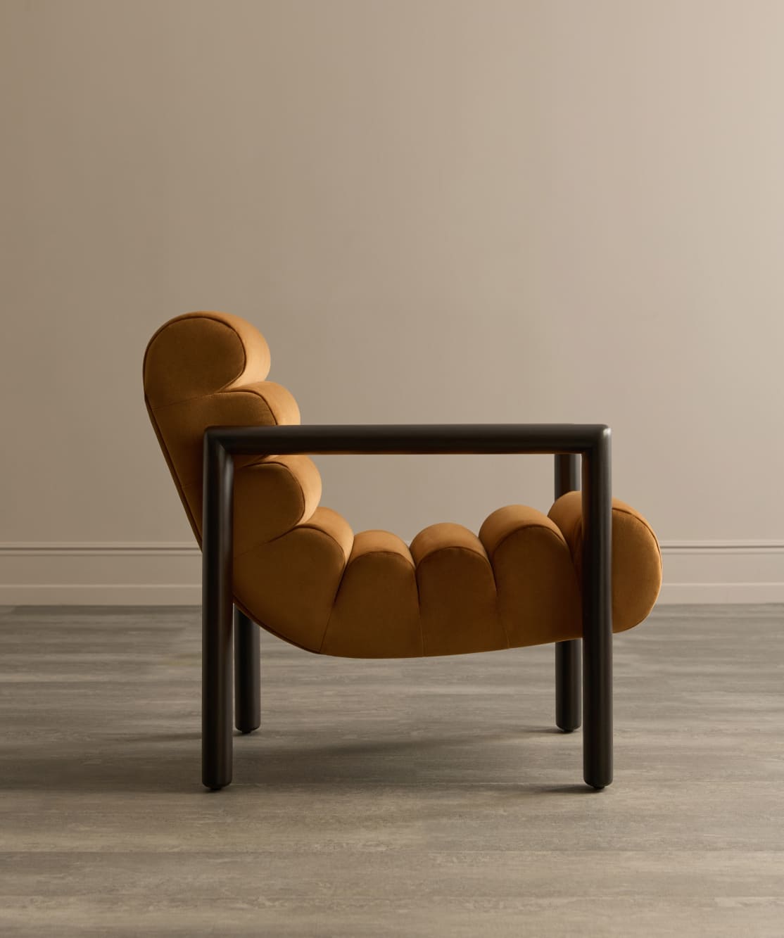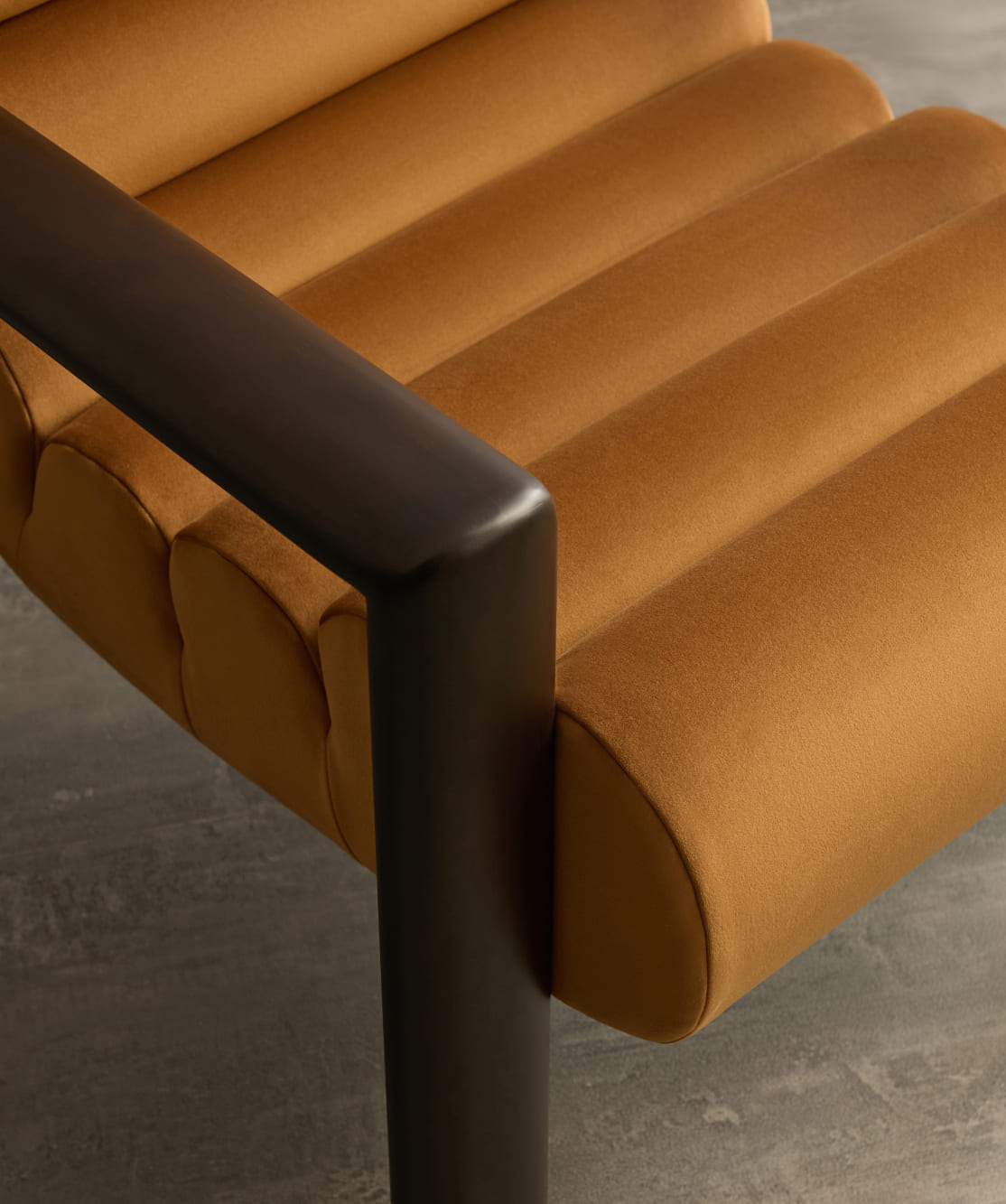Трубчатое сиденье с плавным изгибом, обитое бархатом, зафиксировано между двумя П-образными опорами из тёмного каучукового дерева — точно шезлонг, подвешенный в воздухе. Благодаря открытой конструкции и контрасту фактур этот предмет кажется одновременно монолитным и невесомым. Доступно в двух оттенках бархата: мягкий ивовый зелёный и приглушённый карамельный.