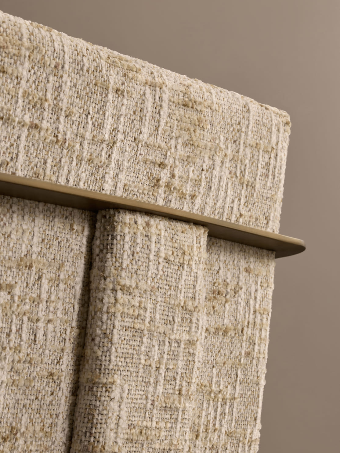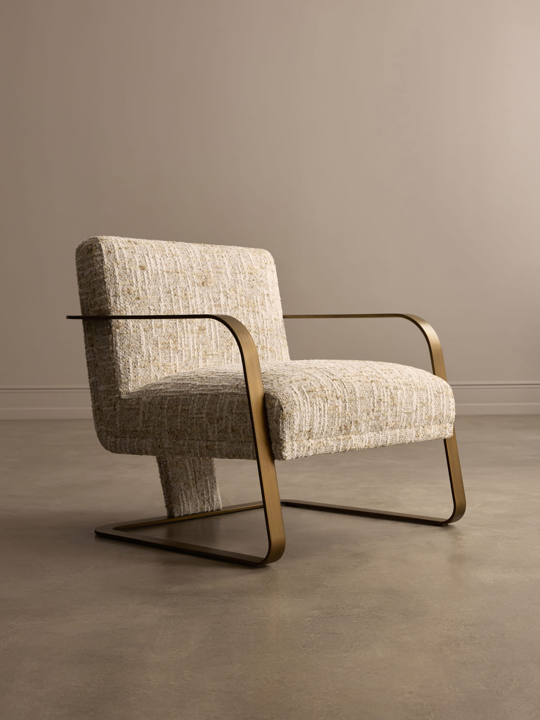 Кресло Рона отсылает к эстетике ар-деко: линии подлокотников спускаются и сходятся в основании, образуя единую структуру. Матовый металл контрастирует с теплом фактурной обивки, а центральная ножка в ткани добавляет графичности. Благодаря асимметричной конструкции с разных ракурсов кресло выглядит по-новому, привнося в интерьер деликатную ноту гламура.