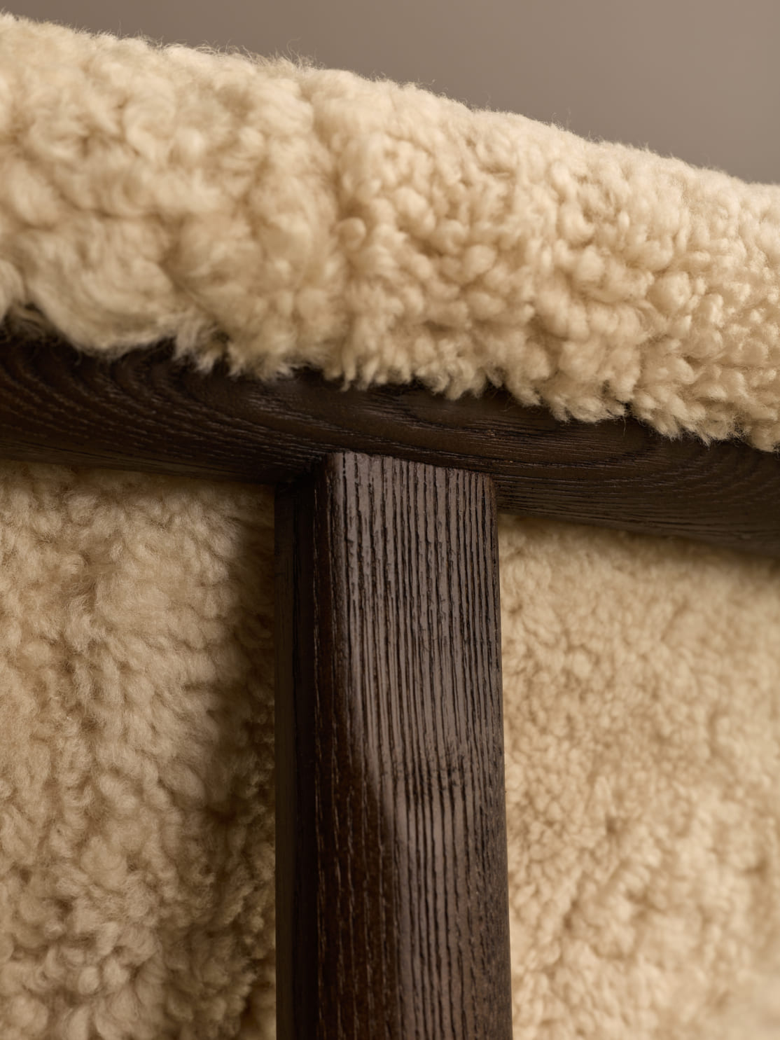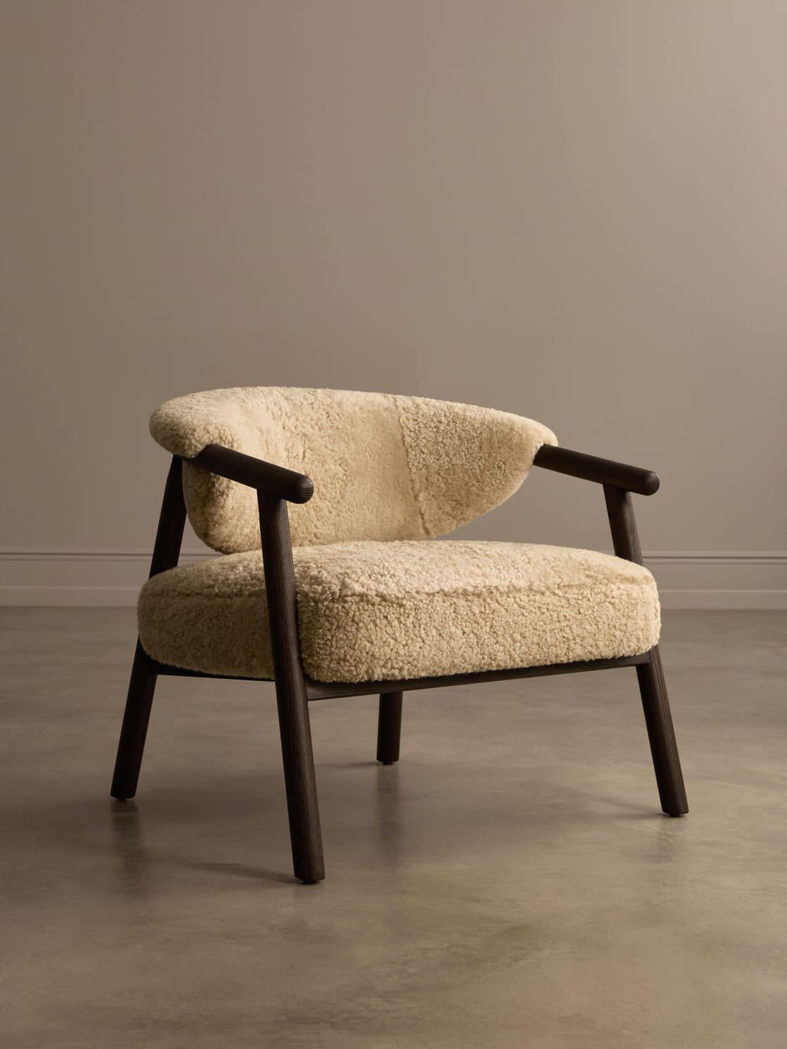 Знакомая модель Нур предстаёт в новом прочтении — в обивке из натуральной овчины. Мягкий ворс при соприкосновении дарит ощущение нежного объятия — на интуитивном уровне это воспринимается как забота и защита. Исследования подтверждают: даже имитация прикосновения способна снижать уровень стресса. В модели Нур эту задачу решает сам материал. Такое кресло становится не просто акцентным предметом, а физически ощутимым источником спокойствия.