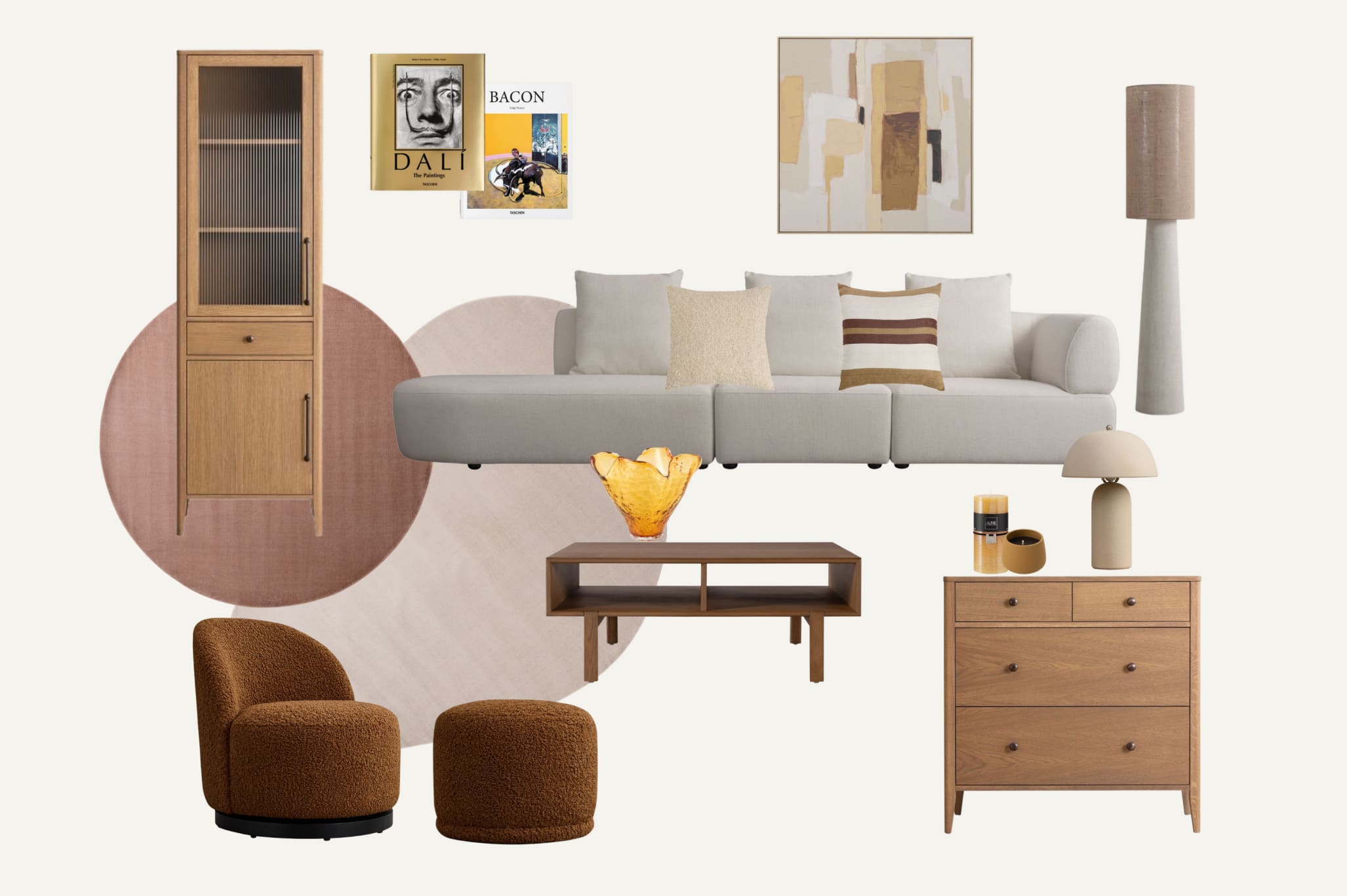 Бежевый диван «Кортни» — намеренно нейтральный, словно холст, ждущий прикосновения. Зато кресло «Аура» терракотового оттенка и пуф для ног уже более экспрессивные и яркие. Корпусная мебель — комод и витрина коллекции «Экрю» — выбрана за благородный тон натуральной древесины и лаконичность, чуждую сиюминутным трендам.