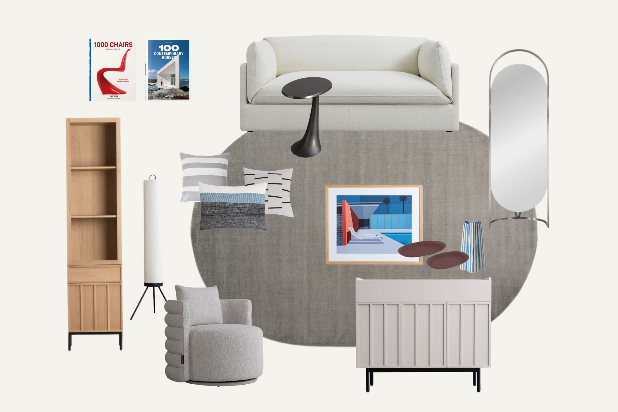 Ковёр «Берген» связывает всю композицию, а кресло на колёсиках «Клео» вносит мобильность. Постер «След», ваза с ручкой «Эми» и подушка «Вега» добавляют графичности, а торшер «Саванги» образует тёплый световой ореол. Книги — «Норман Мейлер, Берт Стерн, Мэрилин Монро» и «50 величайших фотографий и их истории» — лежат на видном месте, выдавая страсть к визуальным нарративам и культовым персонажам.