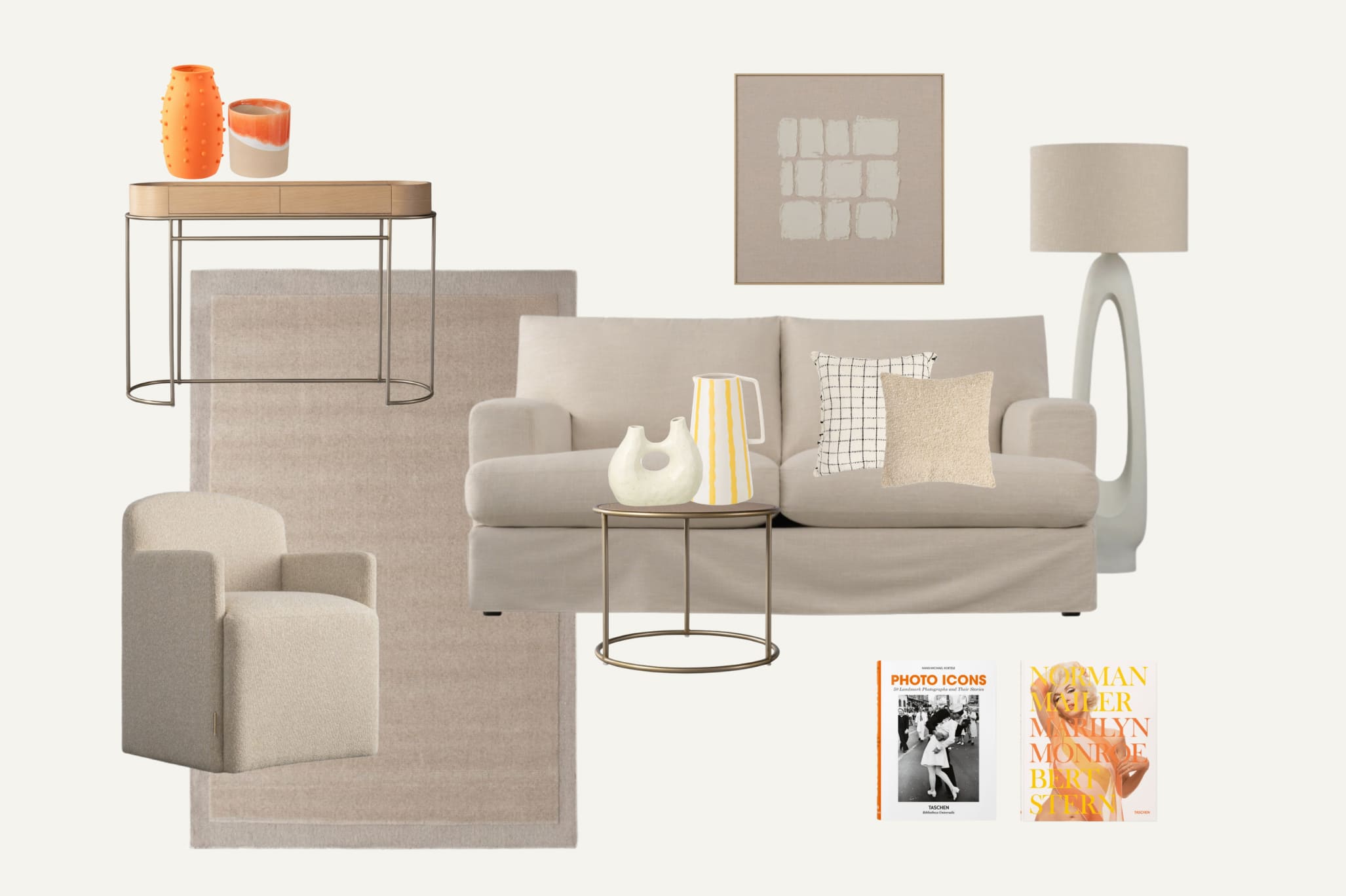 Основой служит прямой диван «Кармел» в нежном песочном оттенке. Кофейный стол «Трейн» и консоль из той же серии формируют чистую геометрию, на фоне которой сочные оранжевые и солнечные всплески раскрываются с максимальной силой. Ваза «Теруэль», напоминающая произведения Гауди, и ваза «Ланьон» перекликаются по цвету, словно две ноты одной тональности.