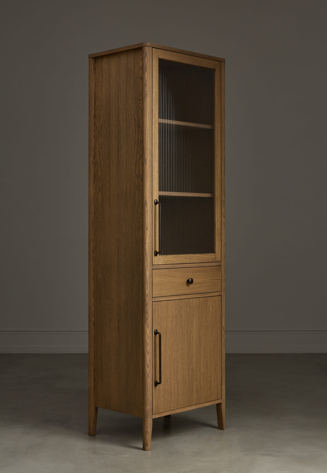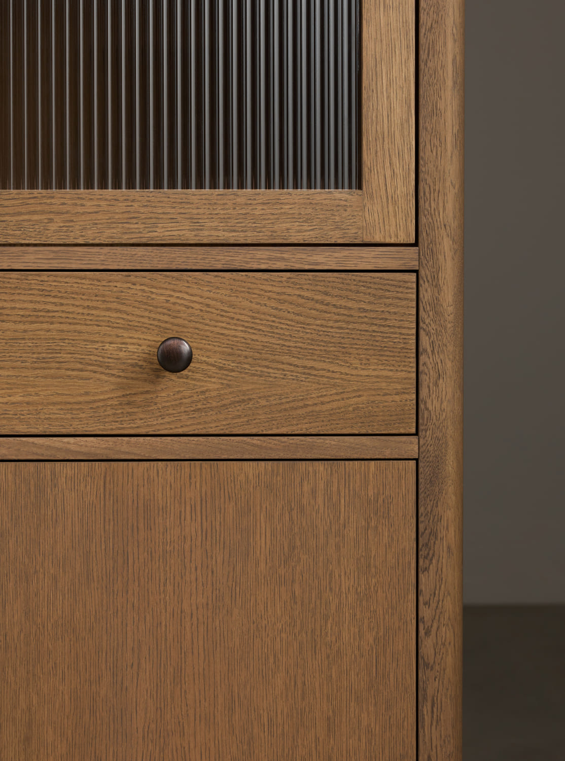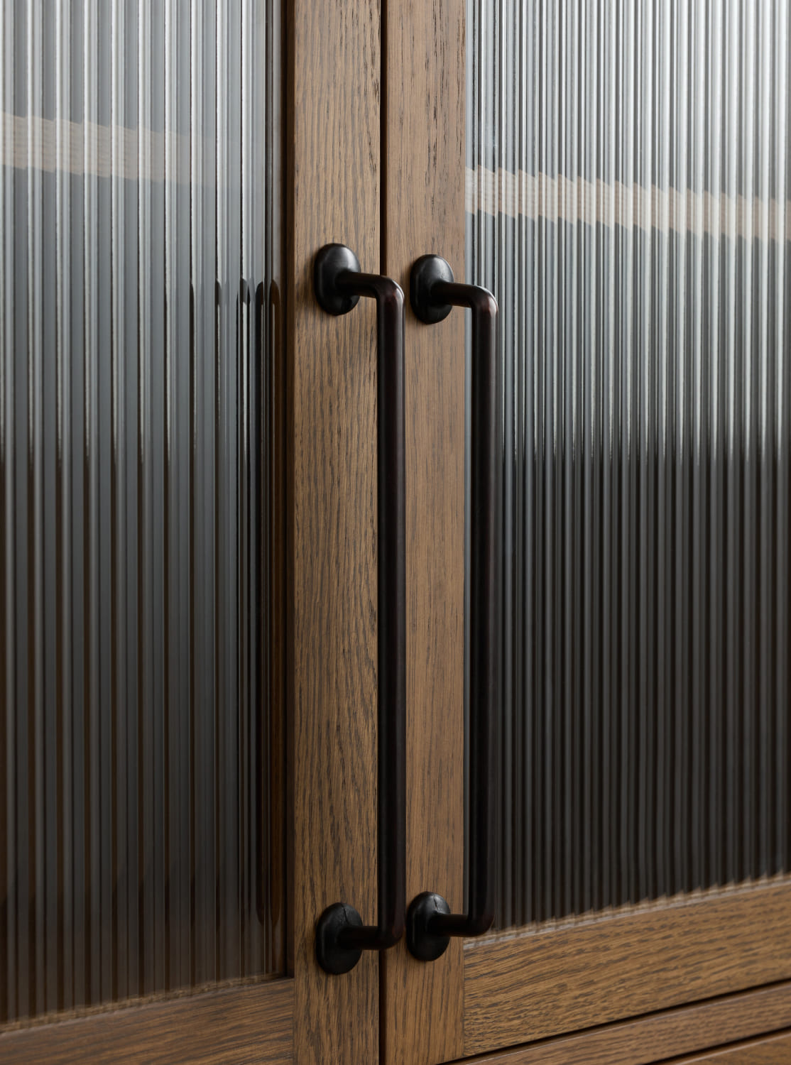 Двухстворчатая витрина демонстрирует идеальное равновесие вертикалей и горизонталей. Рифление визуально вытягивает очертания, а шарообразные ручки становятся выразительными акцентами, создавая контрапункт строгой геометрии.