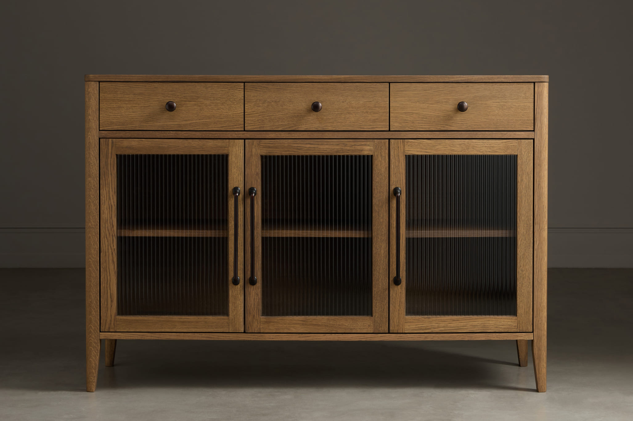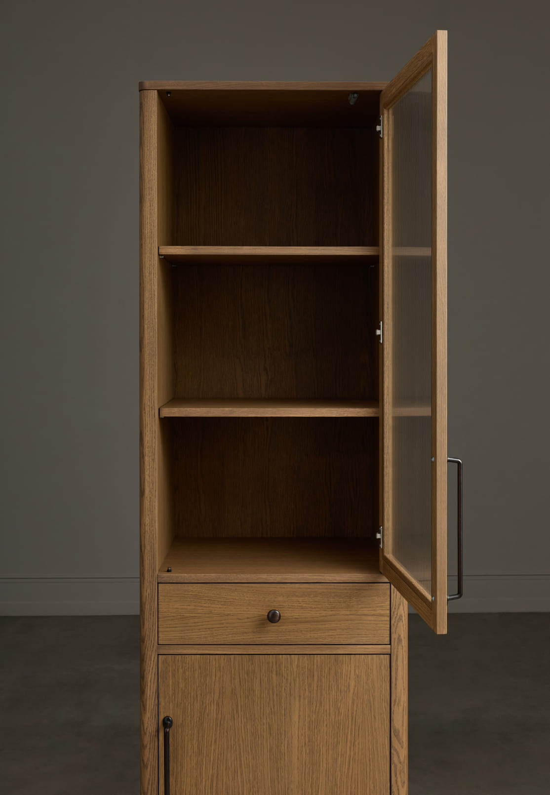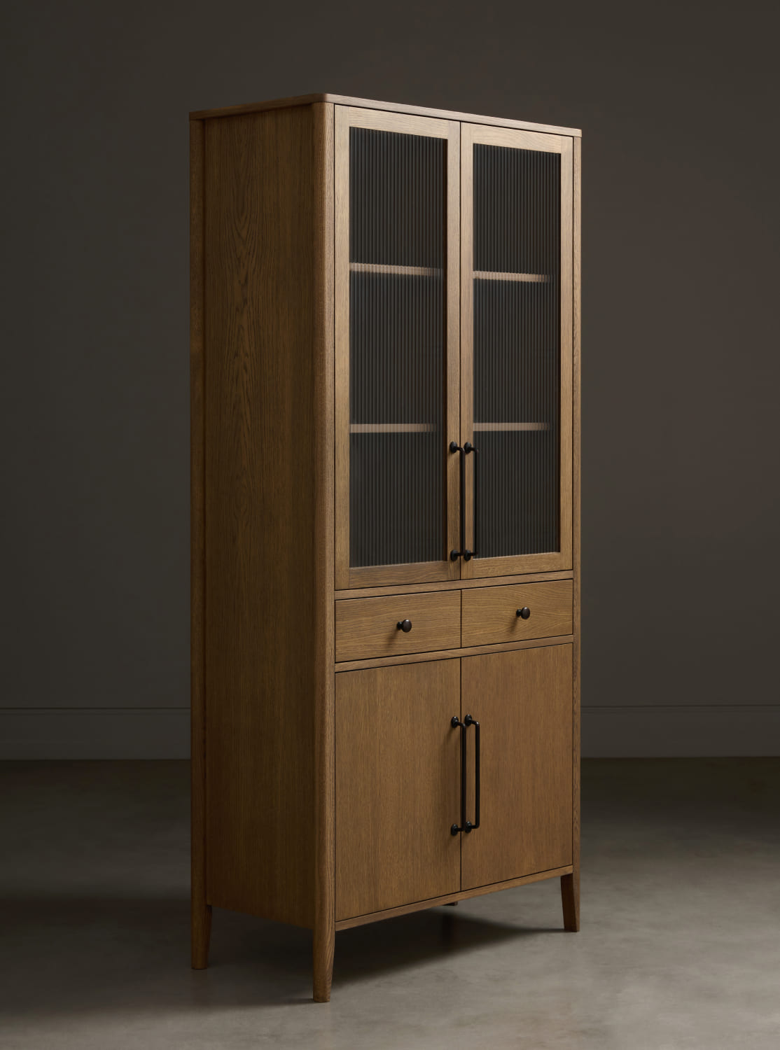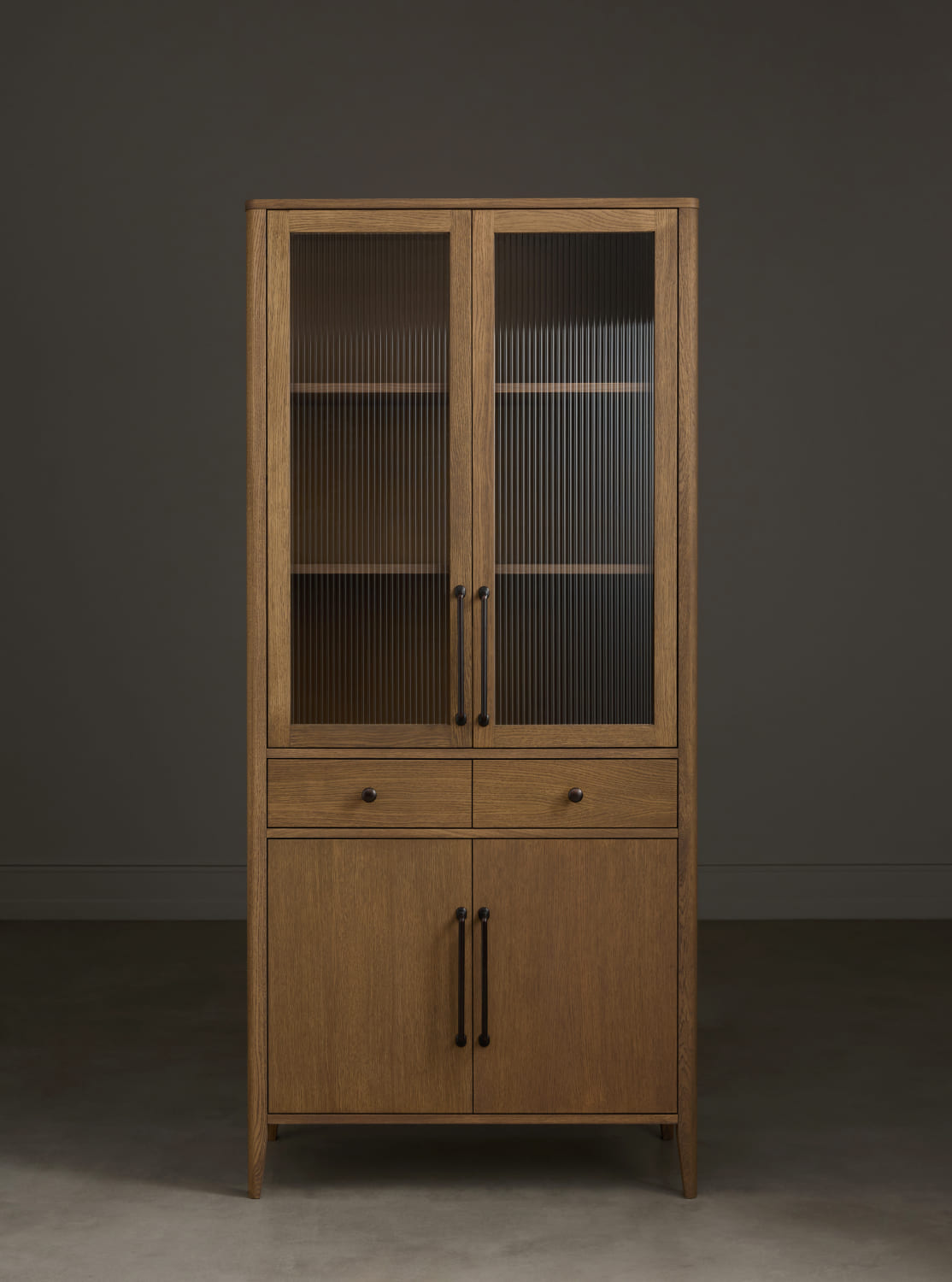 Двухстворчатая витрина демонстрирует идеальное равновесие вертикалей и горизонталей. Рифление визуально вытягивает очертания, а шарообразные ручки становятся выразительными акцентами, создавая контрапункт строгой геометрии.