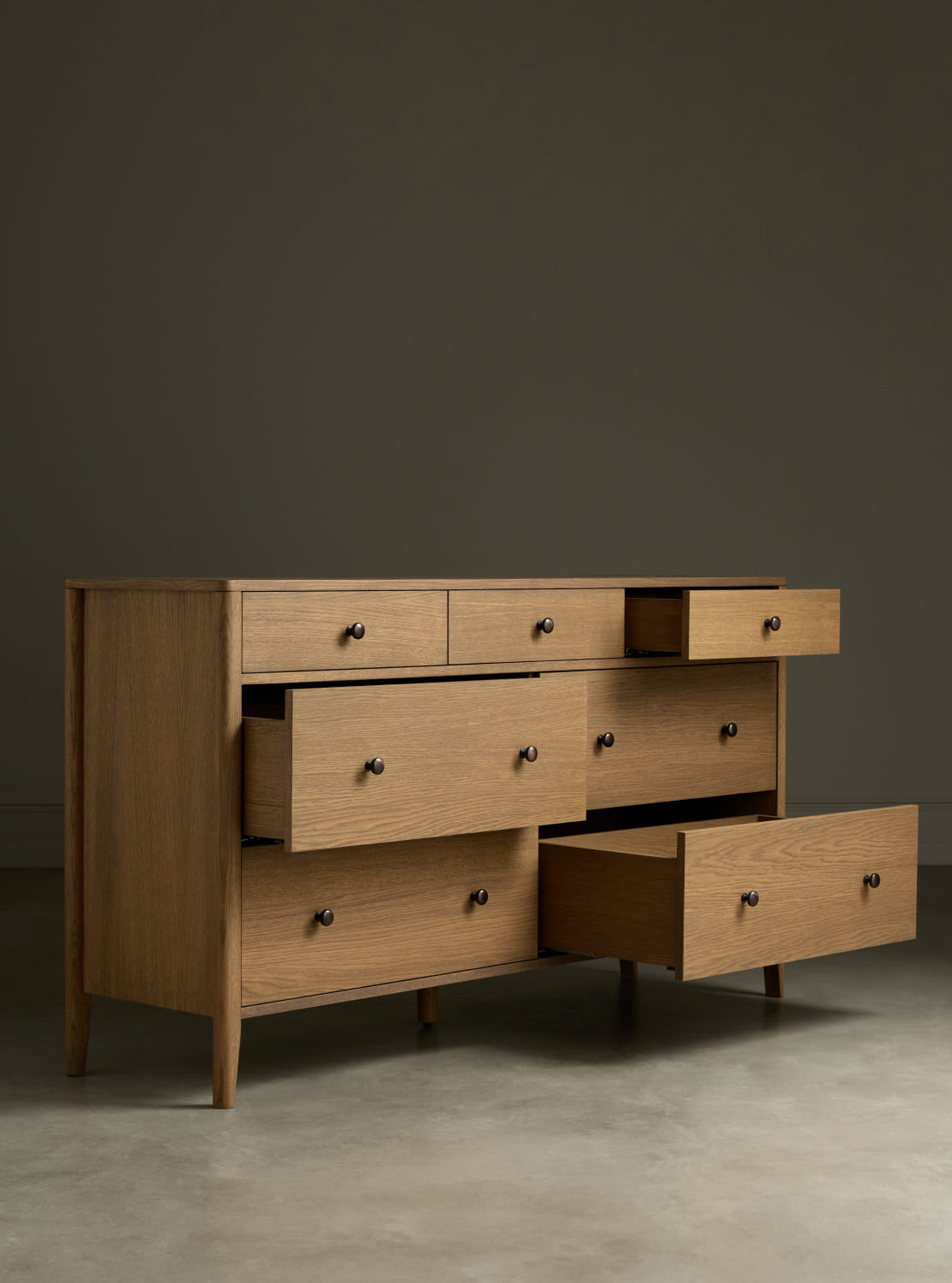 Широкий комод из коллекции Ecru — это акцентная деталь. Его фасад напоминает музыкальный ритм ¾, свойственный вальсу: три верхних ящика уравновешиваются четырьмя нижними.