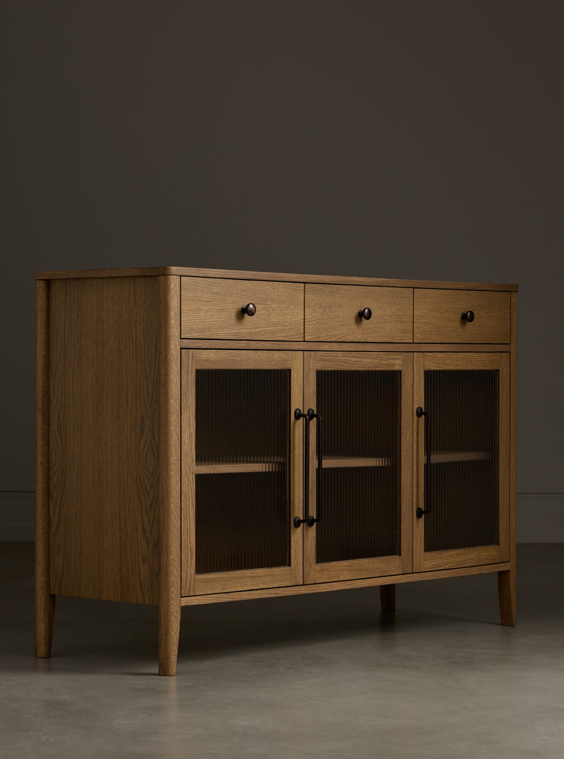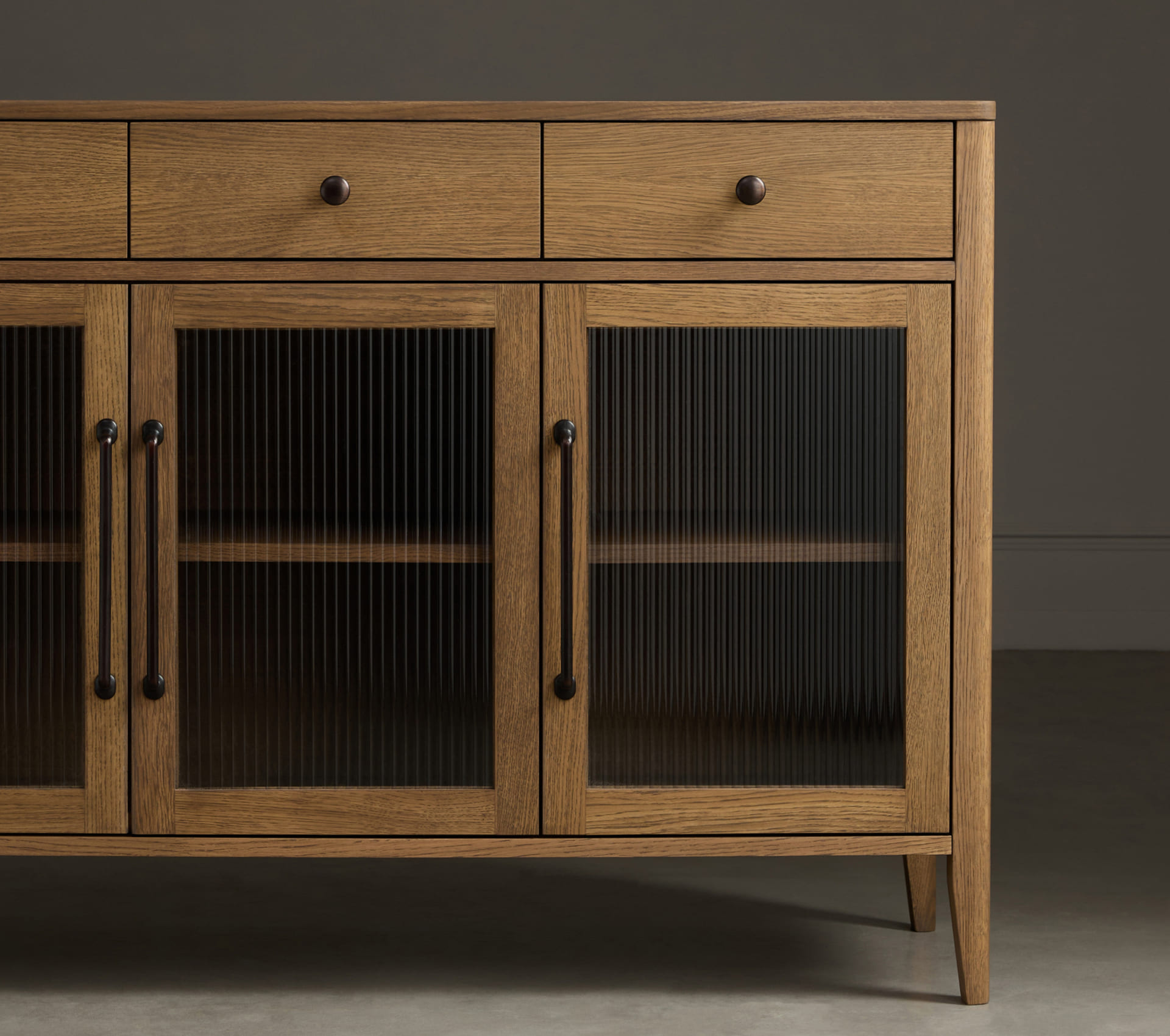 Серия включает низкие и высокие витрины, комоды и прикроватные тумбы, предлагая решения для разных зон интерьера с единым гармоничным почерком.