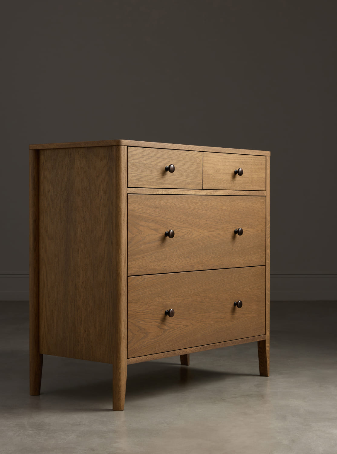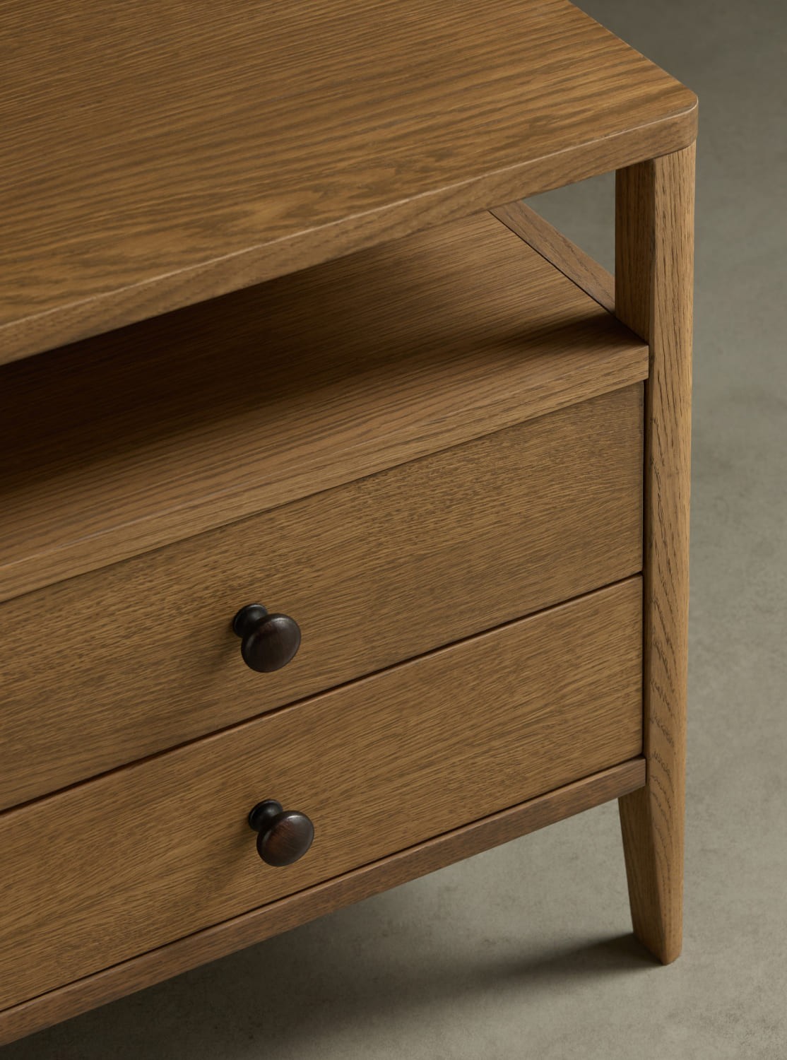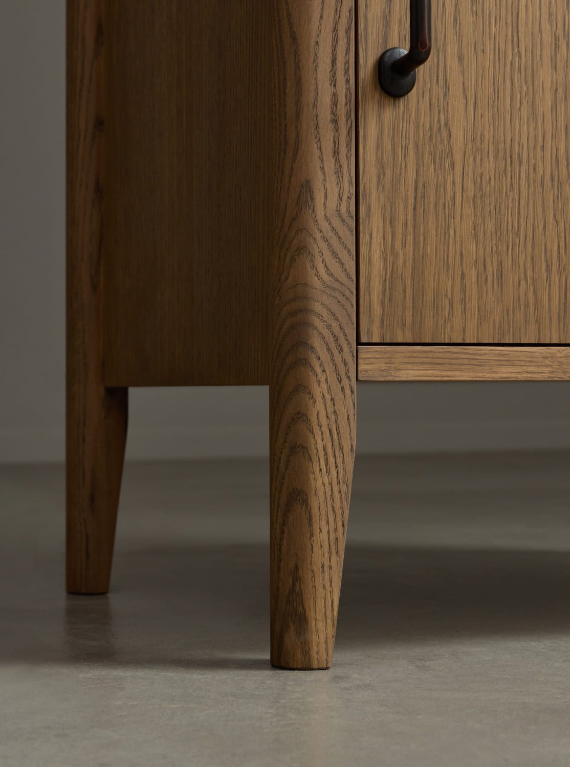 Геометрия предметов строится на контрасте: чёткие прямые линии корпусов сочетаются с мягко скошенными ножками из массива дуба. Такое решение балансирует между строгостью и пластичностью, обеспечивая визуальную лёгкость и конструктивную устойчивость.