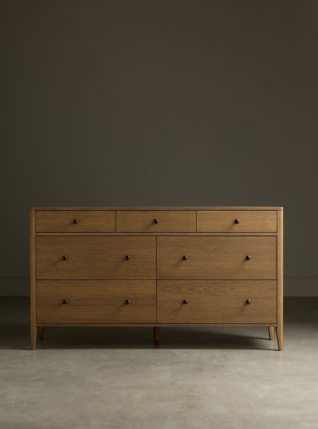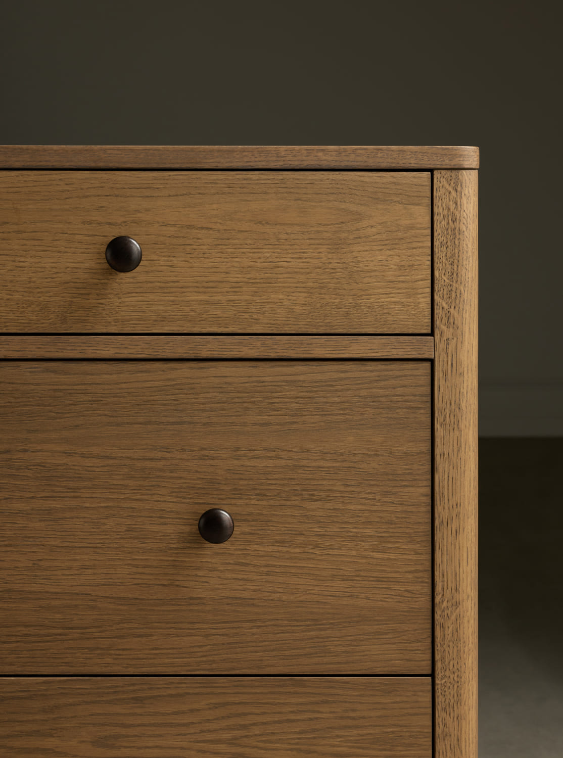Объёмные, но компактные ручки формируют на поверхности комода упорядоченный рисунок, подобный изящным пуговицам на дорогом пиджаке, где каждая деталь — часть безупречного кроя. Комод выглядит сдержанно, элегантно и завершённо, привнося в пространство структуру и спокойное достоинство.