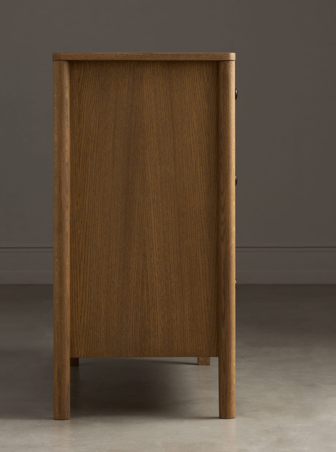 Тёплая палитра и естественная фактура — результат использования шпонированного дубом МДФ. Этот материал отвечает за стабильность конструкции и точность линий. Опоры из цельного дуба акцентируют долговечность и премиальность коллекции, а их особый силуэт рождает впечатление лёгкой, изящной «посадки». Лаконичная фурнитура в тёплом бронзовом оттенке завершает образ, согласуясь с общим стилем и не перегружая фасады.