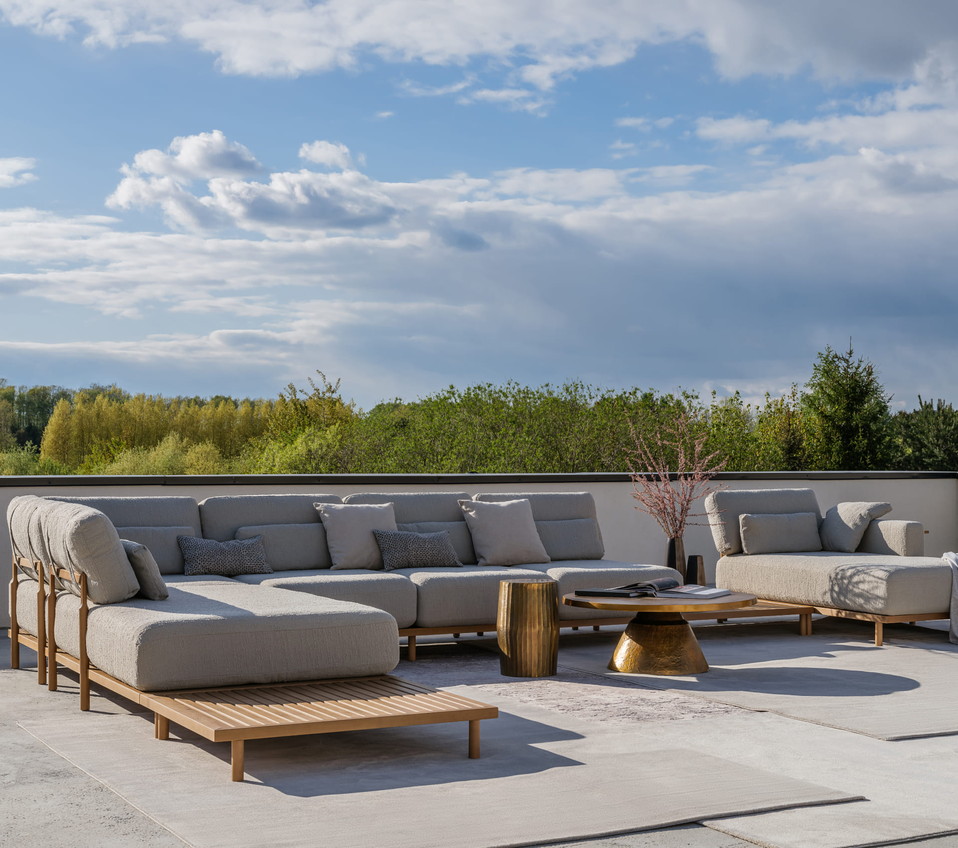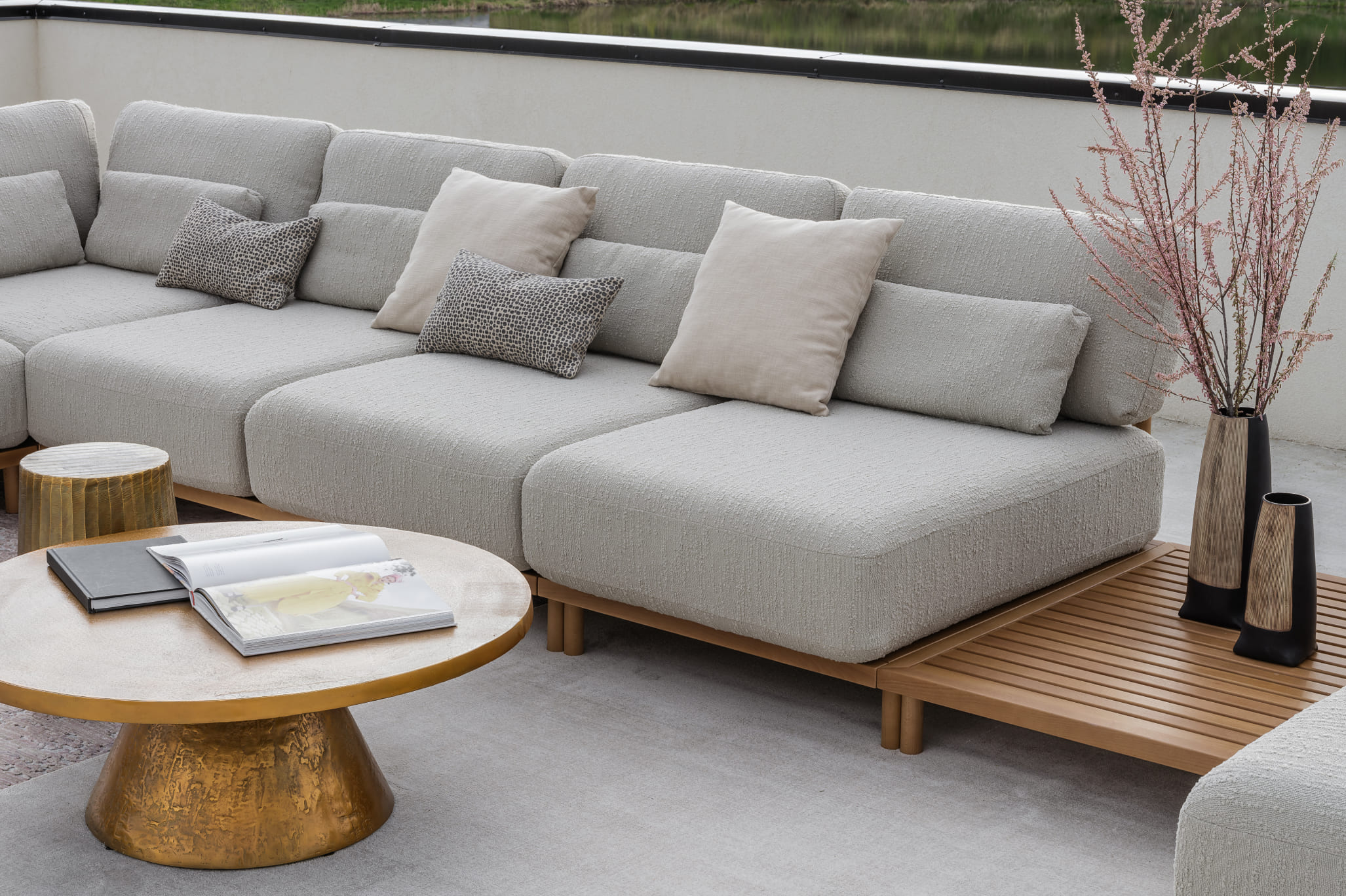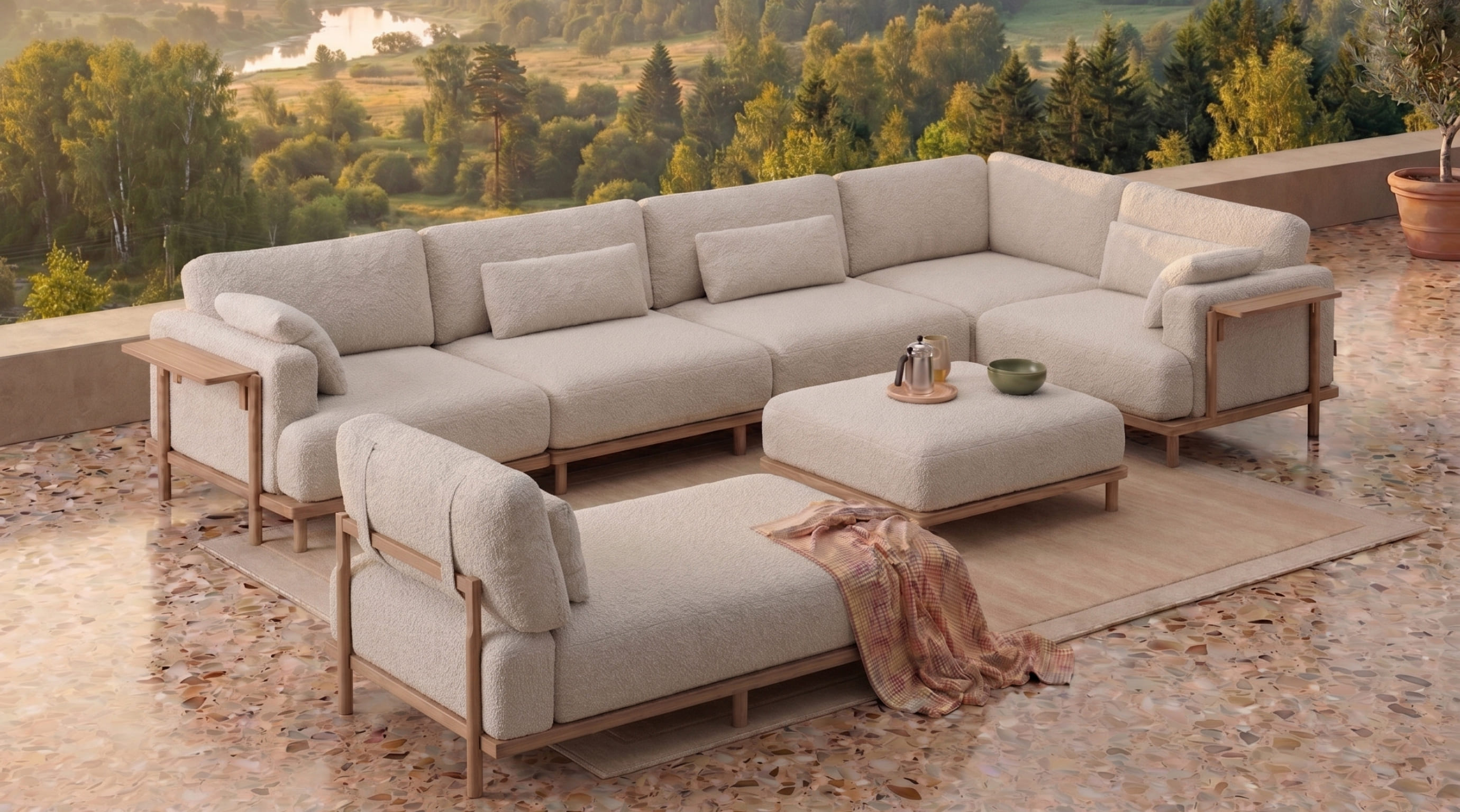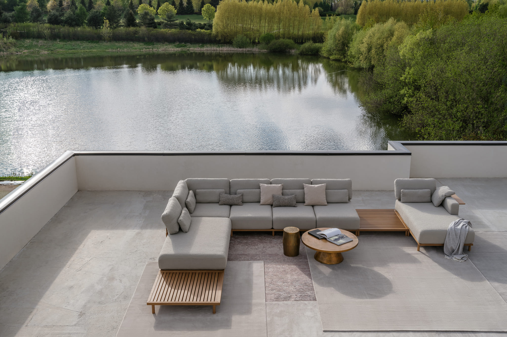 Бэйкер состоит из отдельных модулей, которые можно комбинировать под размер террасы и количество домочадцев. Одна банкетка рассчитана на комфортную посадку двух человек, а полноценная П-образная композиция легко вмещает компанию из шести-восьми гостей. При этом у каждого остаётся достаточно личного пространства — никто не сидит плечом к плечу.