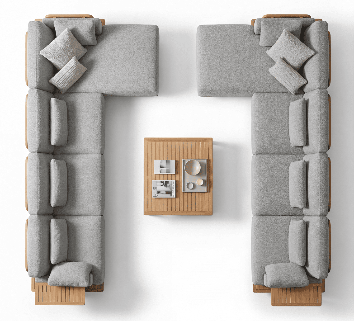 И главное: состав дивана можно менять — добавить угловой элемент, удлинить одну из сторон или разделить группу на две самостоятельные зоны. Модульная система растёт и адаптируется вместе с вашими потребностями.