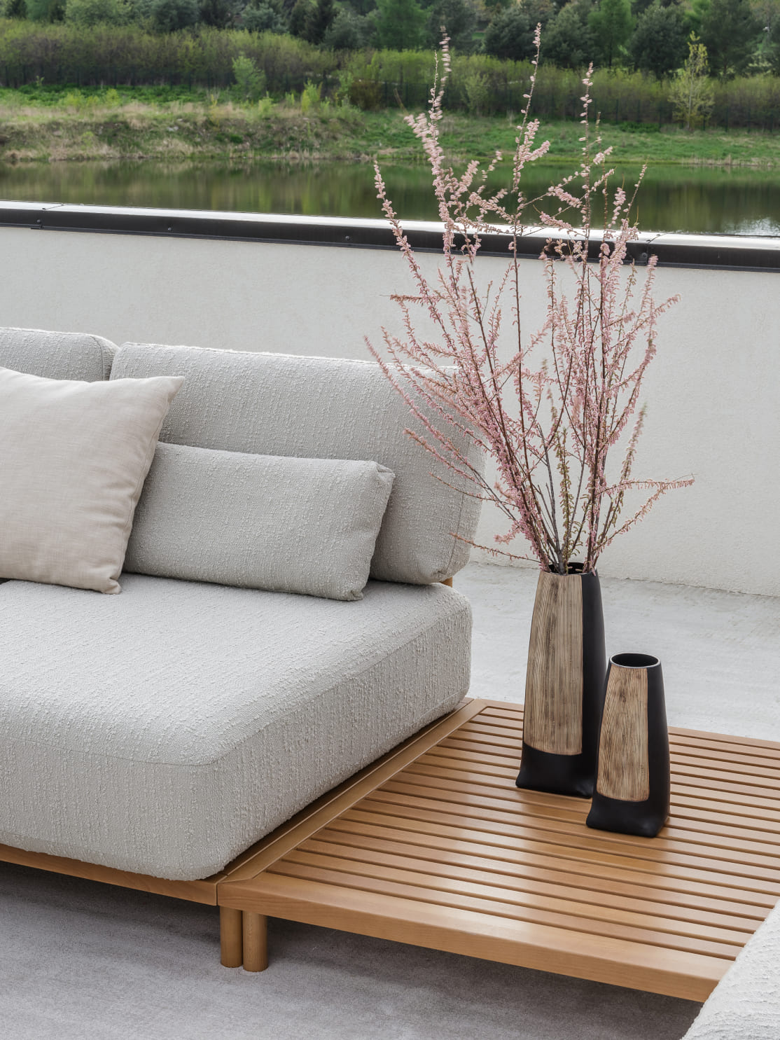 Вазу в доме с детьми безопаснее всего поставить на столик между секциями дивана. А где, как не в зоне отдыха на террасе, ставить свежие цветы и зажигать свечи после заката?