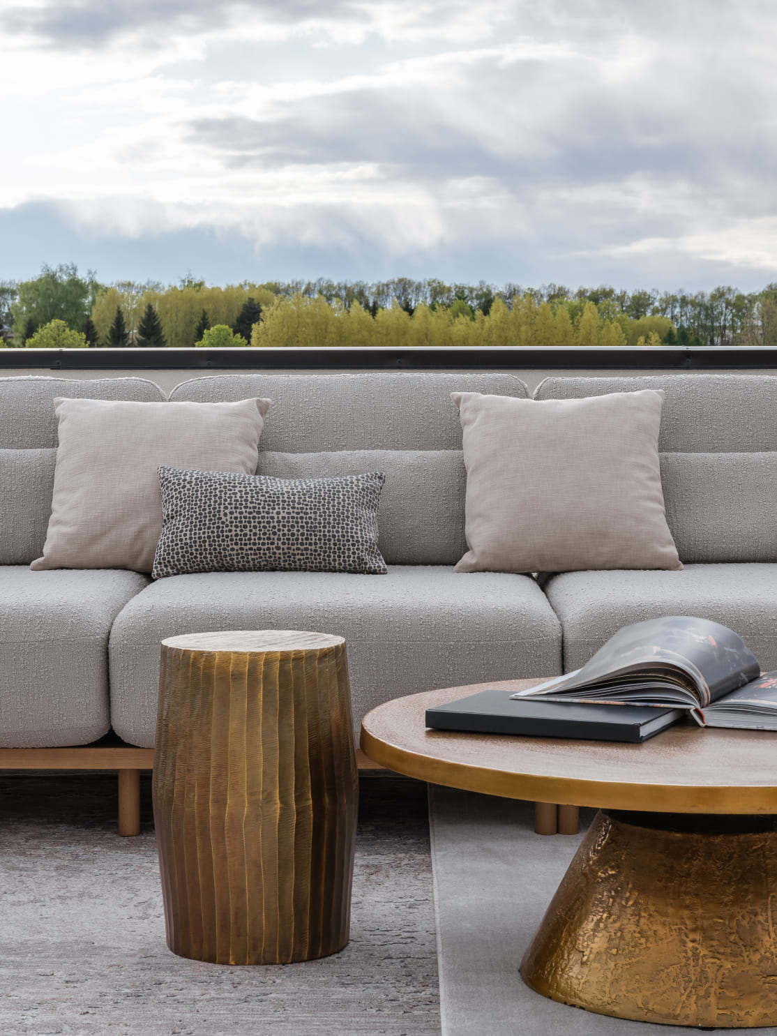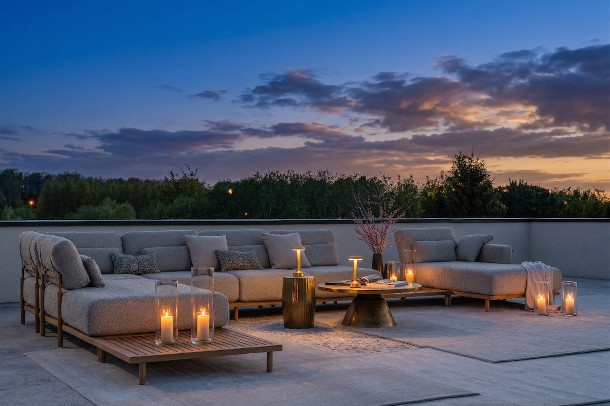 Если вы предпочитаете более цельную композицию, попробуйте вариант с длинным линейным диваном и лёгким углом из пары модулей, а напротив по диагонали поставьте оттоманку или дополнительные секции. Кресла в таком случае лучше вынести за пределы уличной гостиной — например, в зону барбекю или к обеденному столу.