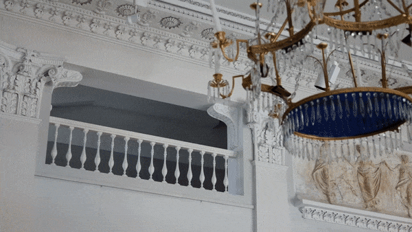 Парадные залы, выполненные в начале XIX века в стиле неоклассицизм, сохранили свой первоначальный облик. Научный подход к реставрации позволил восстановить оригинальные гипсовые рельефы, печные изразцы, подлинную лепнину, а также колонны и пилястры, оформленные по моде того времени – штукатуркой, имитирующей поверхность узорного мрамора.