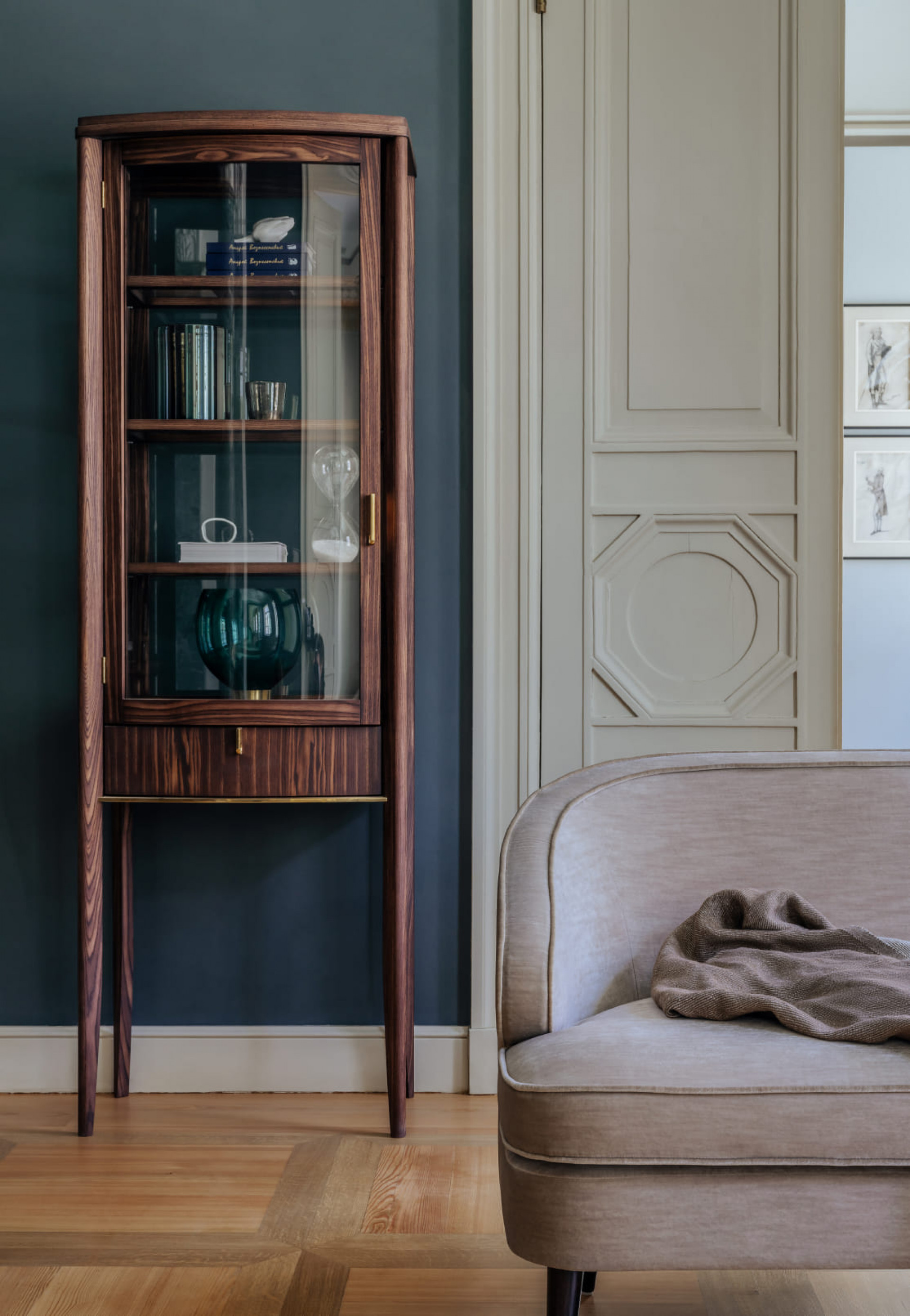 Этот проект – ещё одно подтверждение того, что торжественная классическая архитектура прекрасно работает с предметами мебели в разных стилях. Так, бальный зал с полуротондой преобразился в комфортную современную гостиную с помощью лаконичного дивана Бэйкер по дизайну Марии Пустоваловой. В пару к нему мы подобрали витрину и консоль Bridge, тёмная древесина которых перекликается с контрастным каркасом дивана.