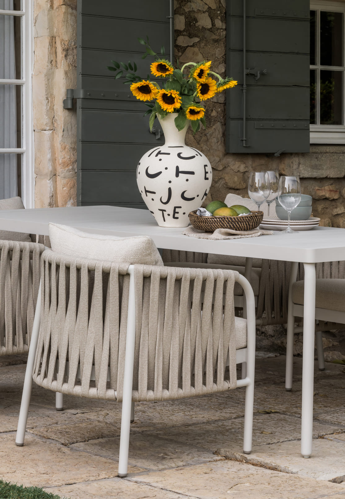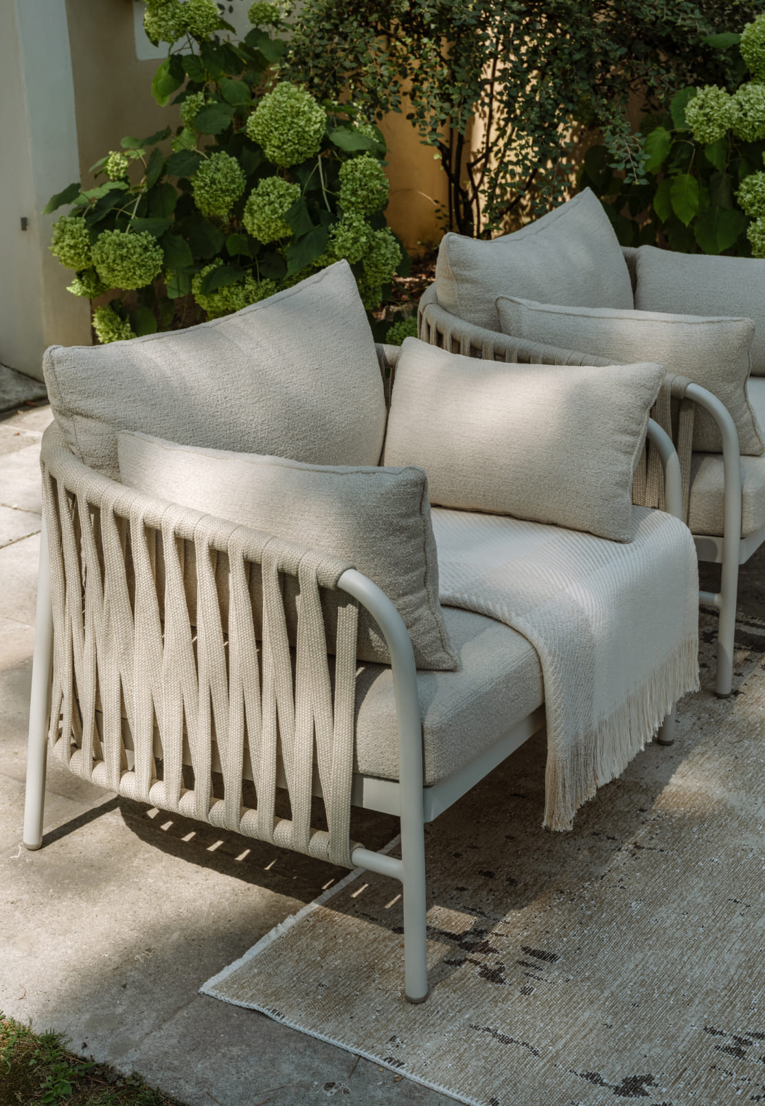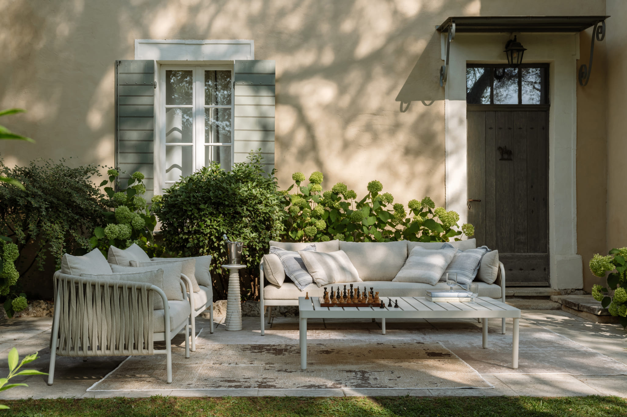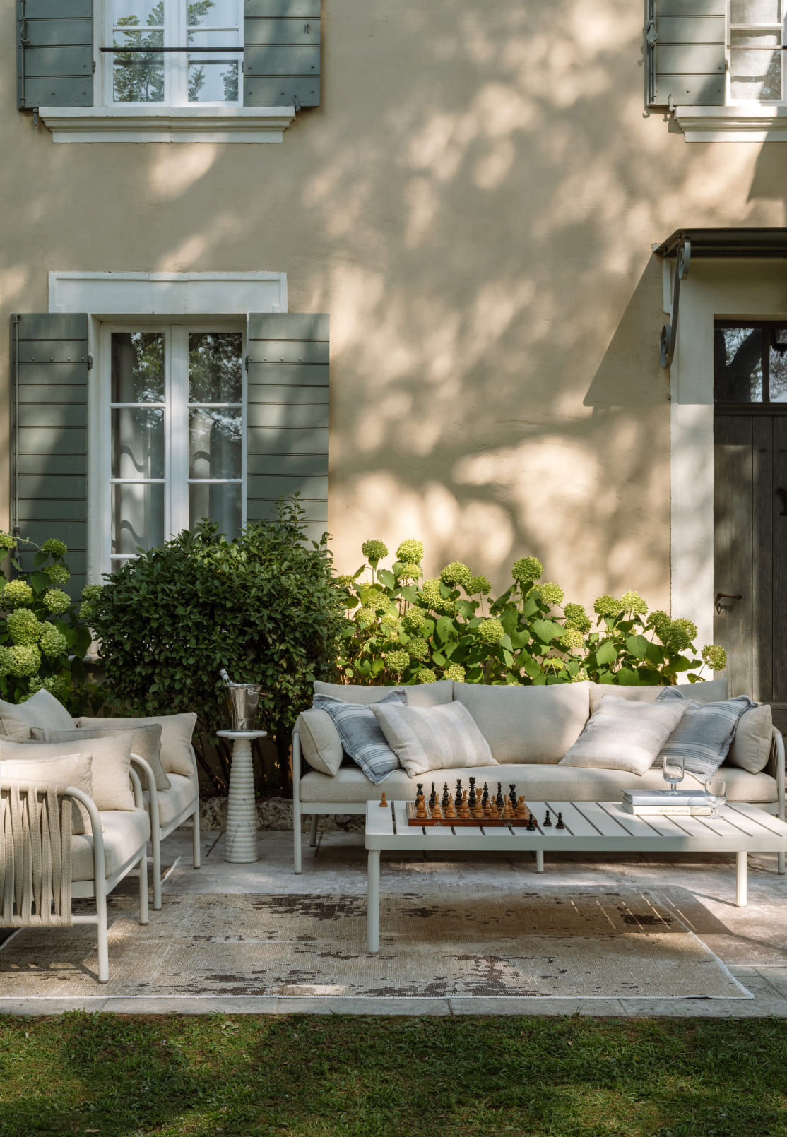 Новинка развивает идею плавного перехода от интерьера к экстерьеру, но решает её иначе. Если зелёная Таормина перекликалась с палитрой растительности, то здесь каркас и обивка выдержаны в единой монохромной гамме. Нейтральный колорит деликатно рифмуется со светлым камнем, фактурной штукатуркой или состаренным деревом.