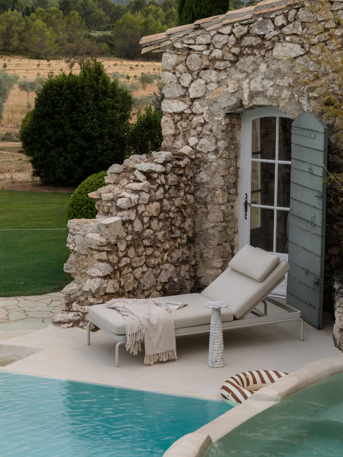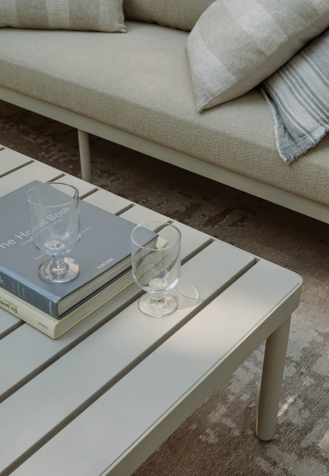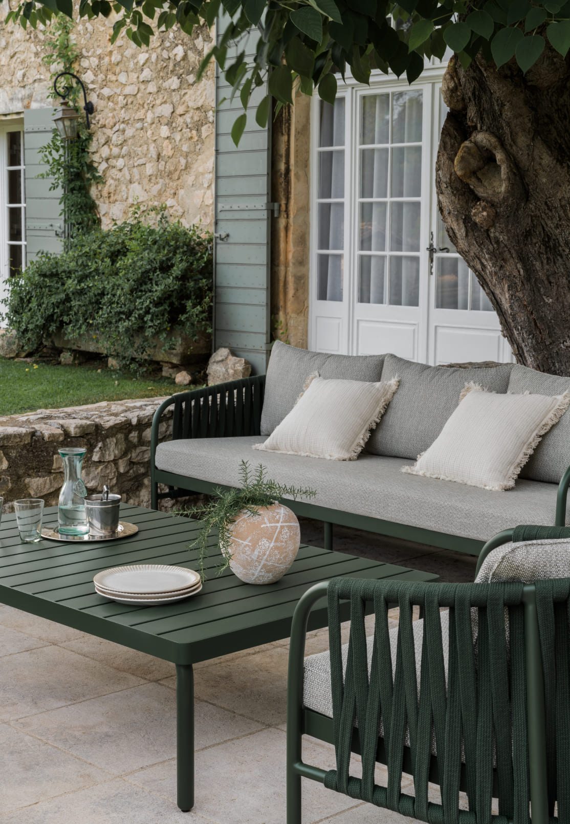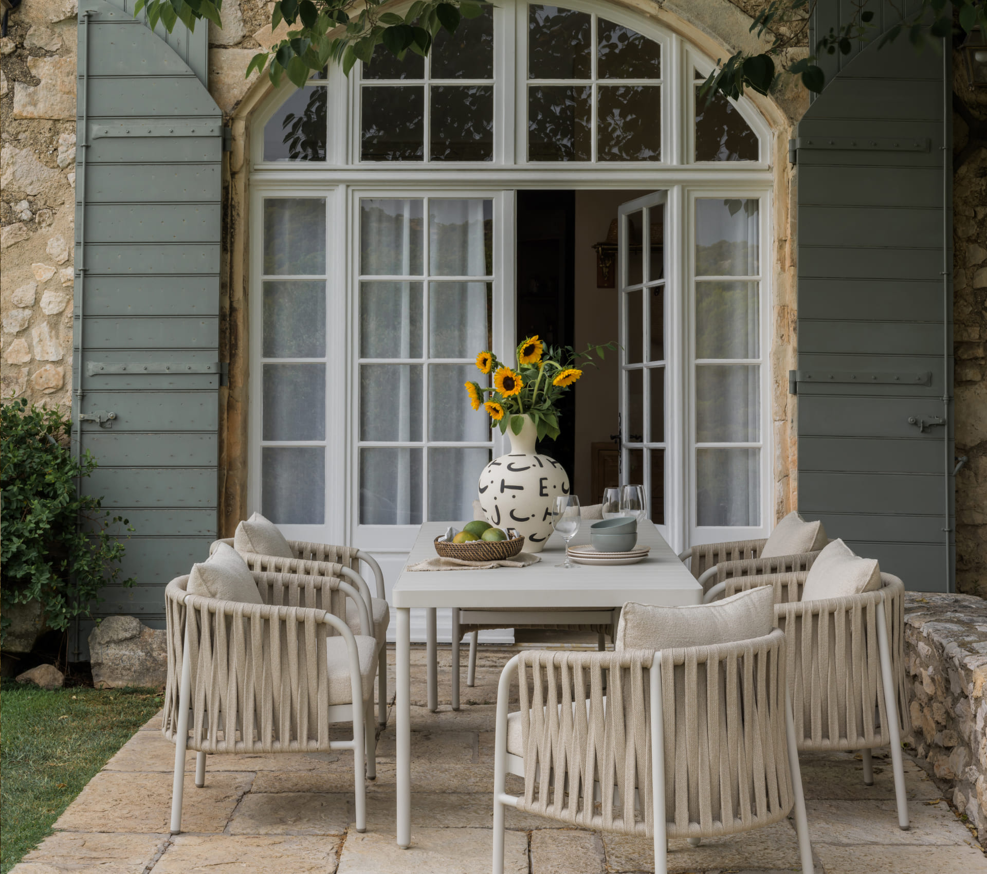 Новинка развивает идею плавного перехода от интерьера к экстерьеру, но решает её иначе. Если зелёная Таормина перекликалась с палитрой растительности, то здесь каркас и обивка выдержаны в единой монохромной гамме. Нейтральный колорит деликатно рифмуется со светлым камнем, фактурной штукатуркой или состаренным деревом.