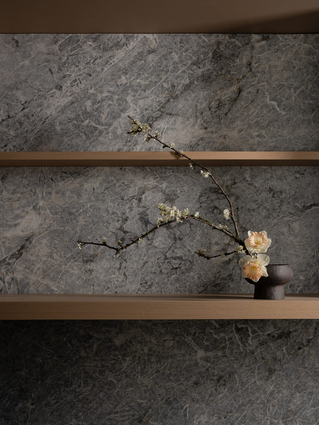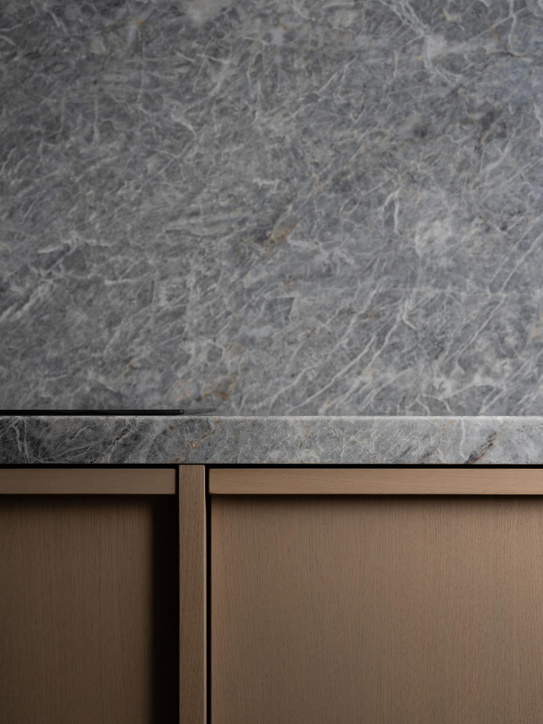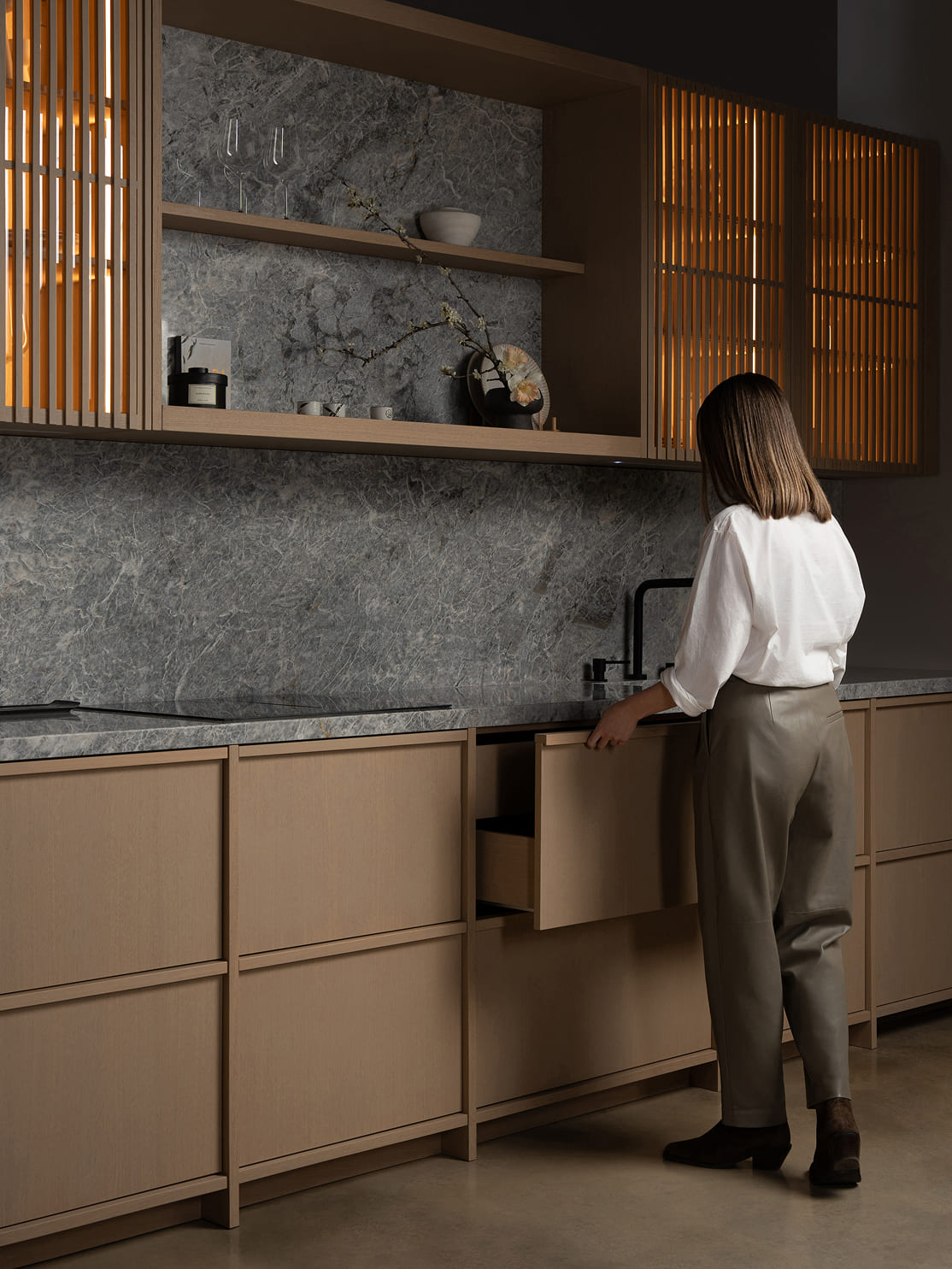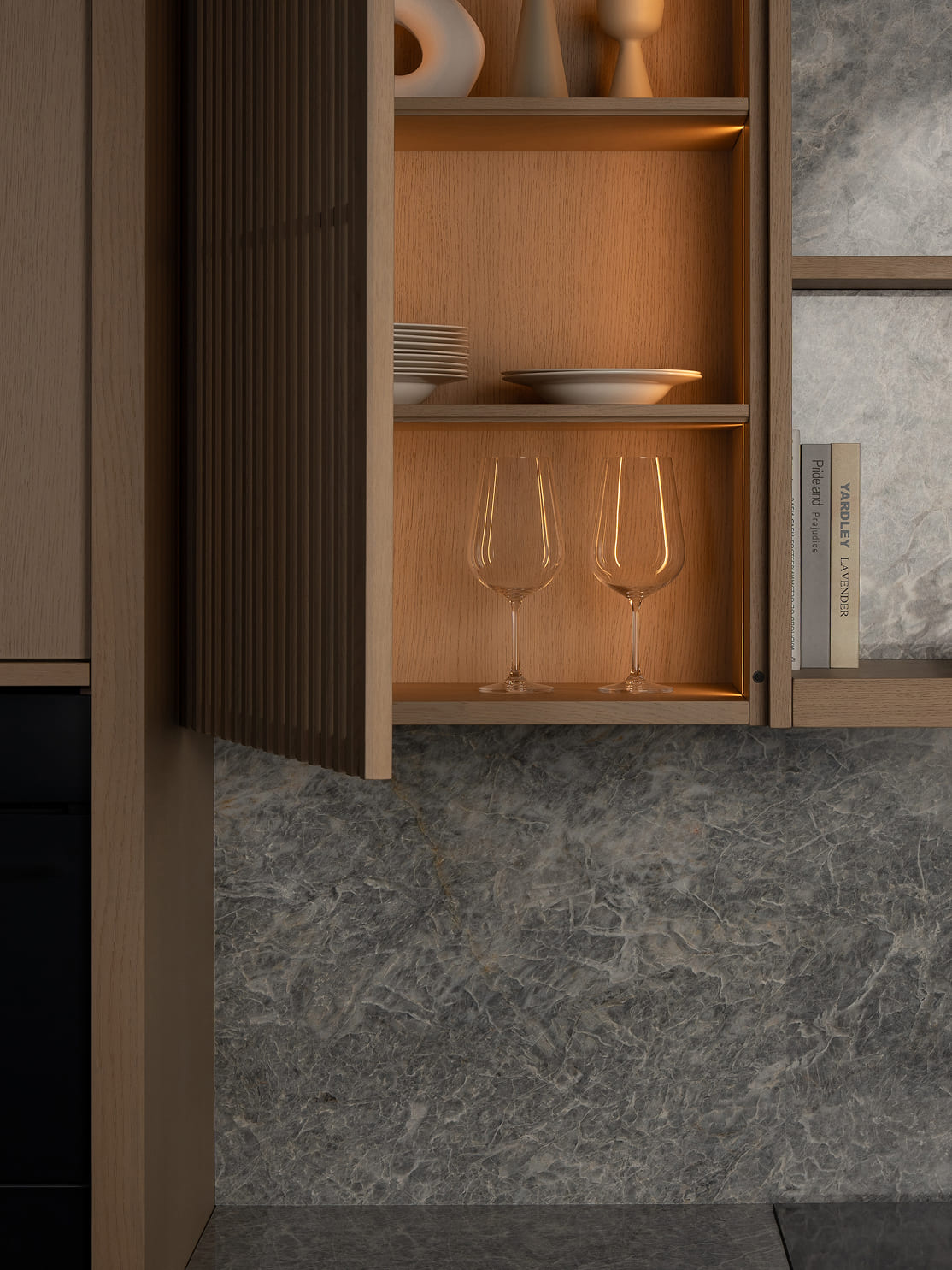 Подсветка встроена вертикально и направлена вглубь — она не ослепляет, а создаёт интимность и делает явным скрытое внутри. Интегрированные ручки из массива дуба, облегчённые полки с фрезеровкой, филигранные стыки и безупречный баланс — всё это формирует тактильную архитектуру.