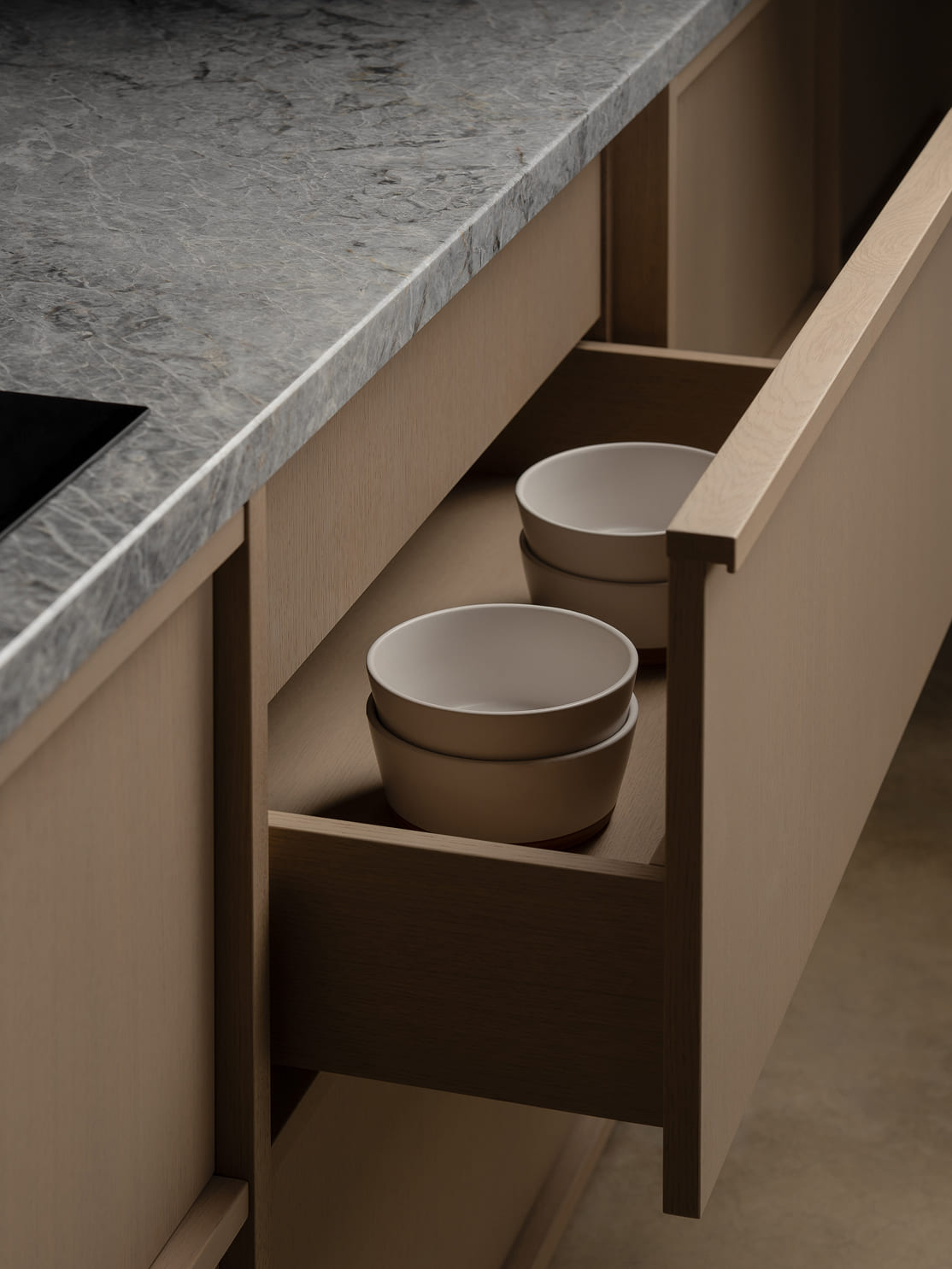 Ящики у Yumi полностью выполнены из шпона дуба — это абсолютная новинка для Dantone Kitchen. Немецкие направляющие Hettich и итальянские скрытые петли SALICE AIR задают мягкость хода системам хранения.