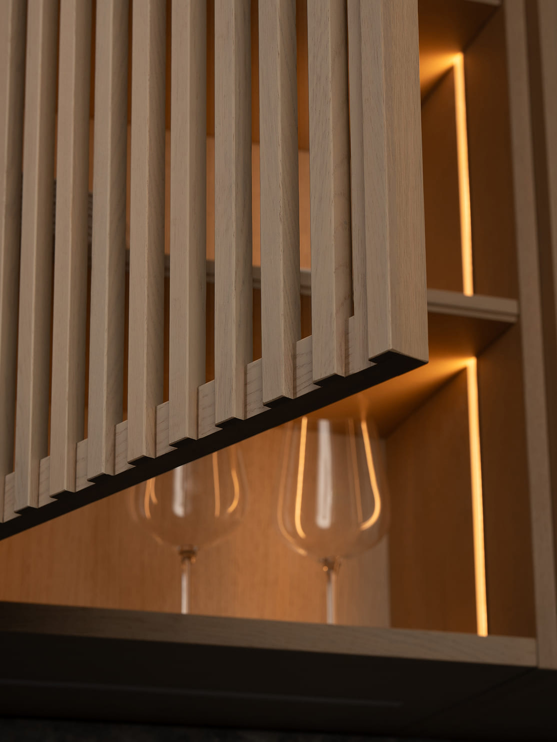 В приглушённом вечернем освещении подсветка в шкафах создаёт эффект тёплого свечения, струящегося сквозь стеклянные фасады с дубовыми рейками.