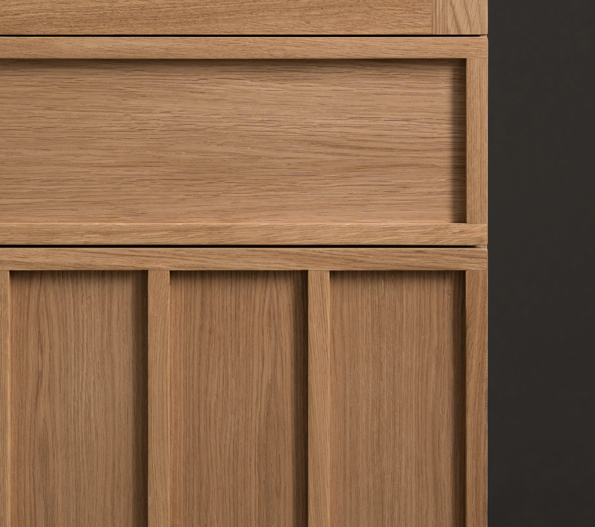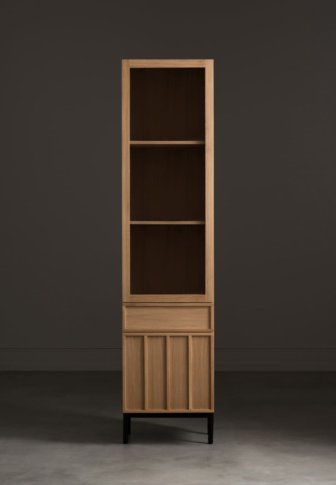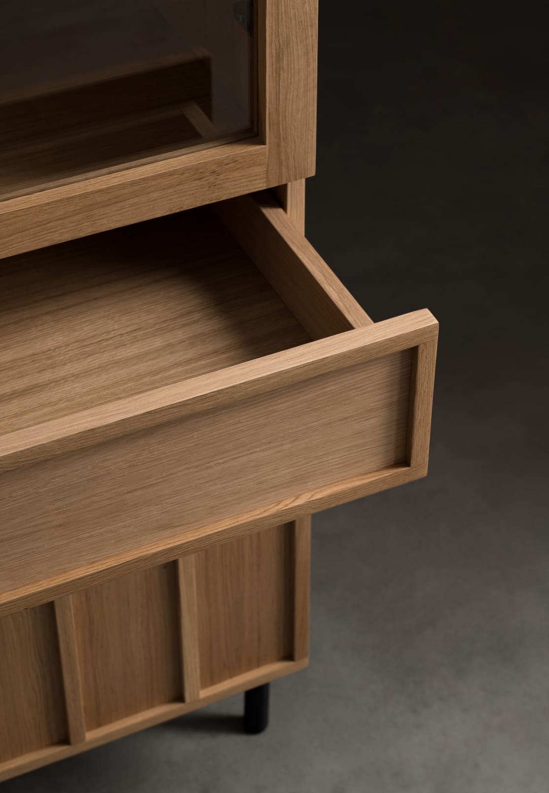 Оптимальна для заполнения узких простенков, создания симметрии по бокам окна или в качестве буфета в компактной обеденной зоне. Её вытянутый силуэт зрительно увеличивает высоту потолков, демонстрируя способность коллекции работать с пространством.