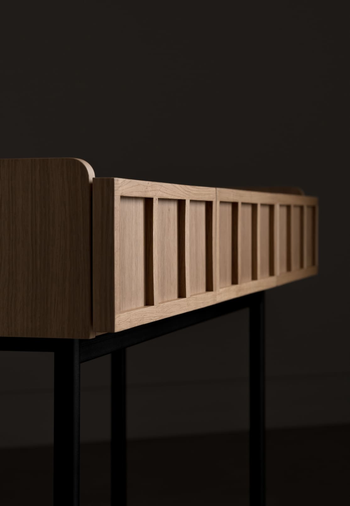 В духе Баухауса коллекция основана на функциональности, пропорциях и выразительности конструкции как эстетического элемента. Металлический каркас — не скрытый, а подчёркнутый: он несёт нагрузку и визуально организует композицию. Деревянные панели, повторяющие ритмическую структуру фасадов, создают игру света и тени, перекликаясь с орнаментом модернистских зданий: дома-мастерской Вальтера Гропиуса в Дессау, фабрики Фагуса в Альфельде, Вайсенхоф.