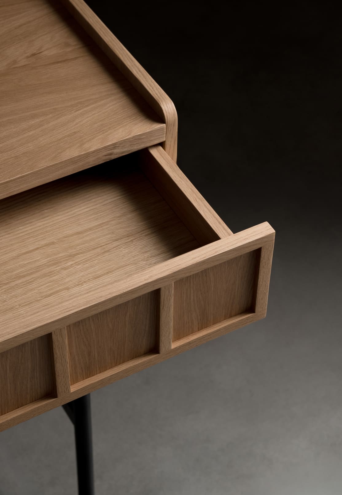 «Box родилась из стремления соединить чистоту конструктивных форм с теплотой природных материалов. Основная идея — переосмысление принципов Баухауса в контексте предметного дизайна. Конструкция из чёрного металла отсылает к индустриальной честности и структурной ясности, тогда как массив дуба добавляет человеческое измерение — тепло, тактильность, естественность.