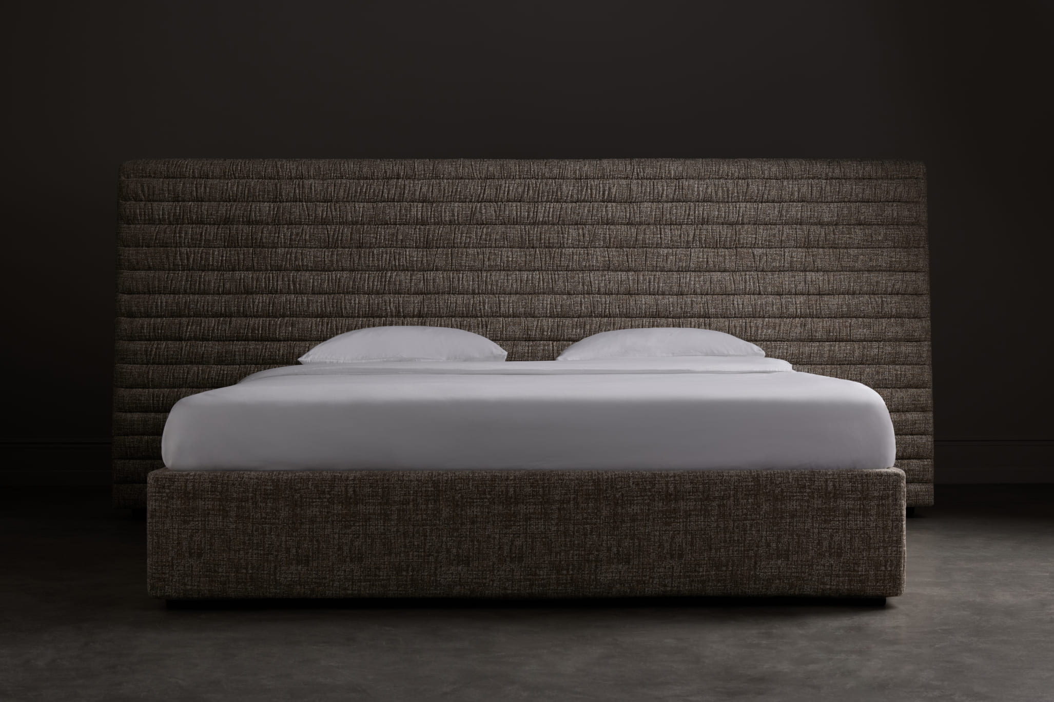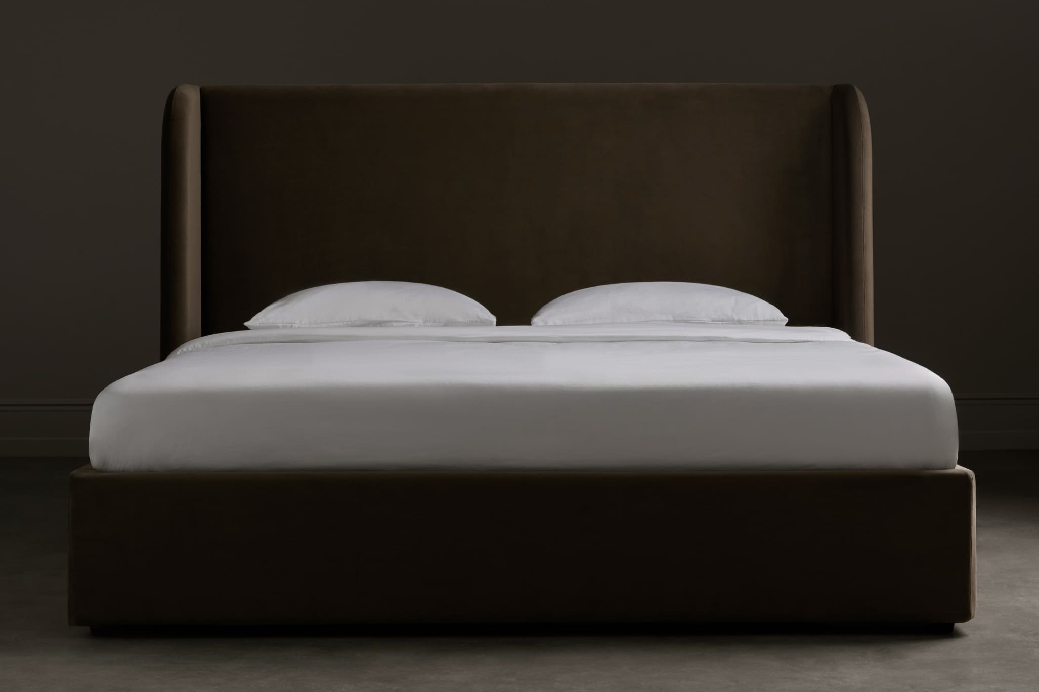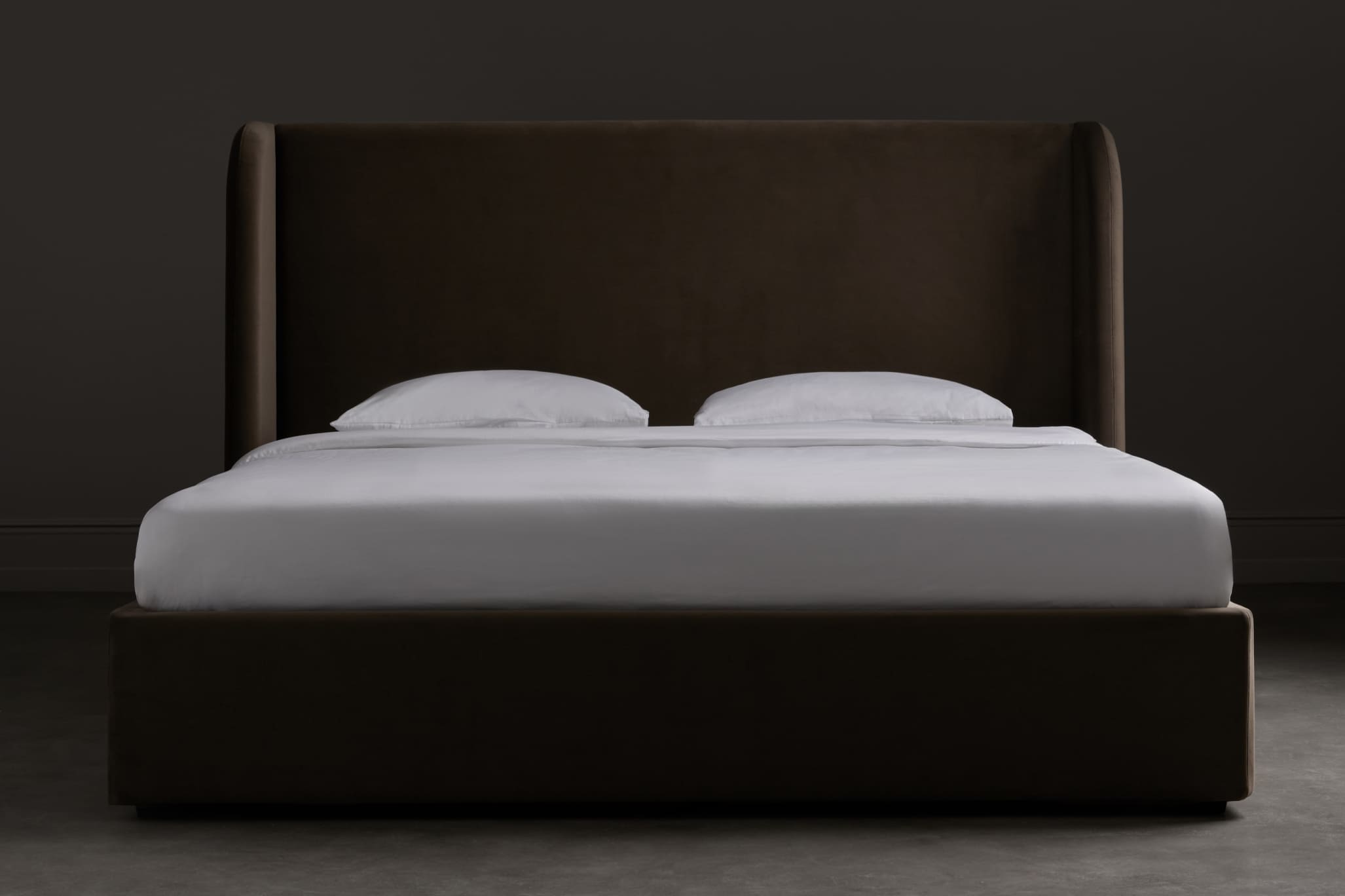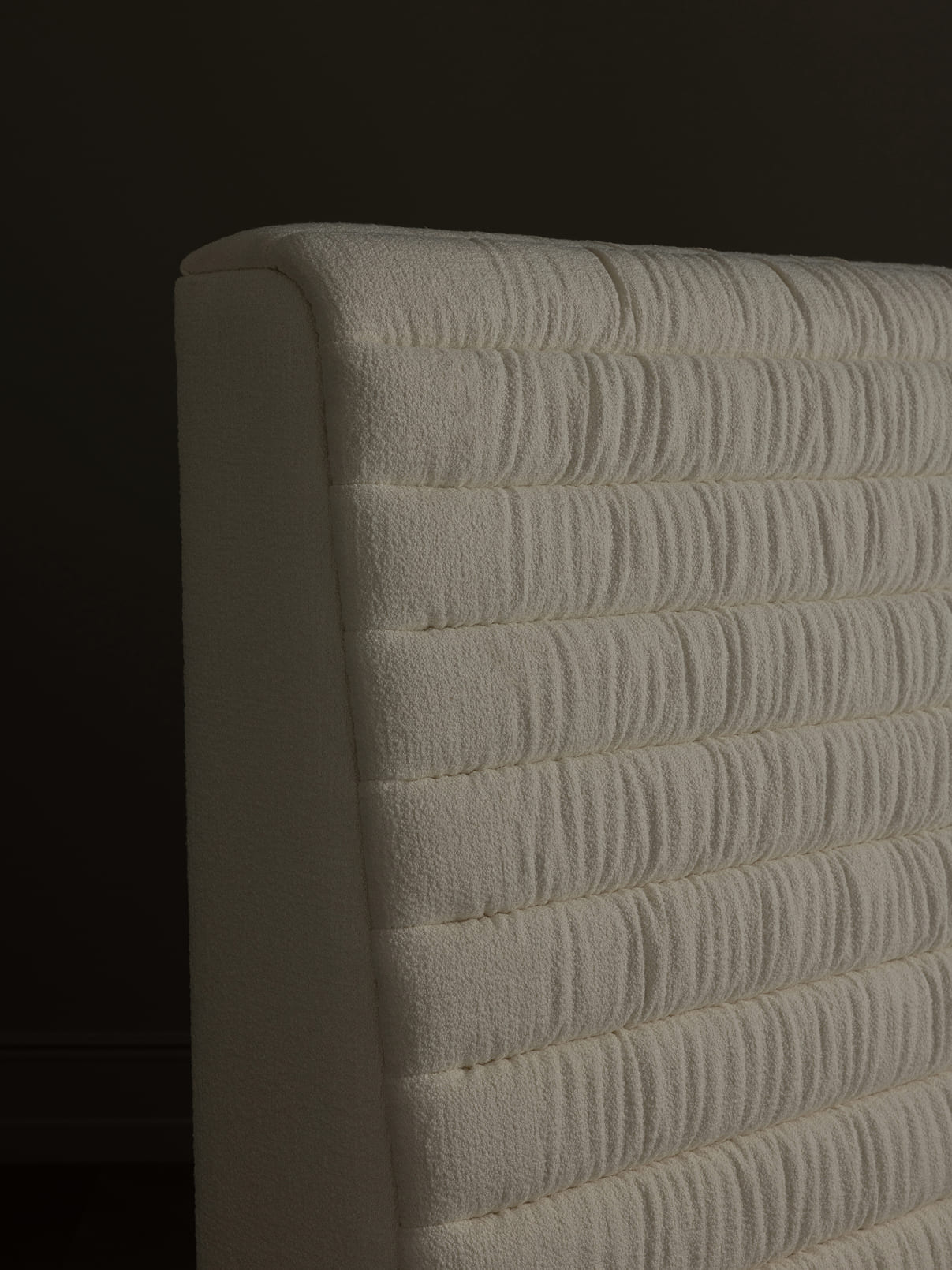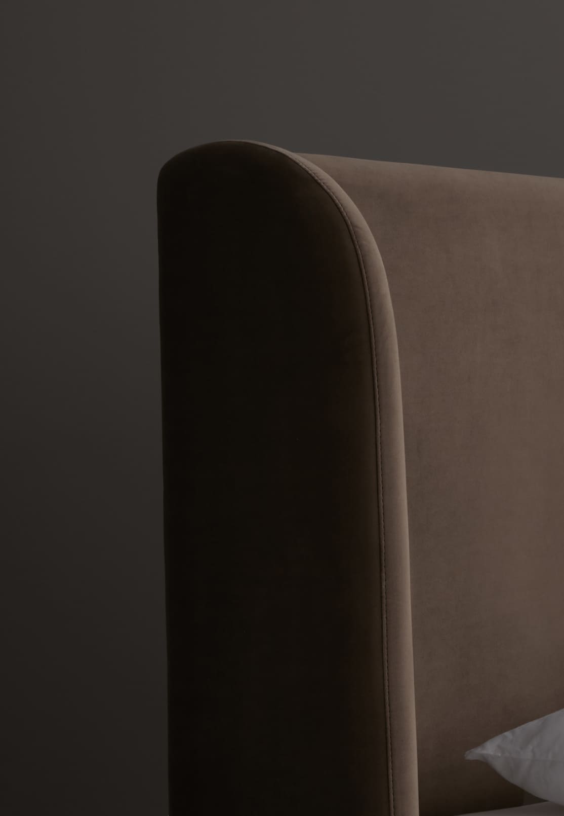 Эта модель переосмысливает классическую типологию wingback chair в спальне, превращая кровать в остров абсолютного спокойствия. Высокое изголовье обтекаемой формы завершается вогнутыми «ушками». Они мягко очерчивают личное пространство для сна, транслируя ощущение защищённости и отстранённости от внешней суеты.